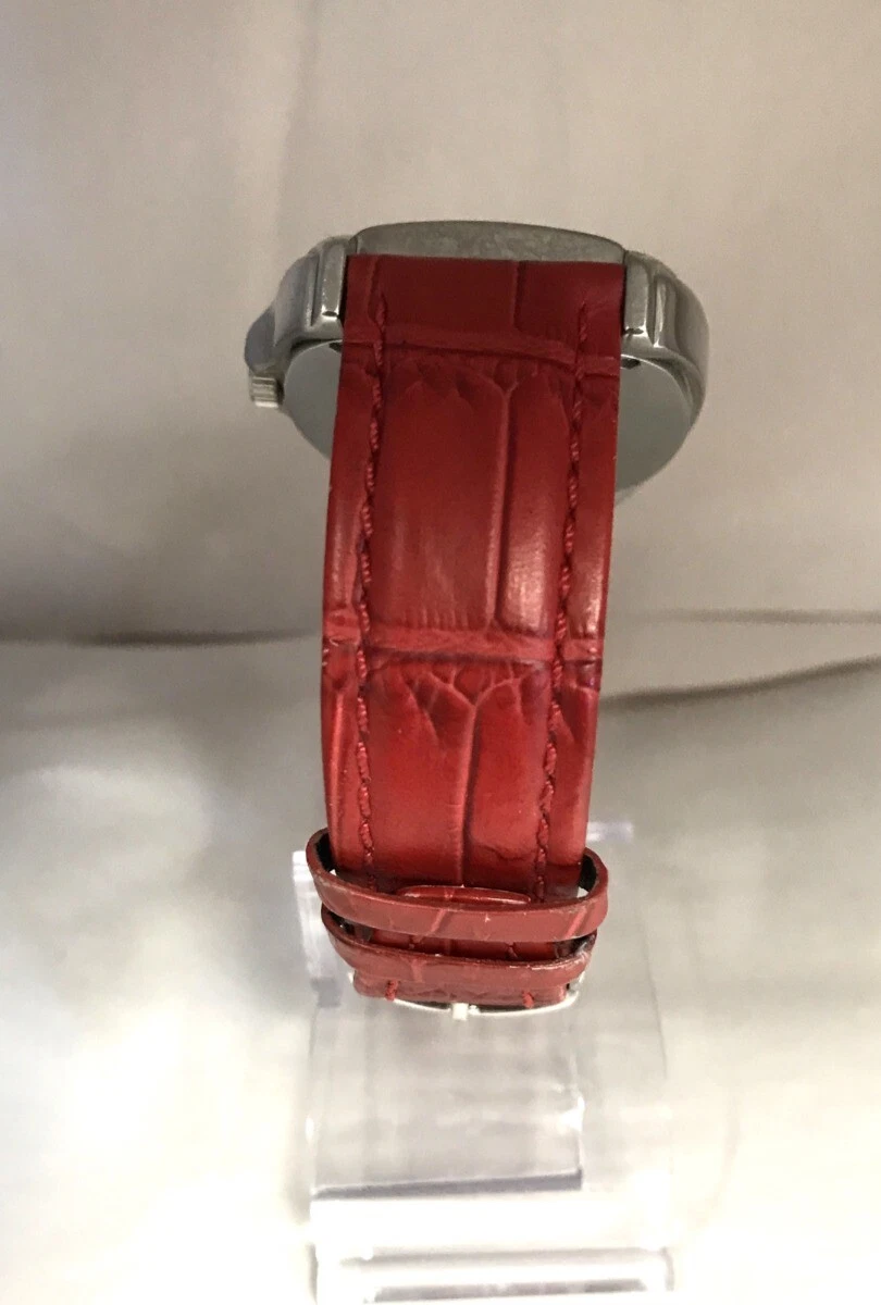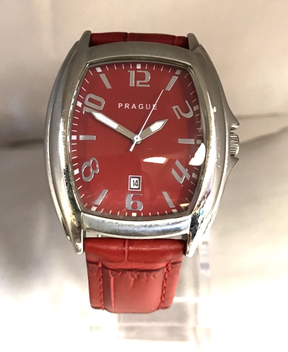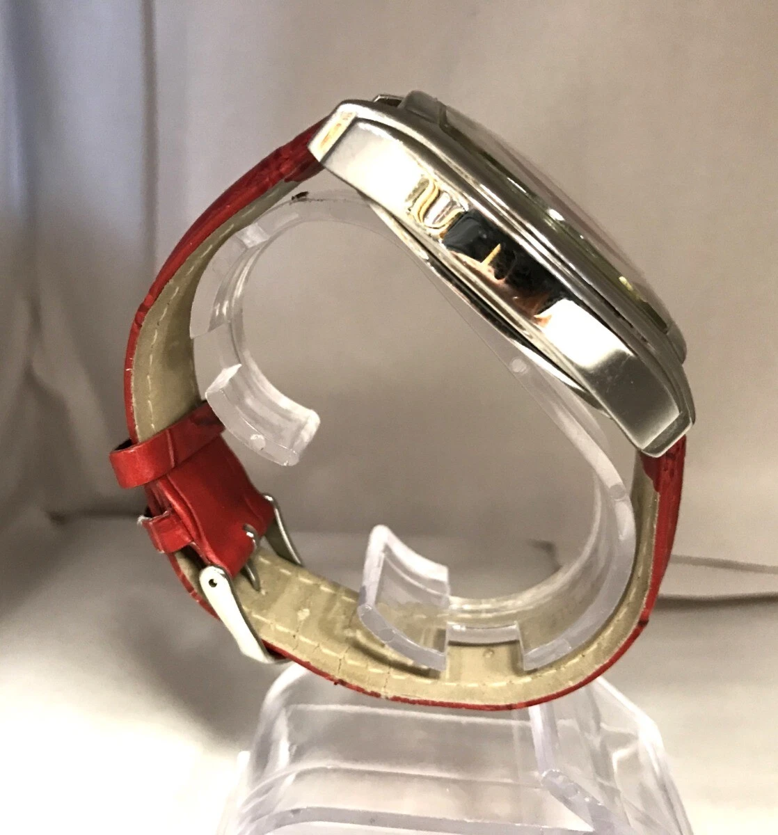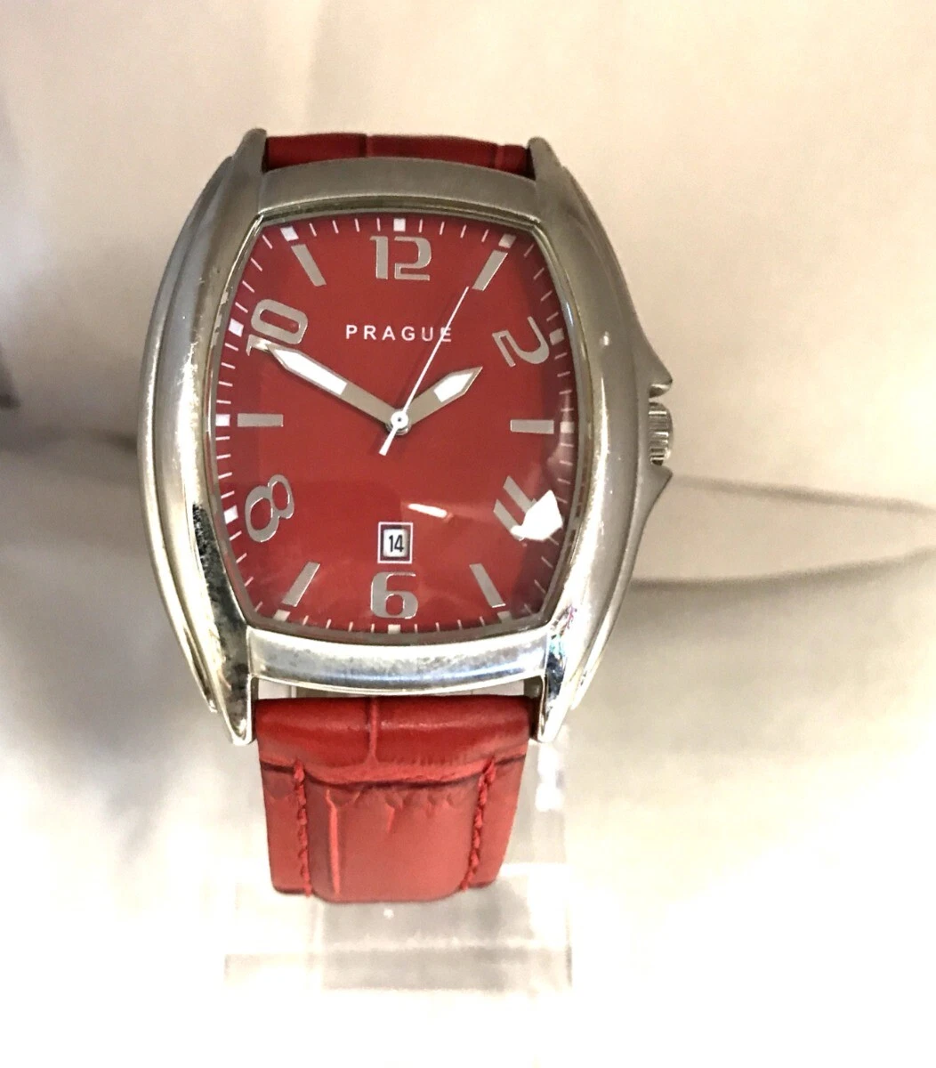 Prague Woman's Silver Tone Red Dial Red Leather Band 50M Date Watch 41mm x 43mm