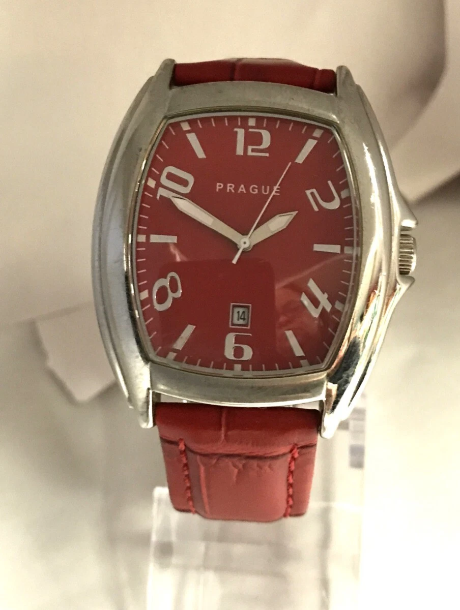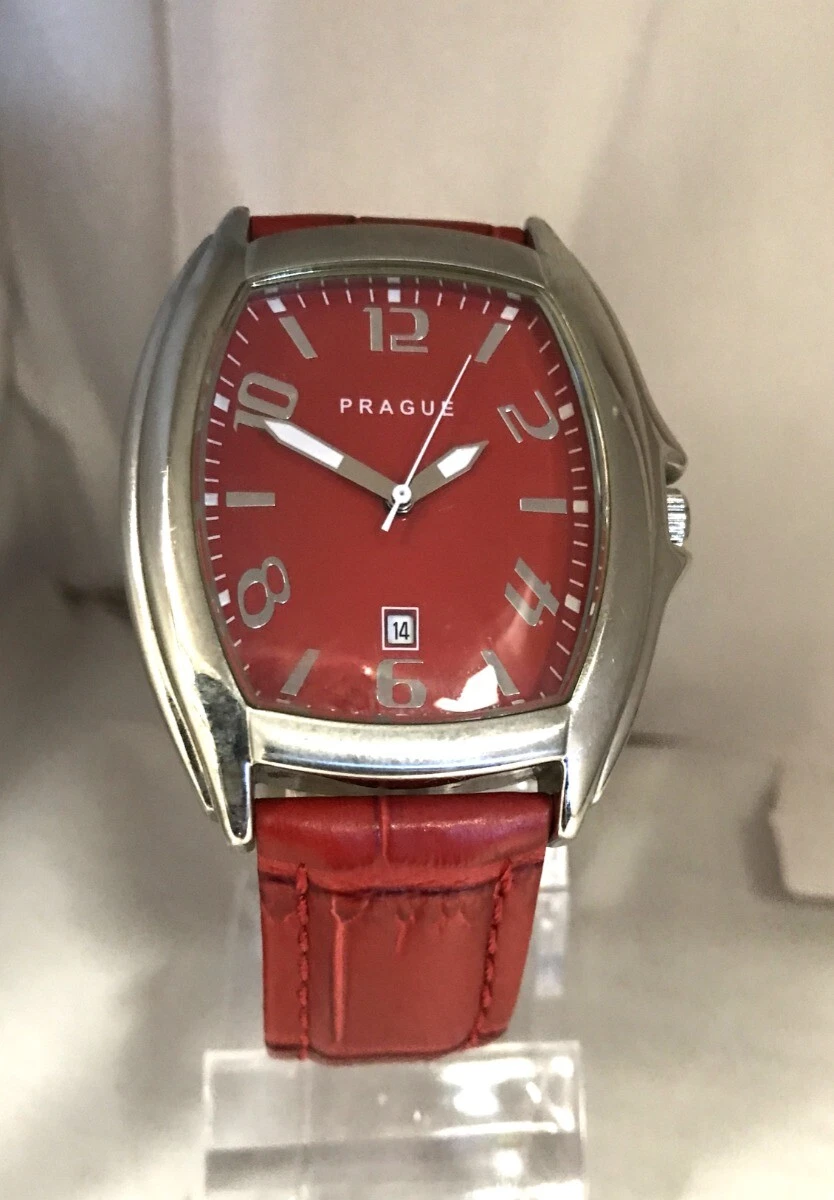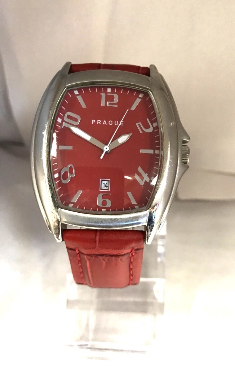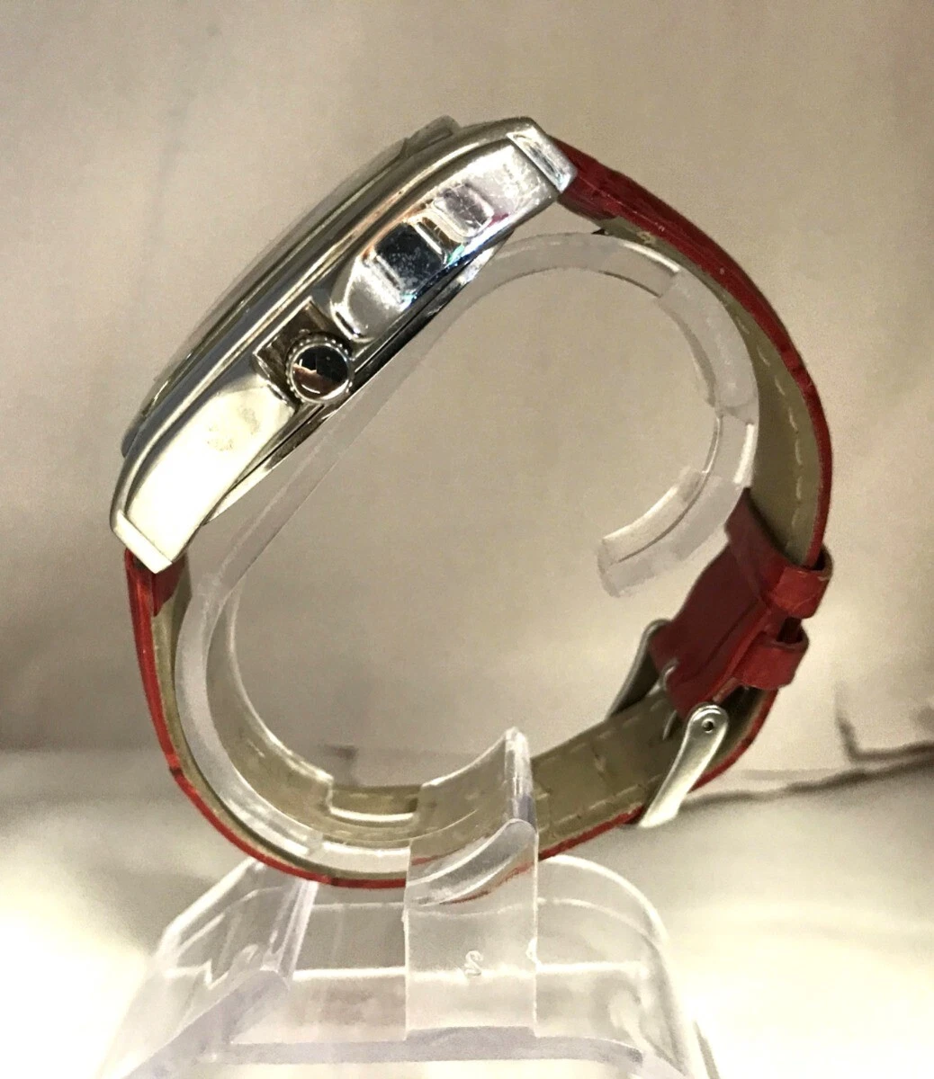 Prague Woman's Silver Tone Red Dial Red Leather Band 50M Date Watch 41mm x 43mm
