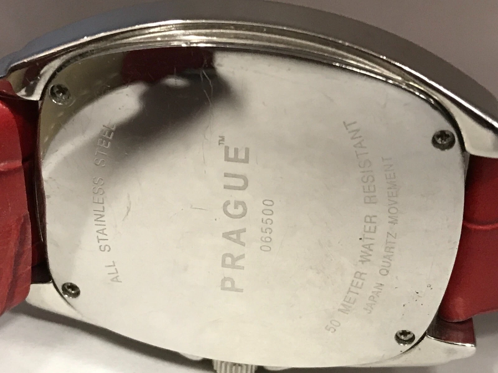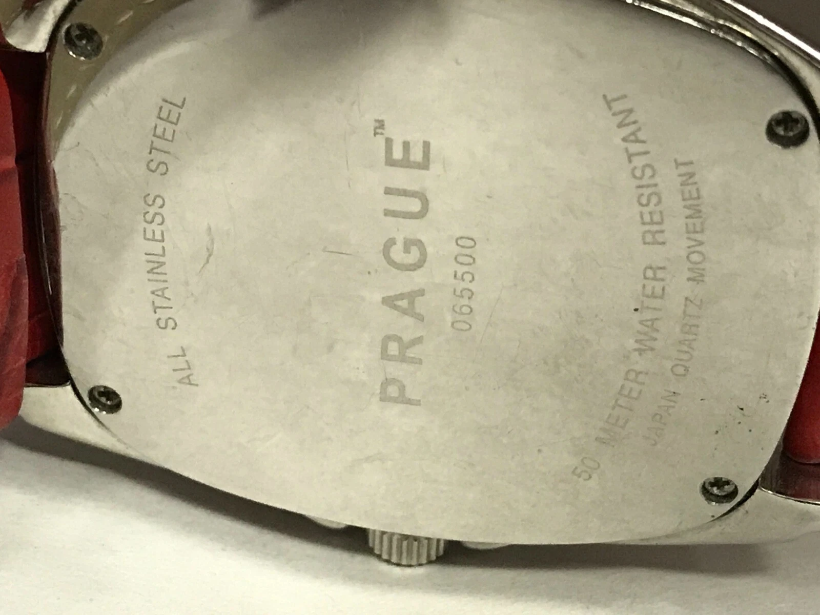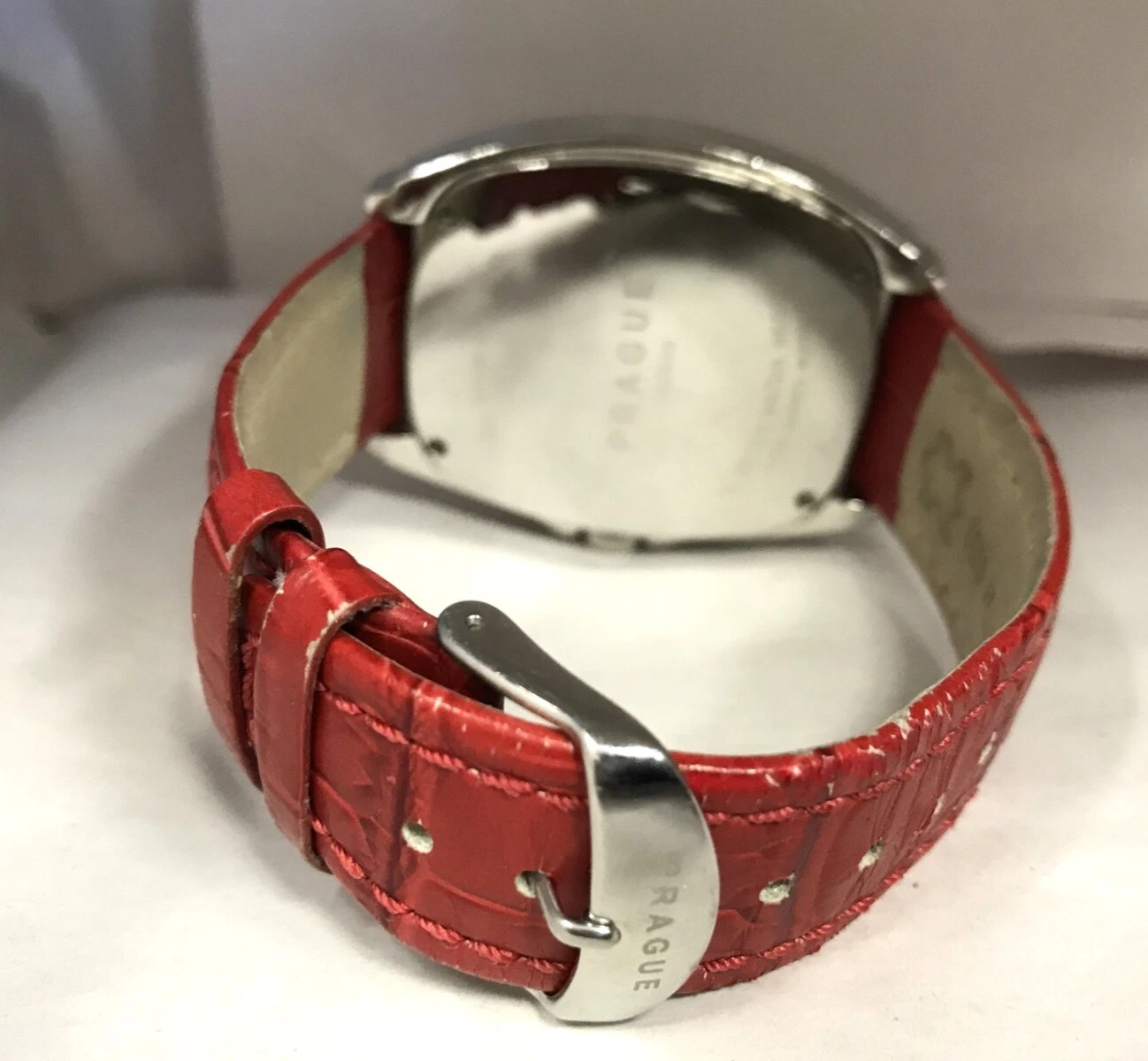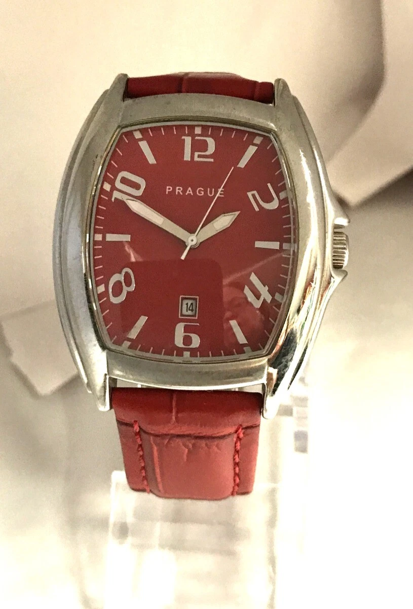 Prague Woman's Silver Tone Red Dial Red Leather Band 50M Date Watch 41mm x 43mm