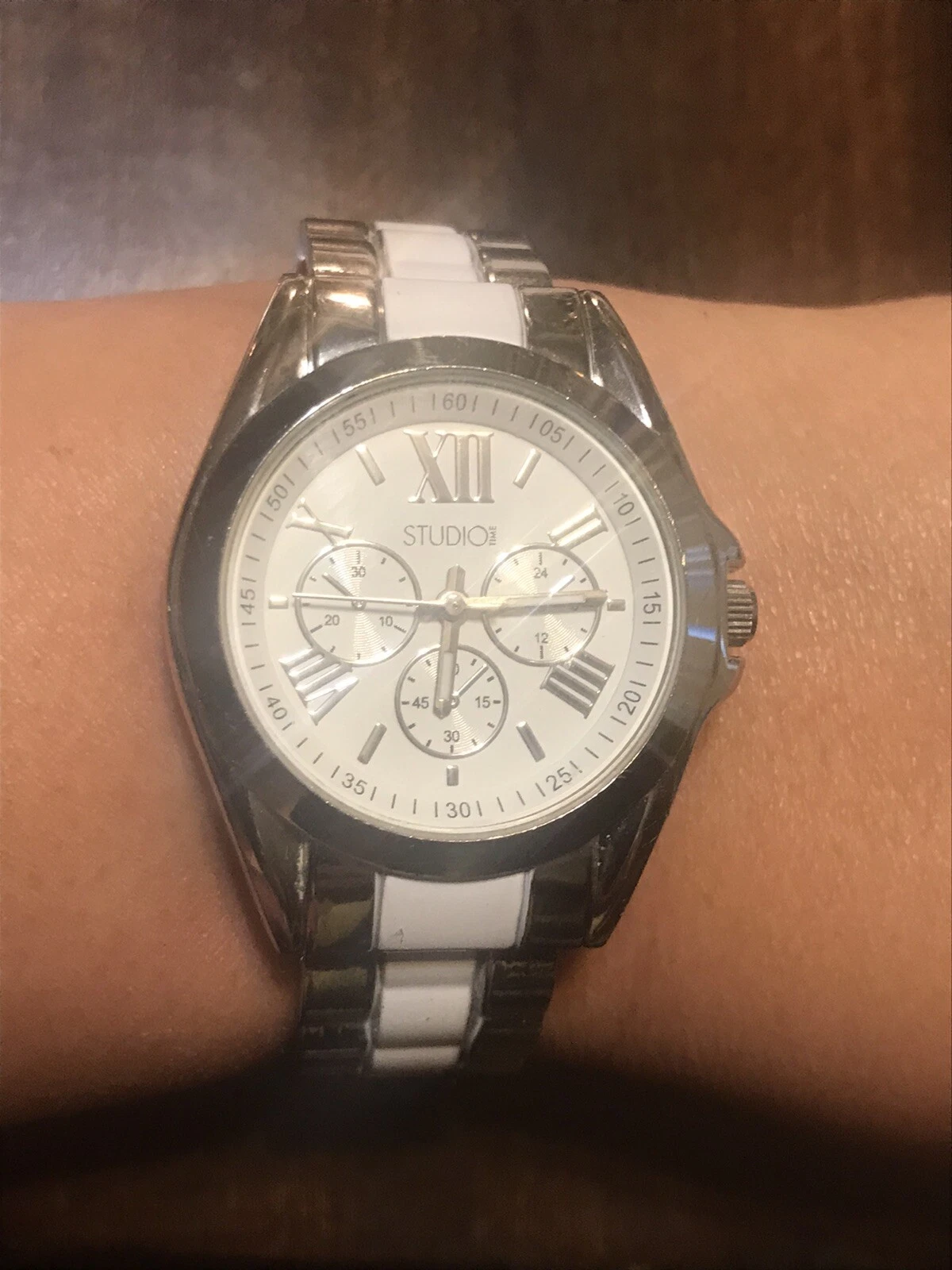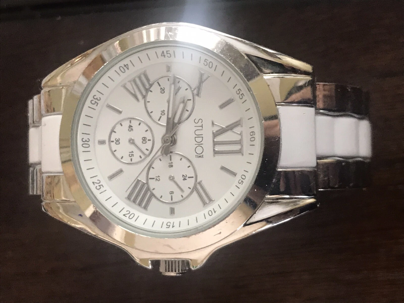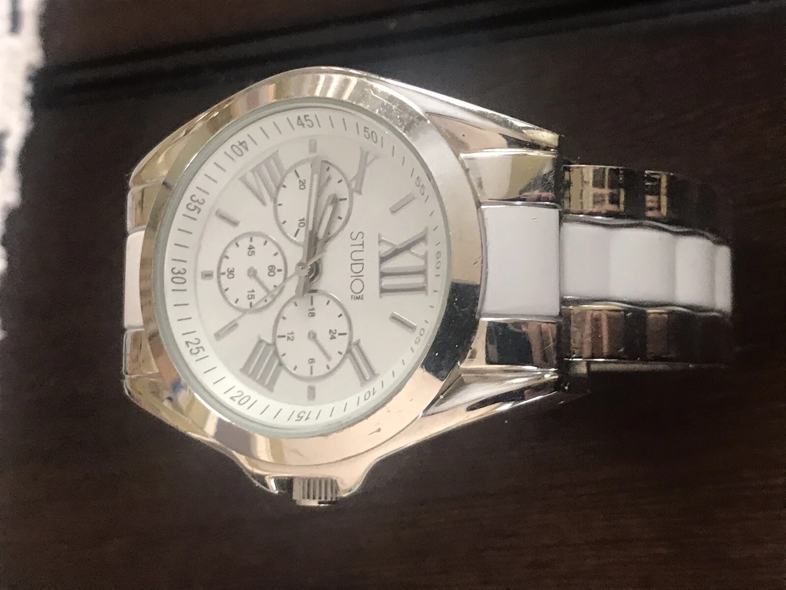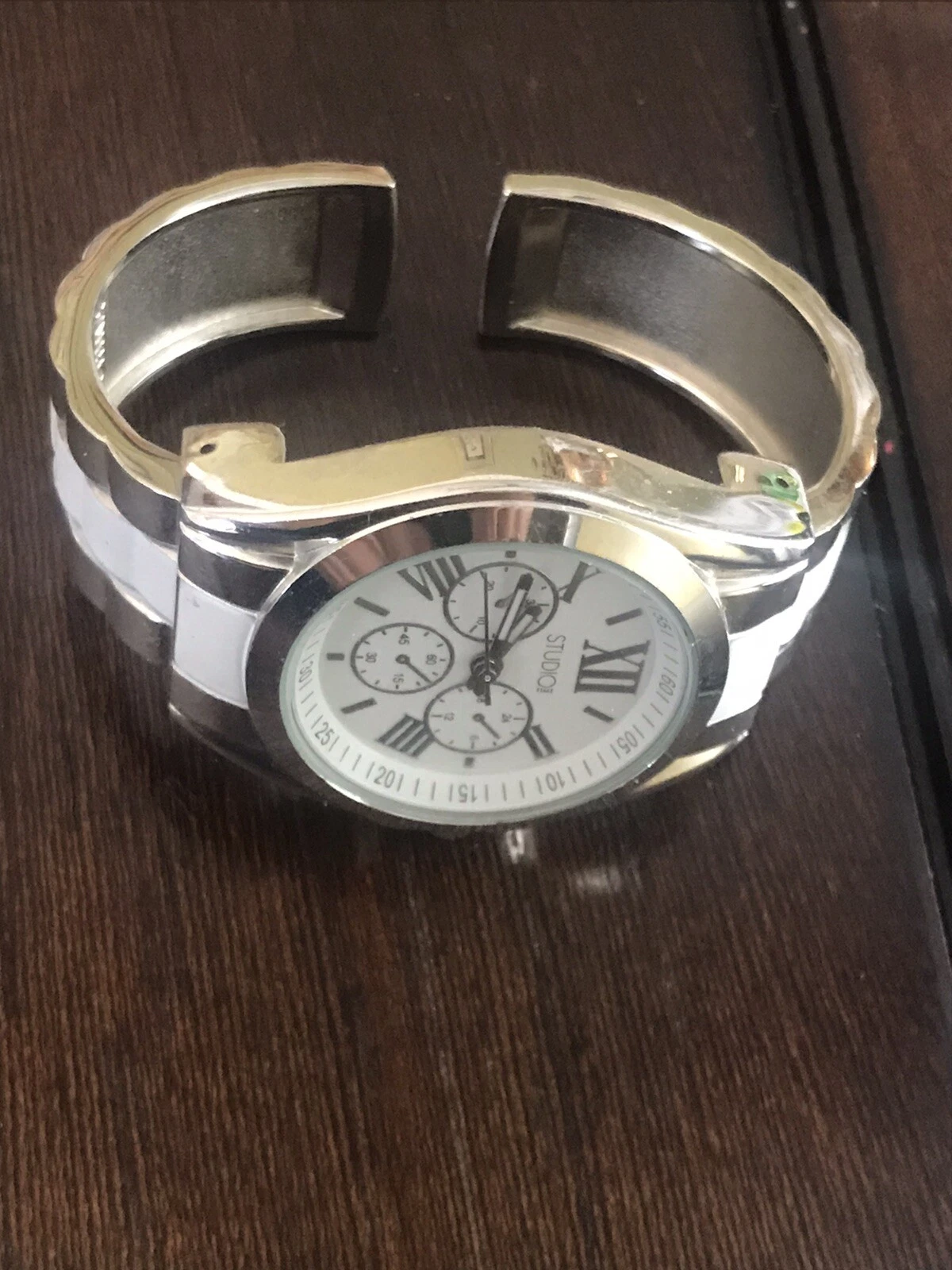 STUDIO WOMENS SILVERTONE FILIGREE CUFF WATCH White Singapore Movement’s