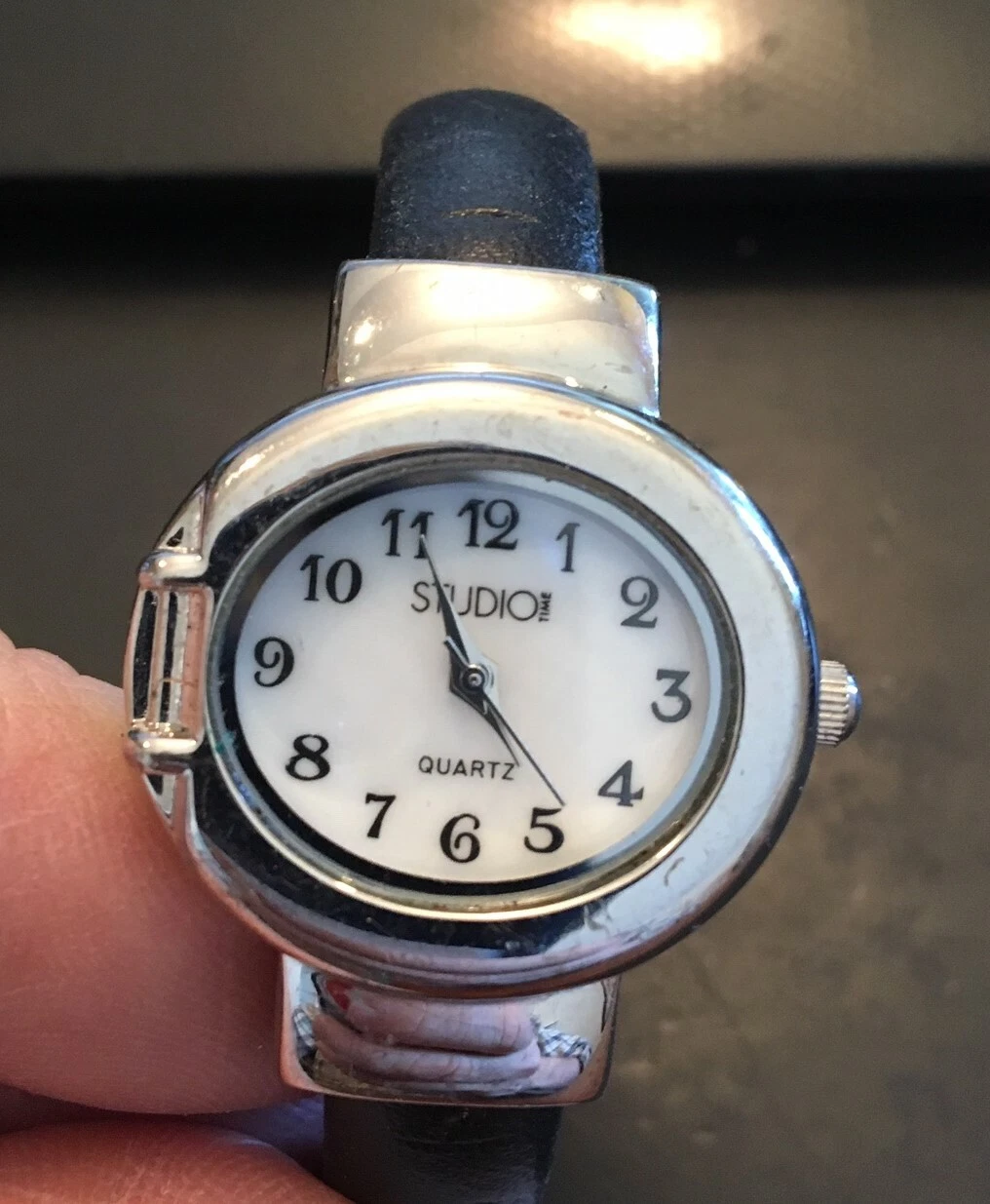 Woman's Studio Watch, Bracelet Style Silver Tone with Black leather Wrapped Brac