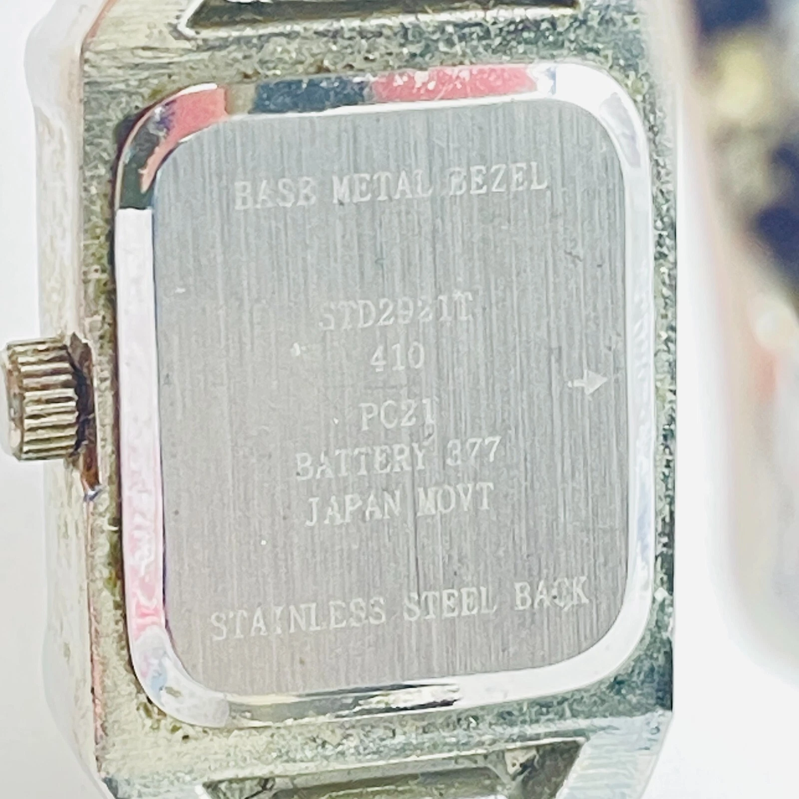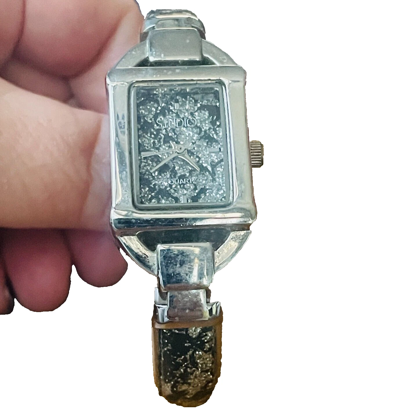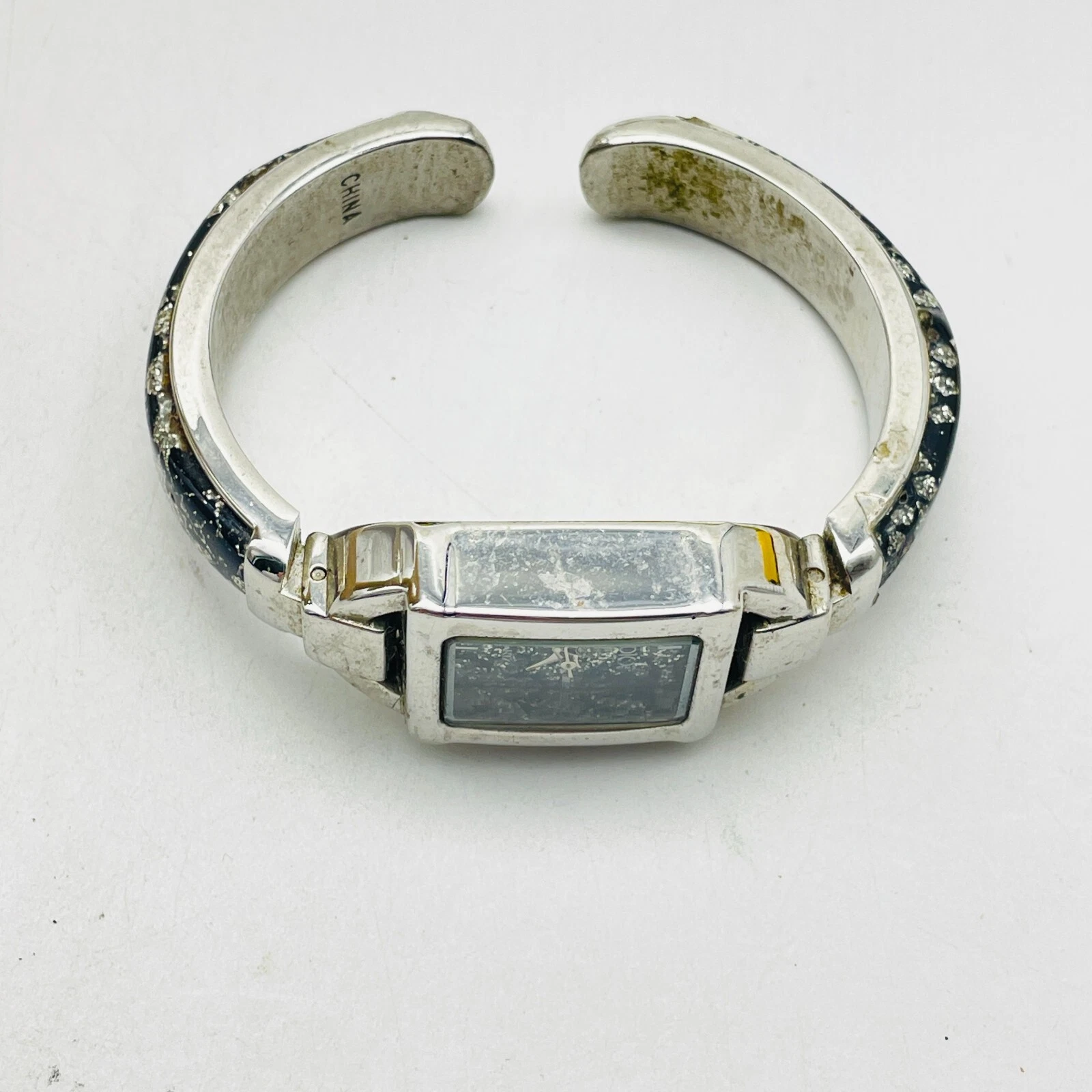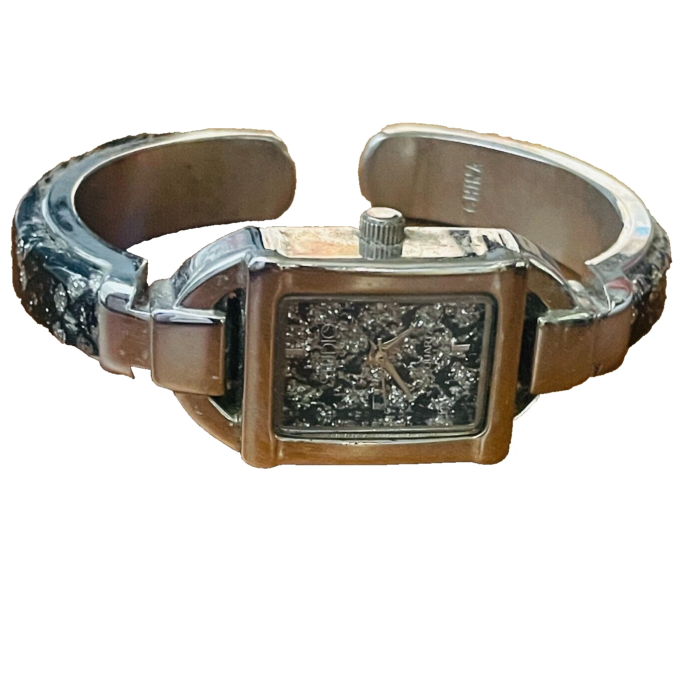 STUDIO Quartz Ladies Watch Enameled Cuff Silver Tone Black Glitter Face READ