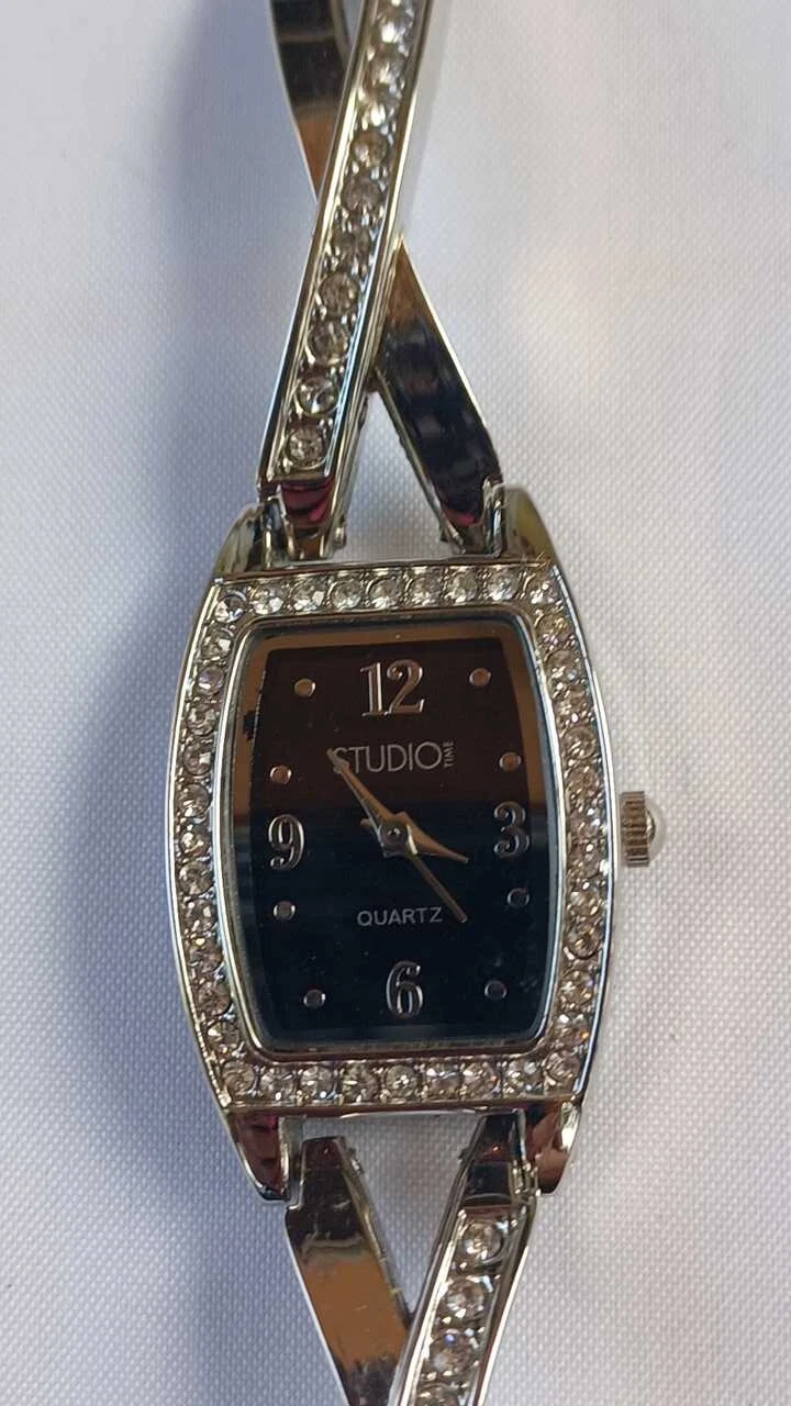 Studio Time Wristwatch Rectangular Black Face Silver Tone Rhinestones Sparkly