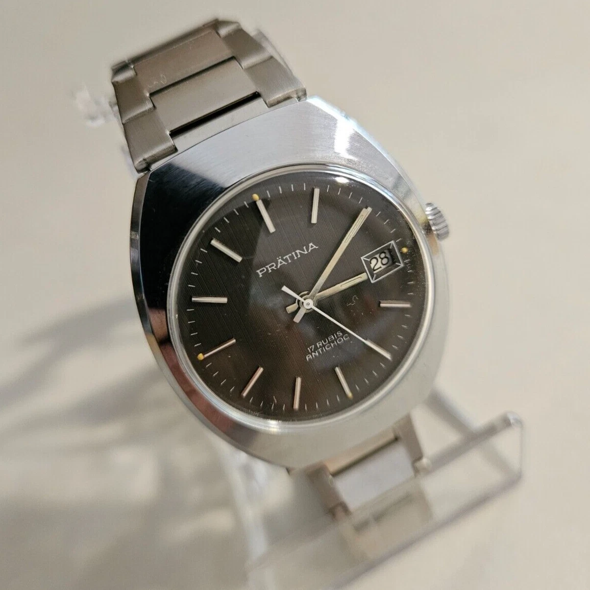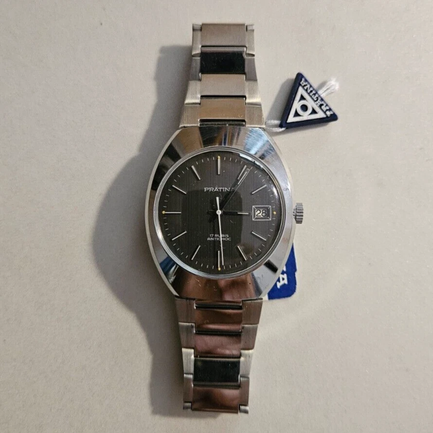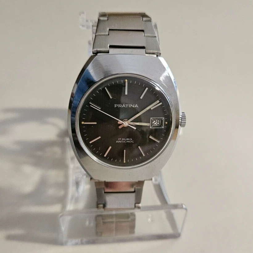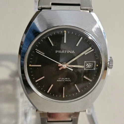Vintage Prätina Cal. Men's Watch FE-140 Date 17J "Black" Steel 70's Men's