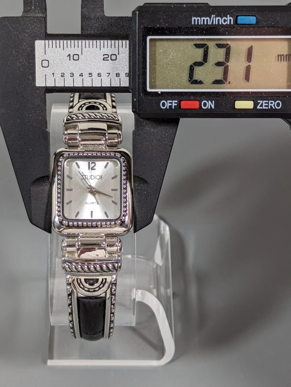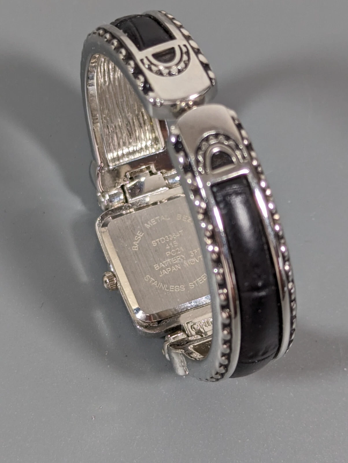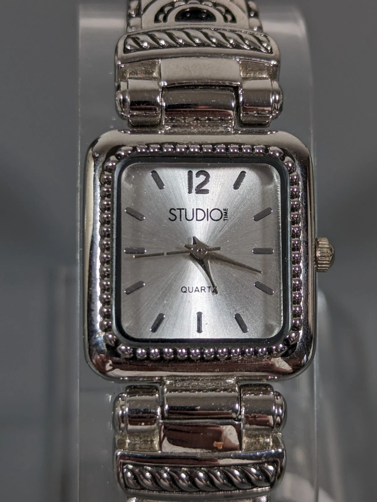 Studio Silver Tone Dial Rectangle Case Black inlay Hinge Bracelet Band Watch