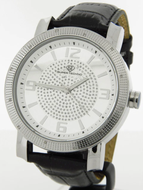 Super Techno I-5465 Men's Diamond Silver-tone Case Black Leather Band Watch