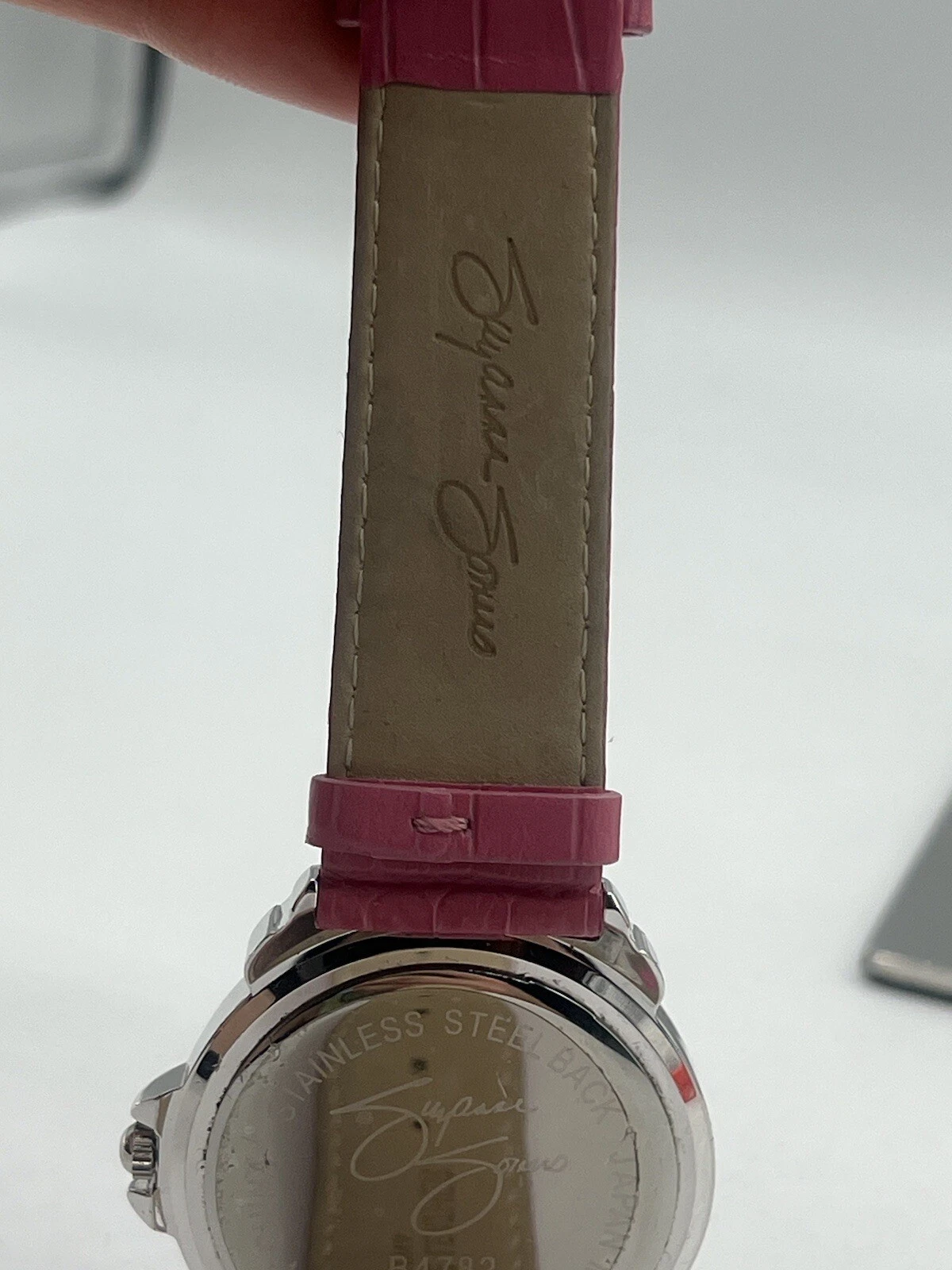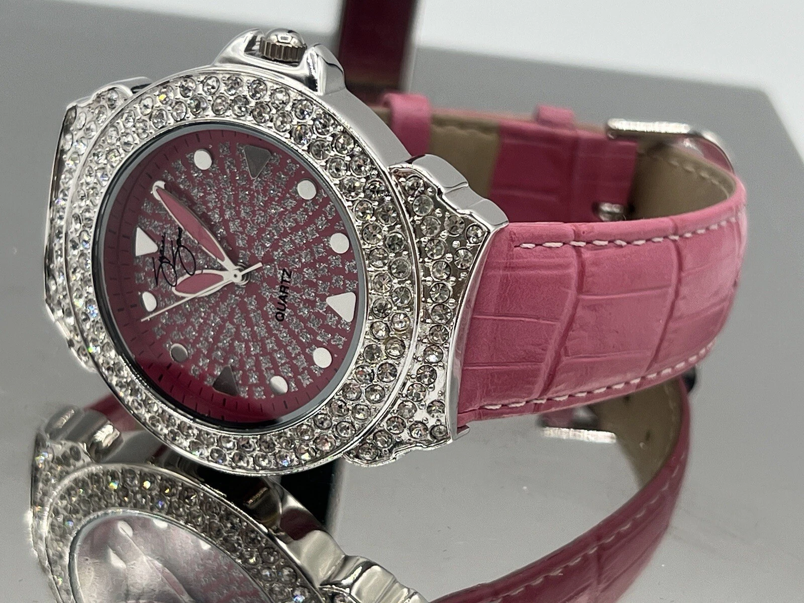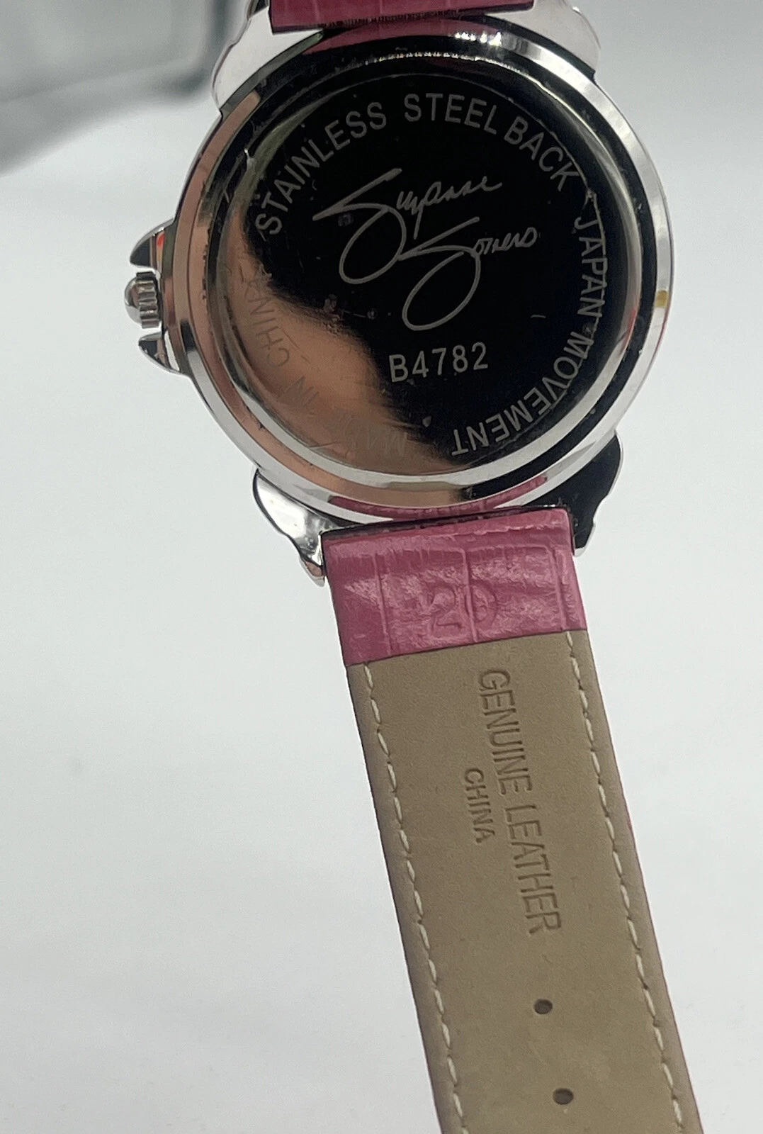 Suzanne Somers Crystal Round Face Watch Genuine Pink Leather Band