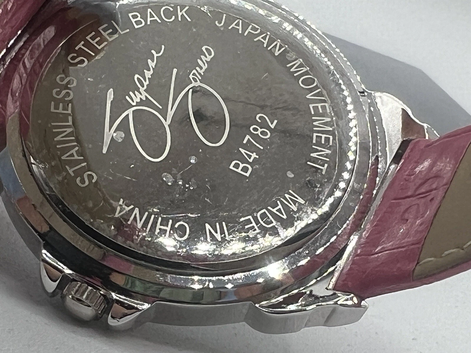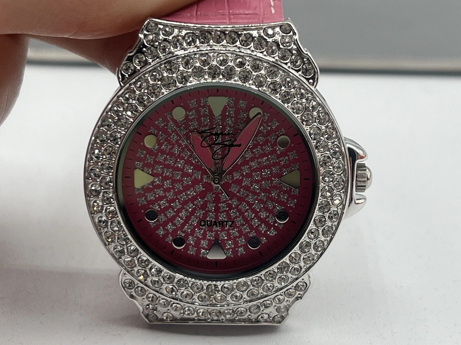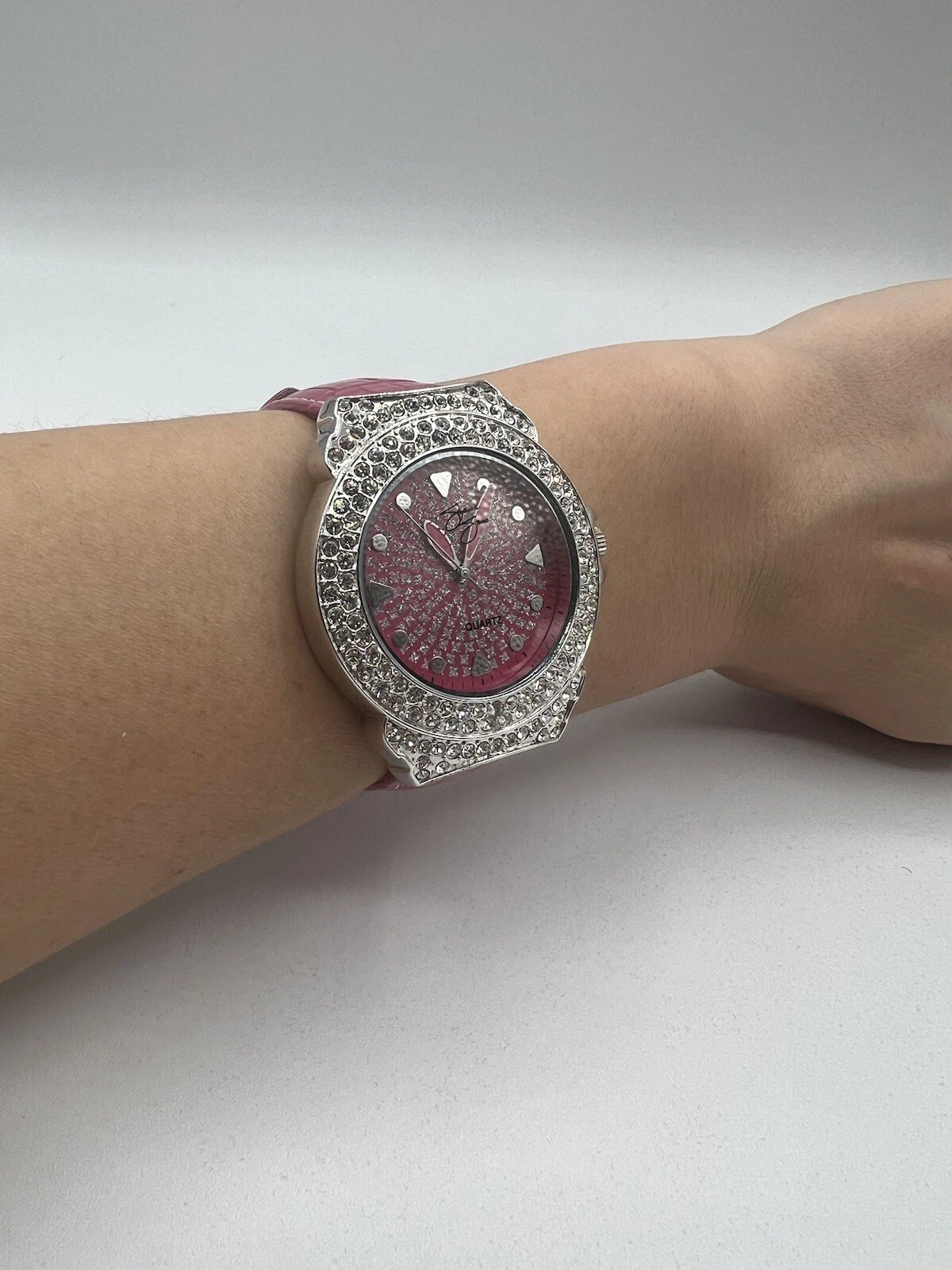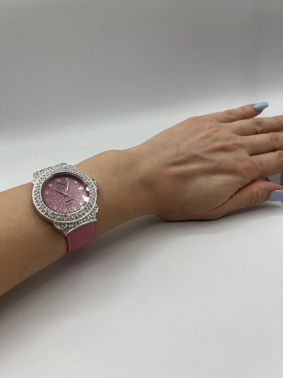 Suzanne Somers Crystal Round Face Watch Genuine Pink Leather Band