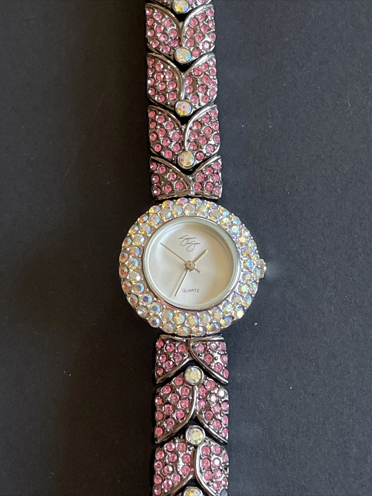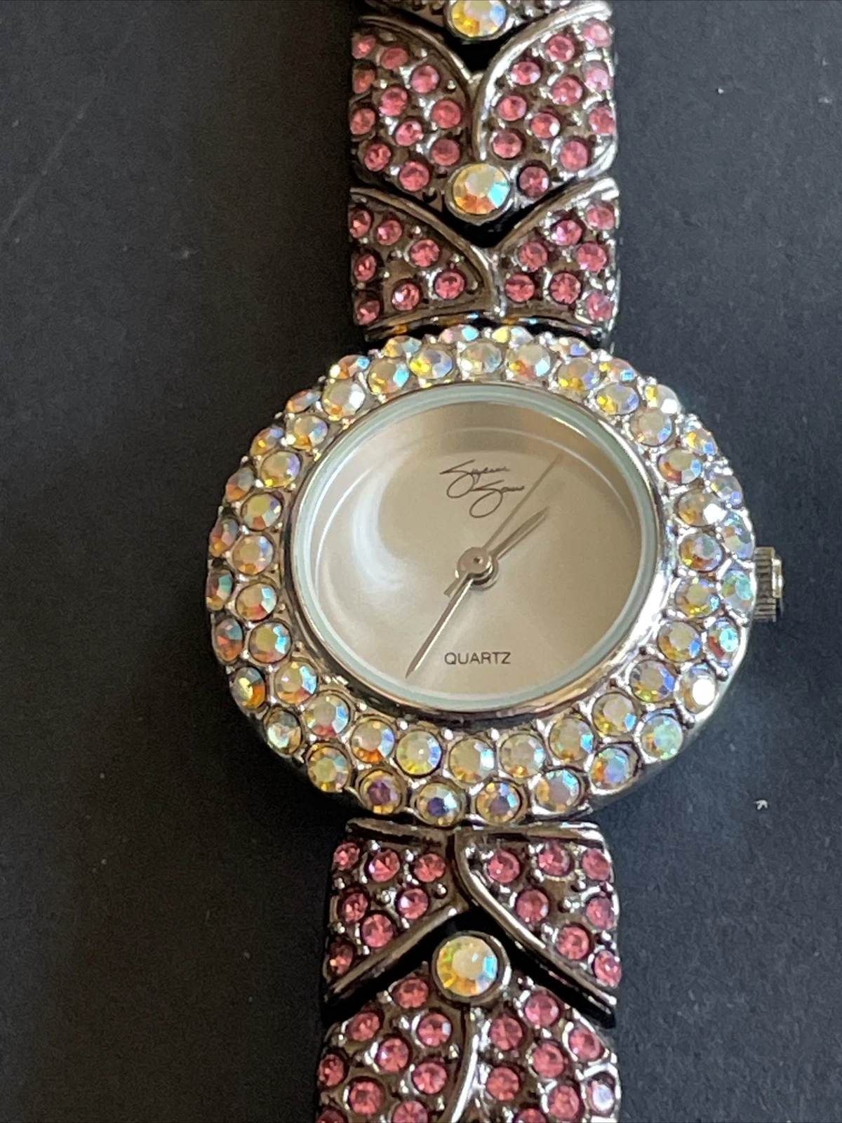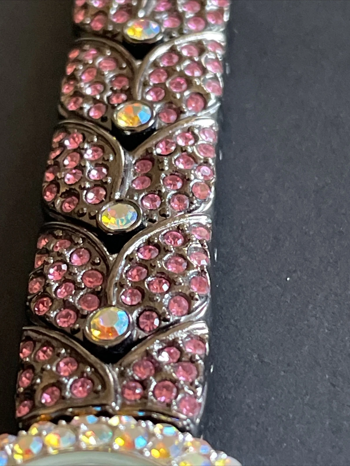 Suzanne Somers Crystal Watch Round Aurora Borealis Rhinestone Bezel Floral Pink