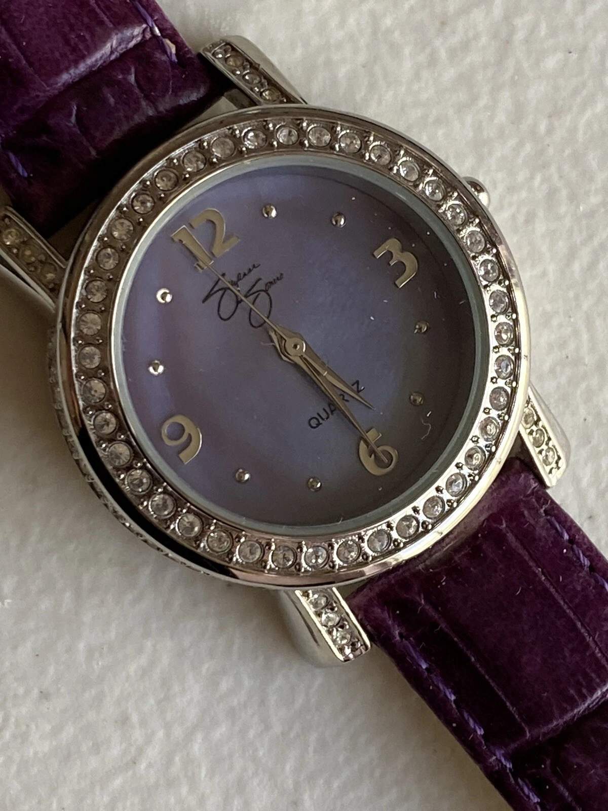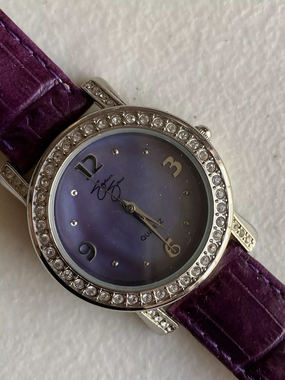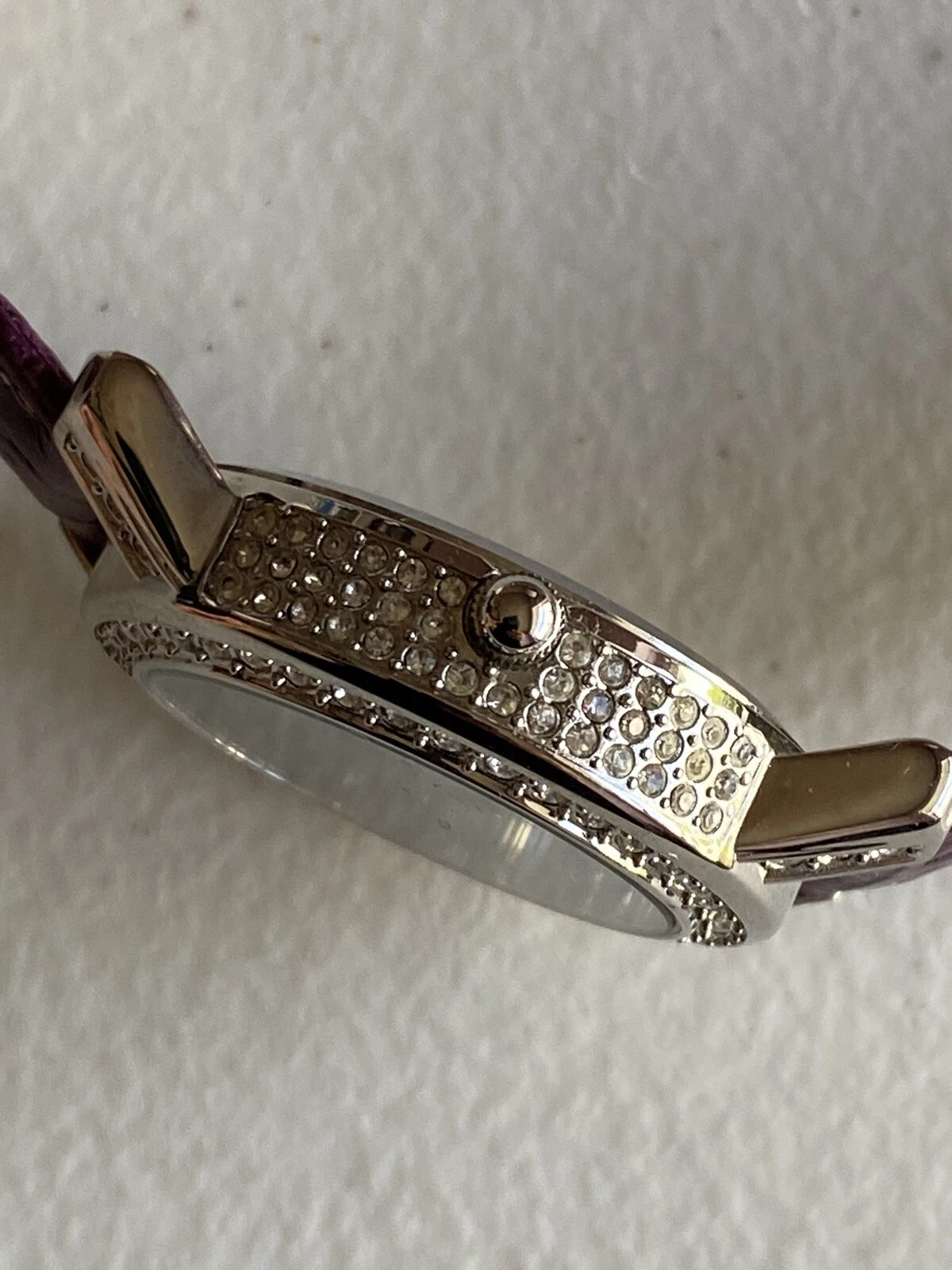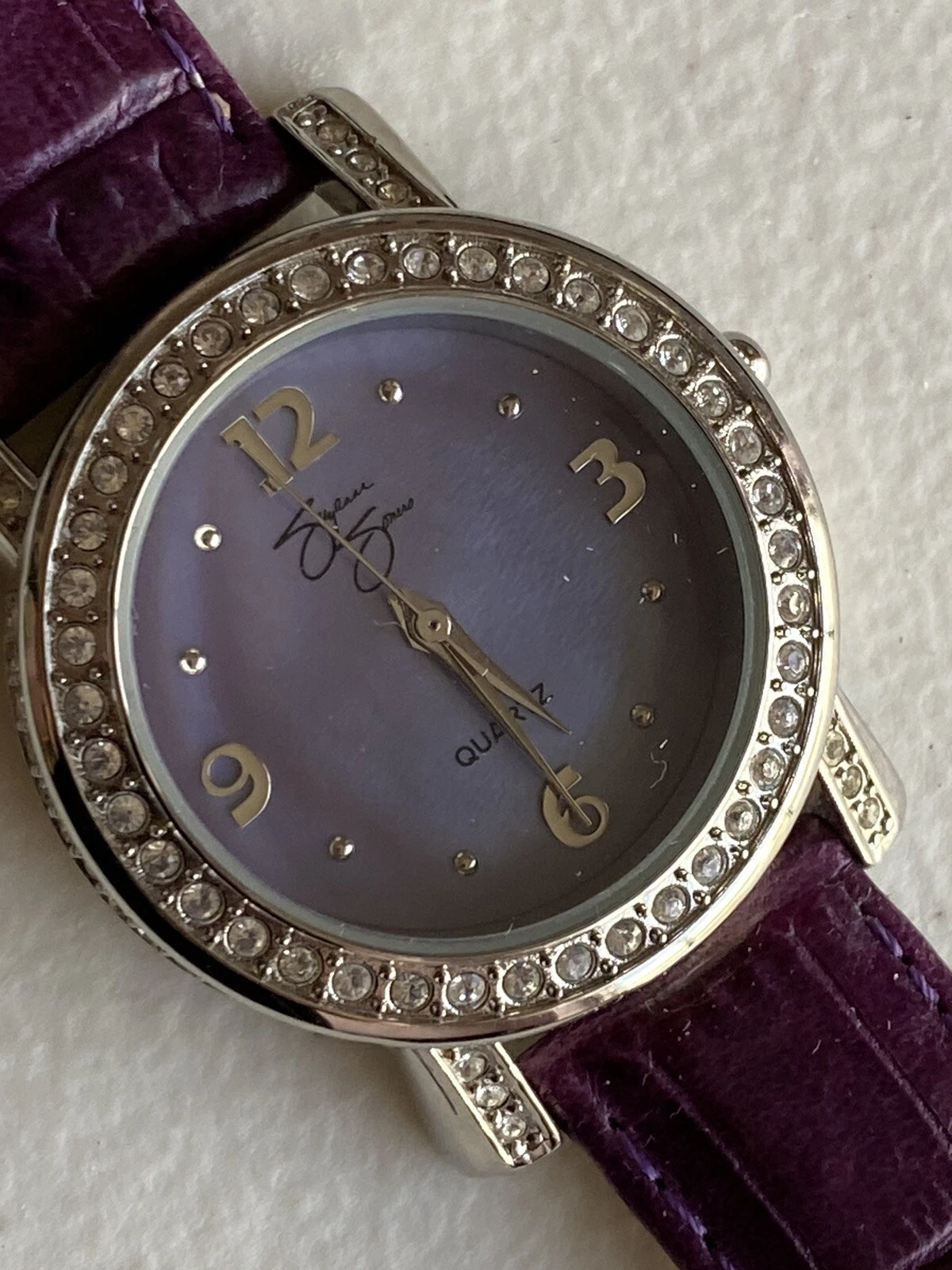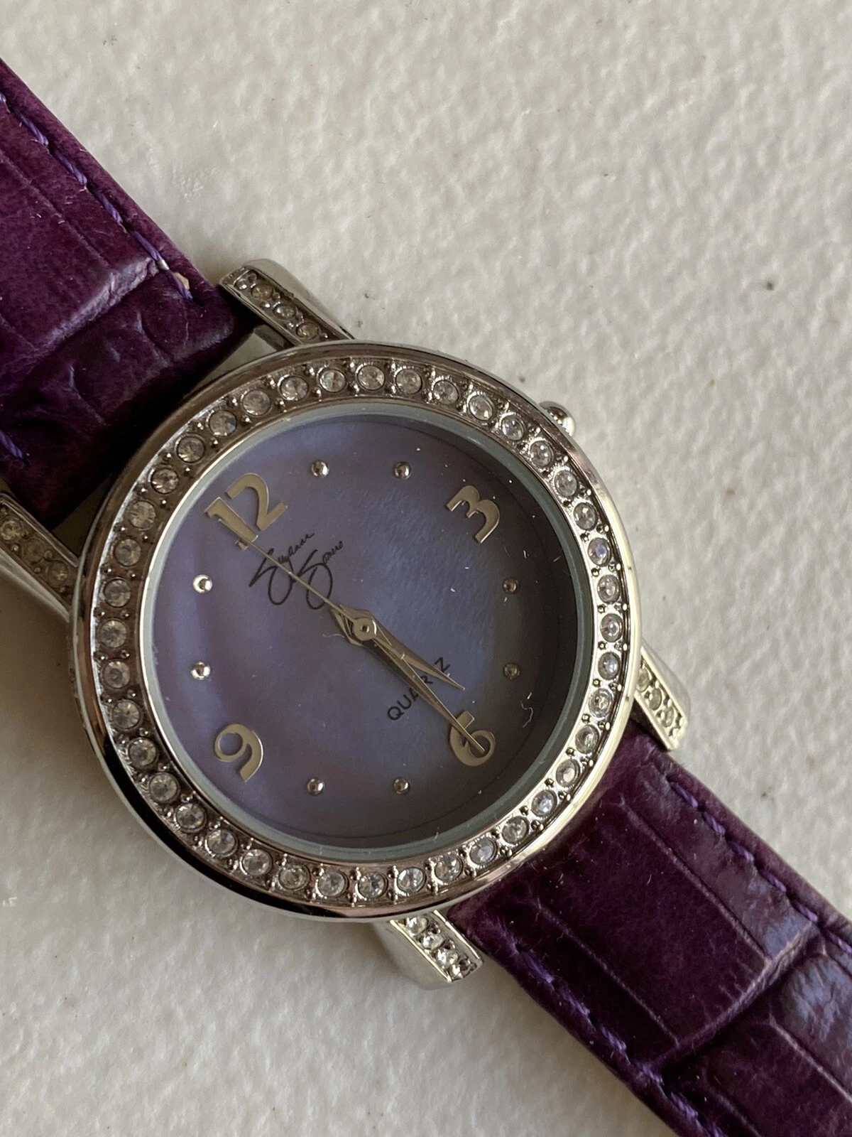 Suzanne Somers Crystal Watch Pave Bezel Round Japan Movement Purple Leather Band