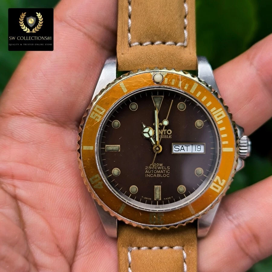 Rare Pronto Diver Brown Dial Automatic Swiss All Original Day Date Vintage Watch