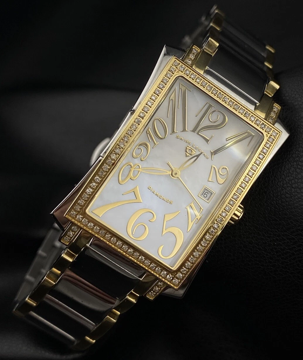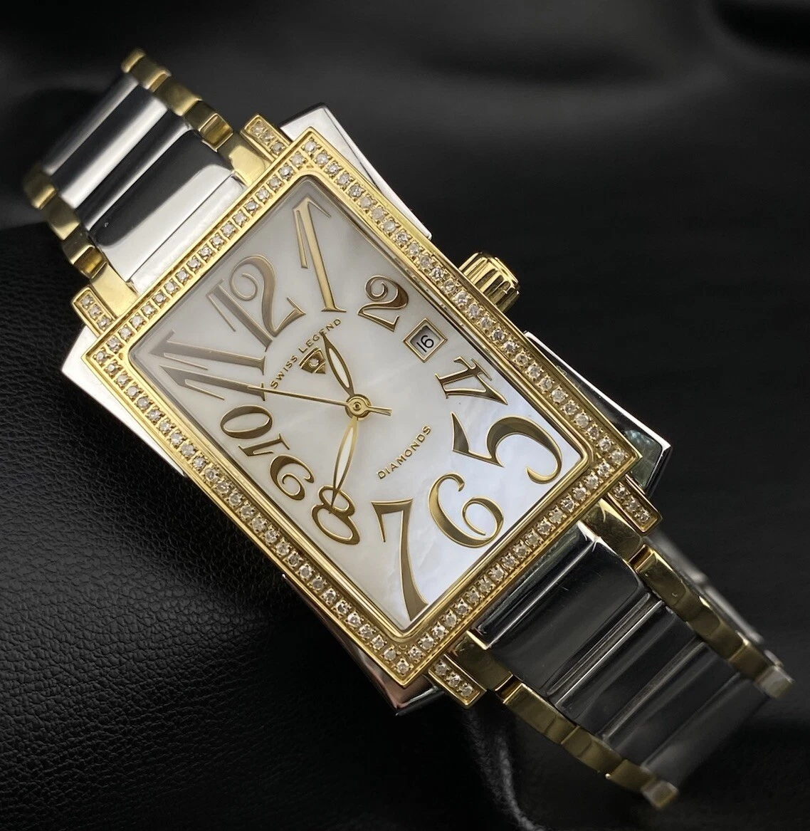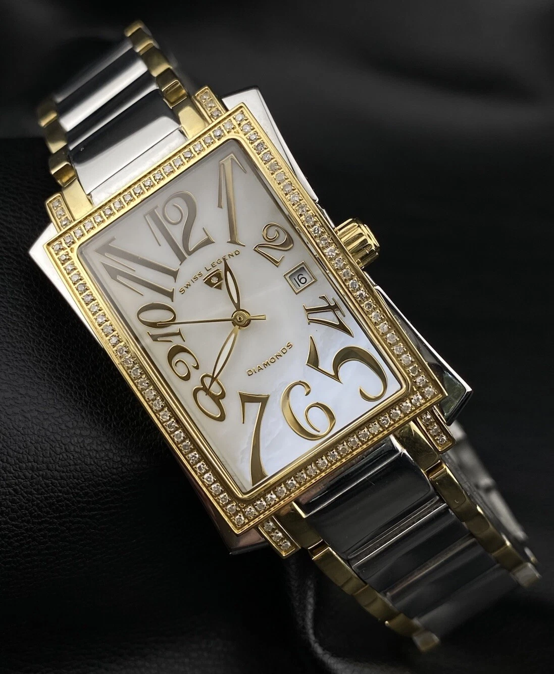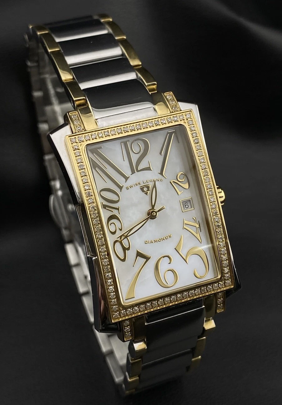 Swiss Legend Bella Diamond Pearlescent Date Dial Silver Gold Tank Chic Watch