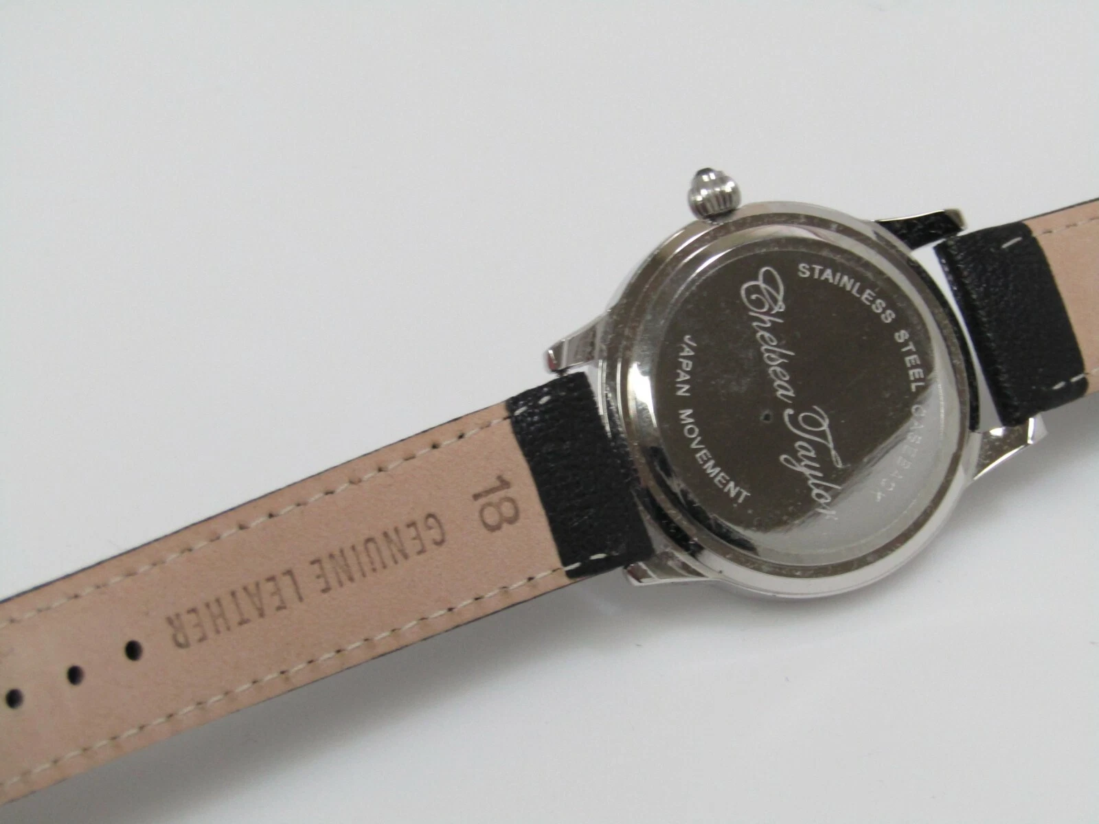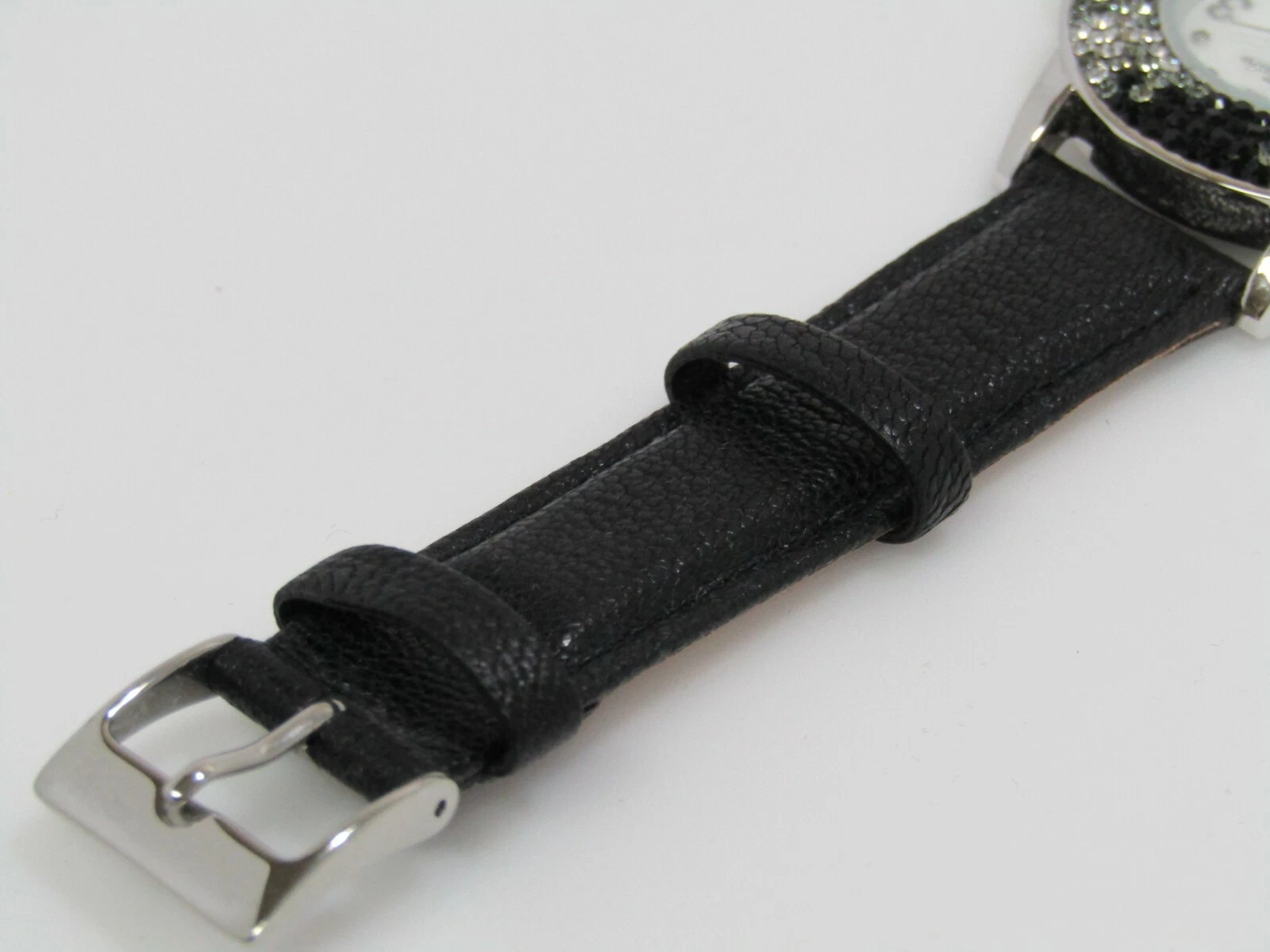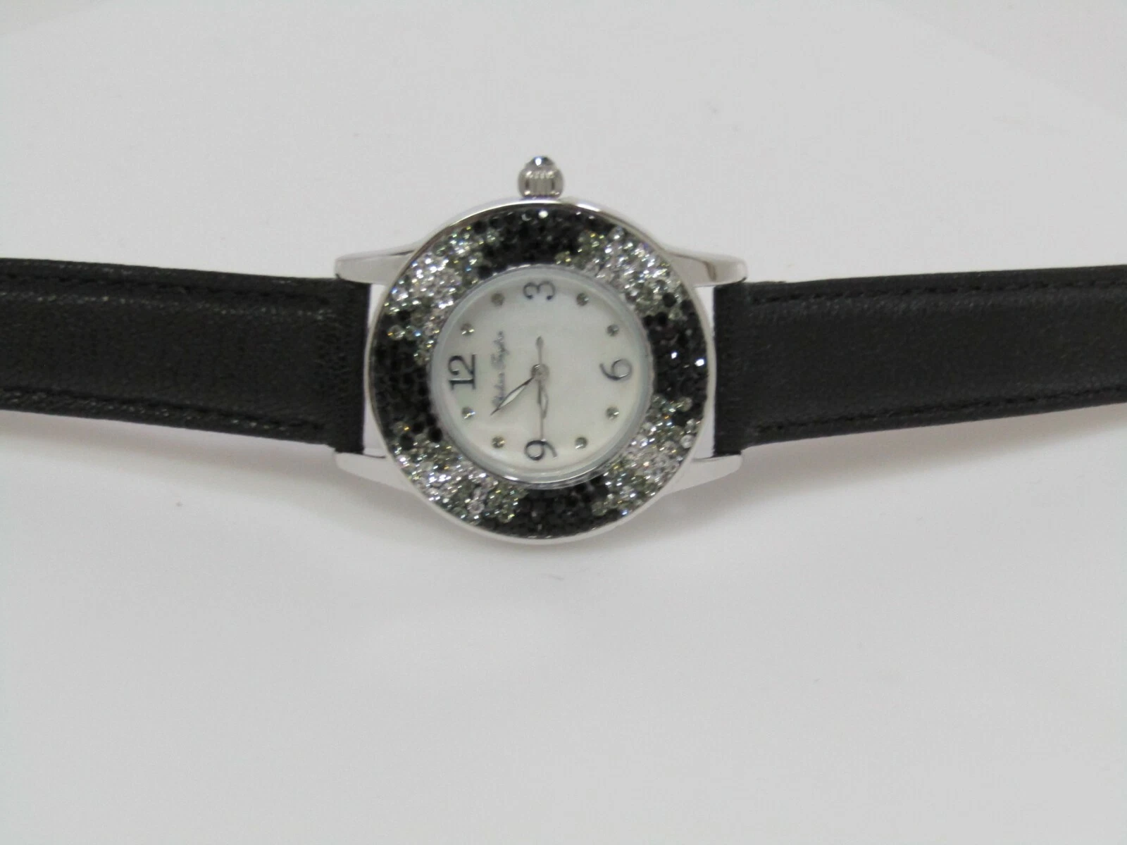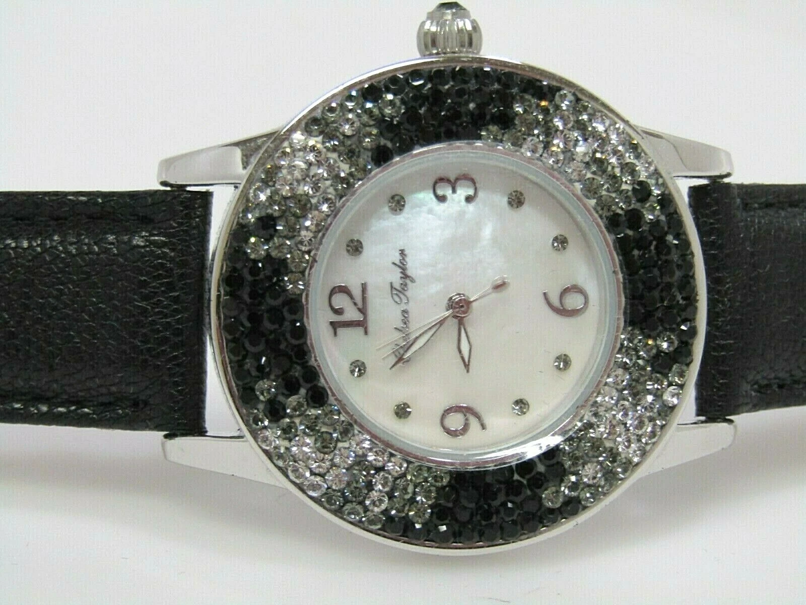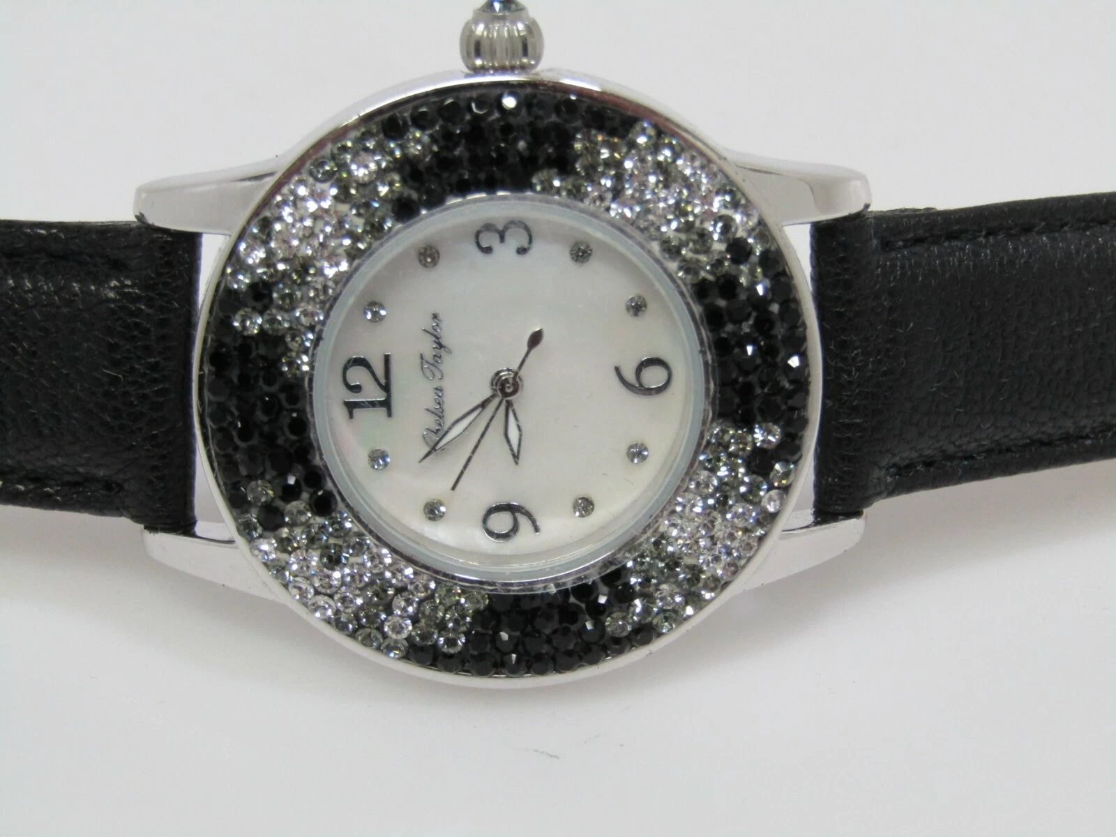 Chelsea Taylor Crystal Round Mother-of-Pearl Dial Leather Strap Watch Black