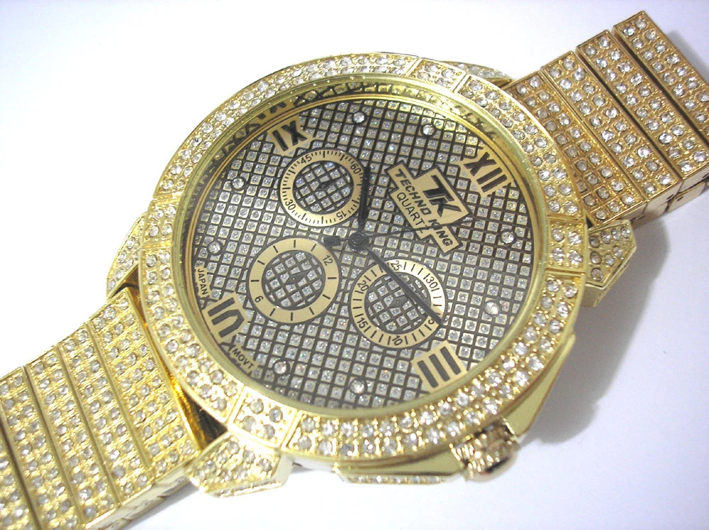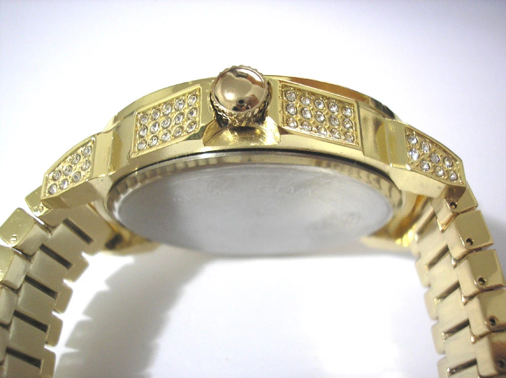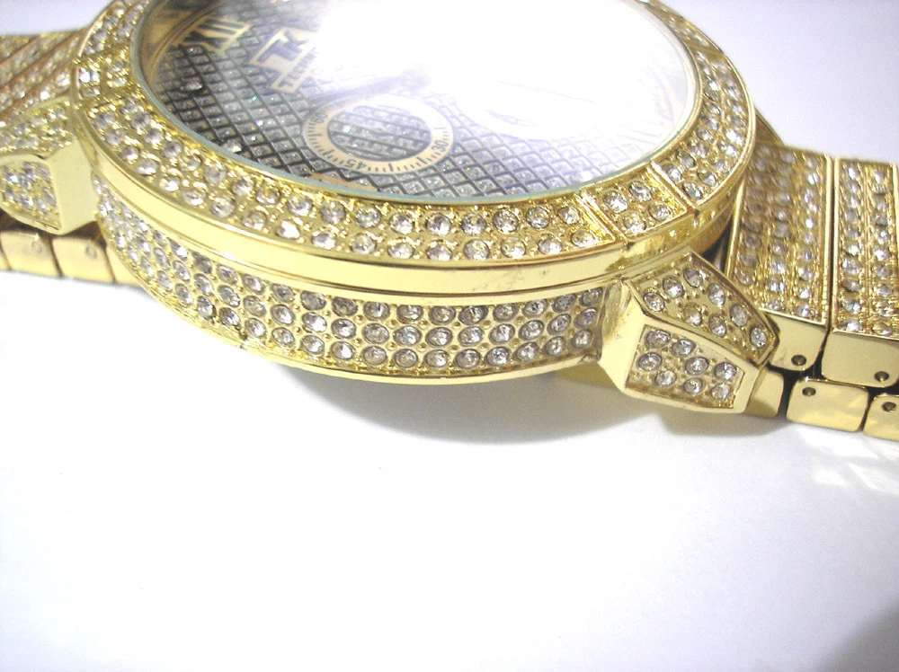 Gold Tone Metal Big Case Techno King Men's Watch w Crystals Item 2602