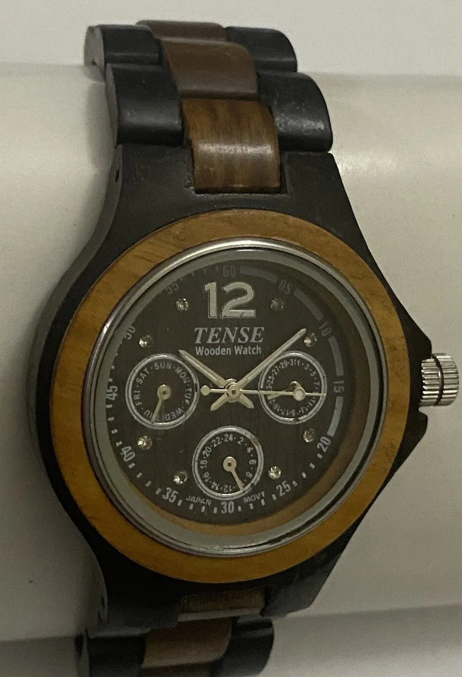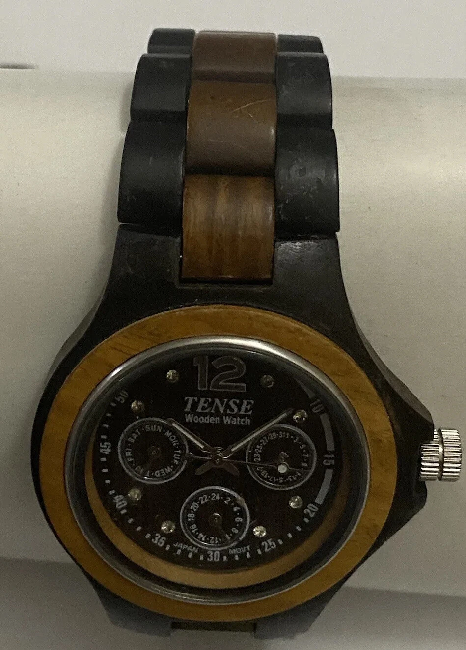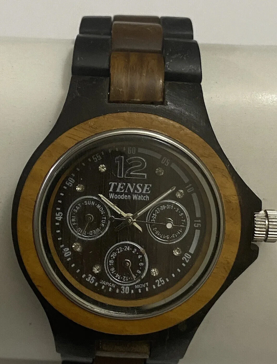 Tense Wood Watch Day Date Quartz Watch FOR PARTS/NOT WORKING! Case Back Bad