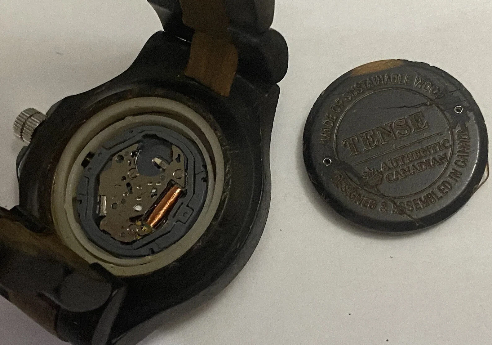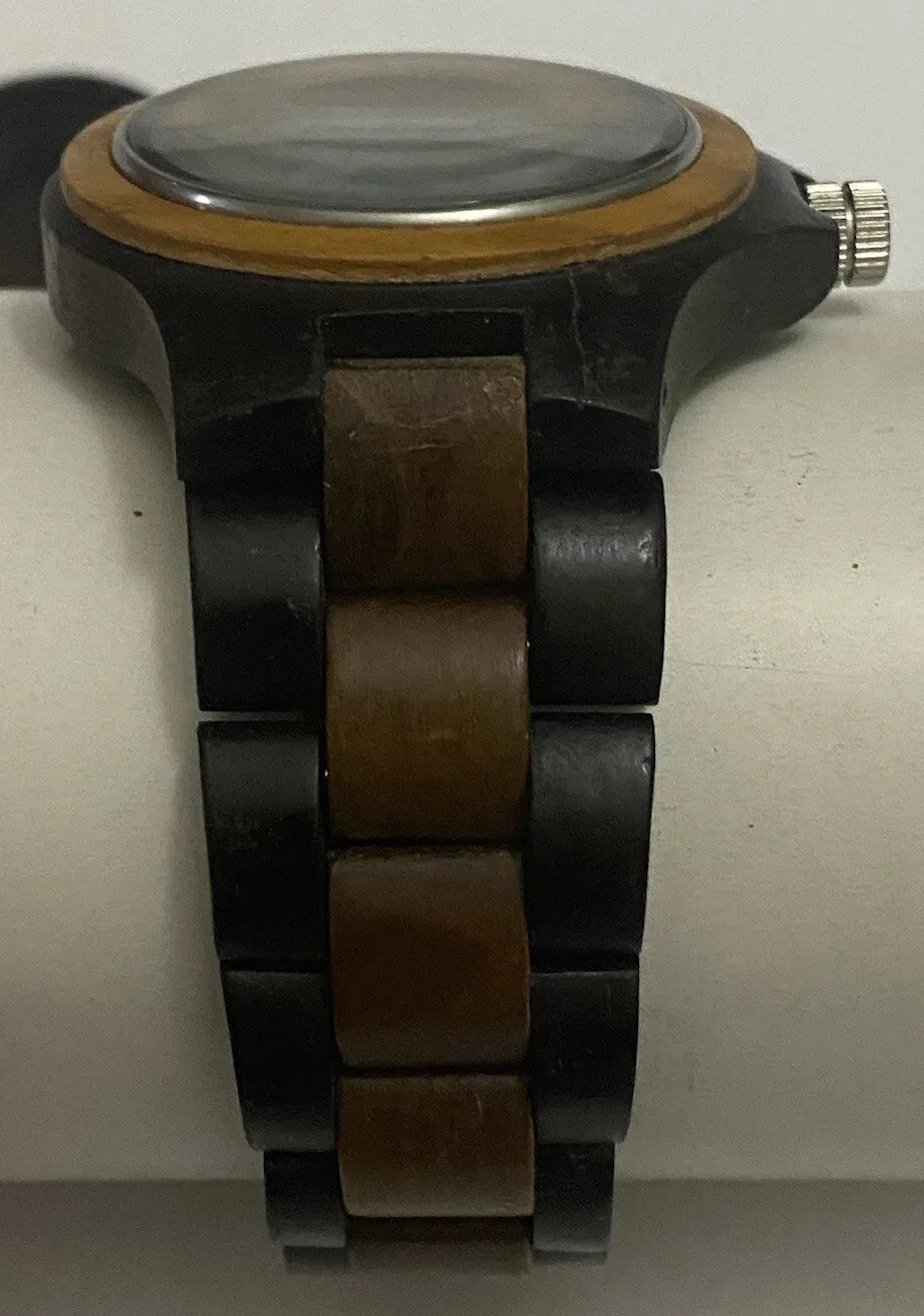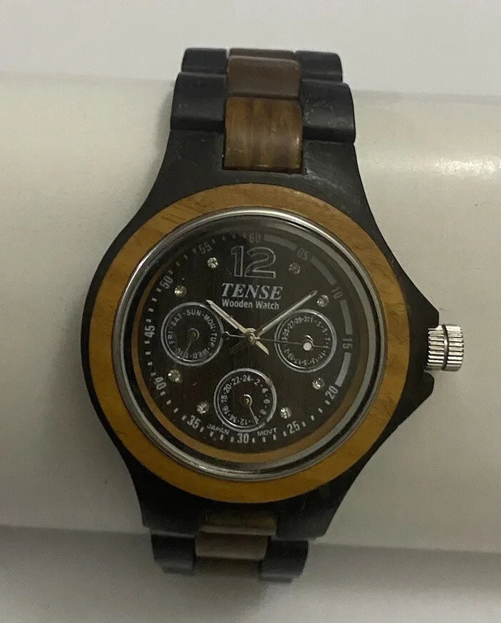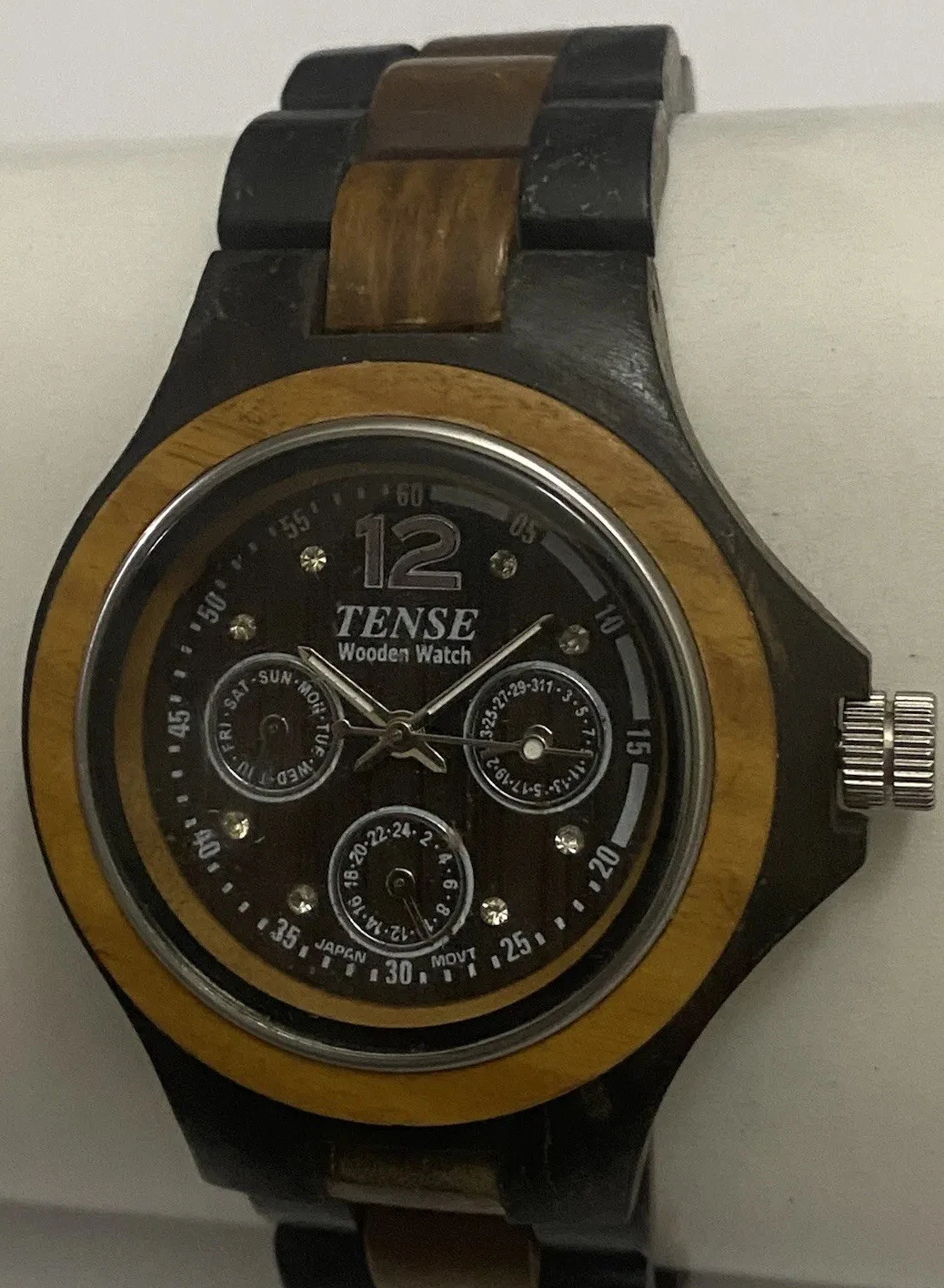 Tense Wood Watch Day Date Quartz Watch FOR PARTS/NOT WORKING! Case Back Bad