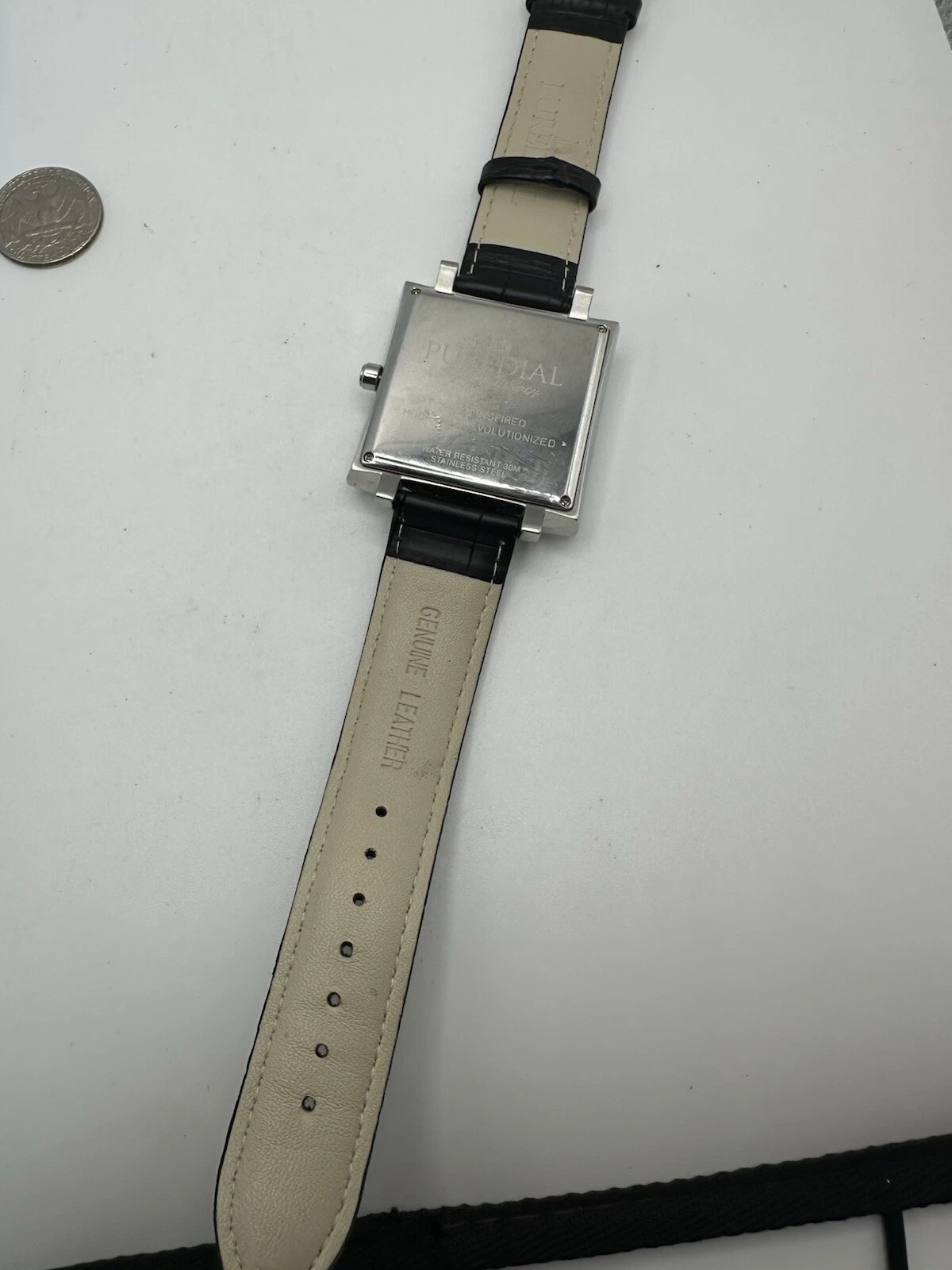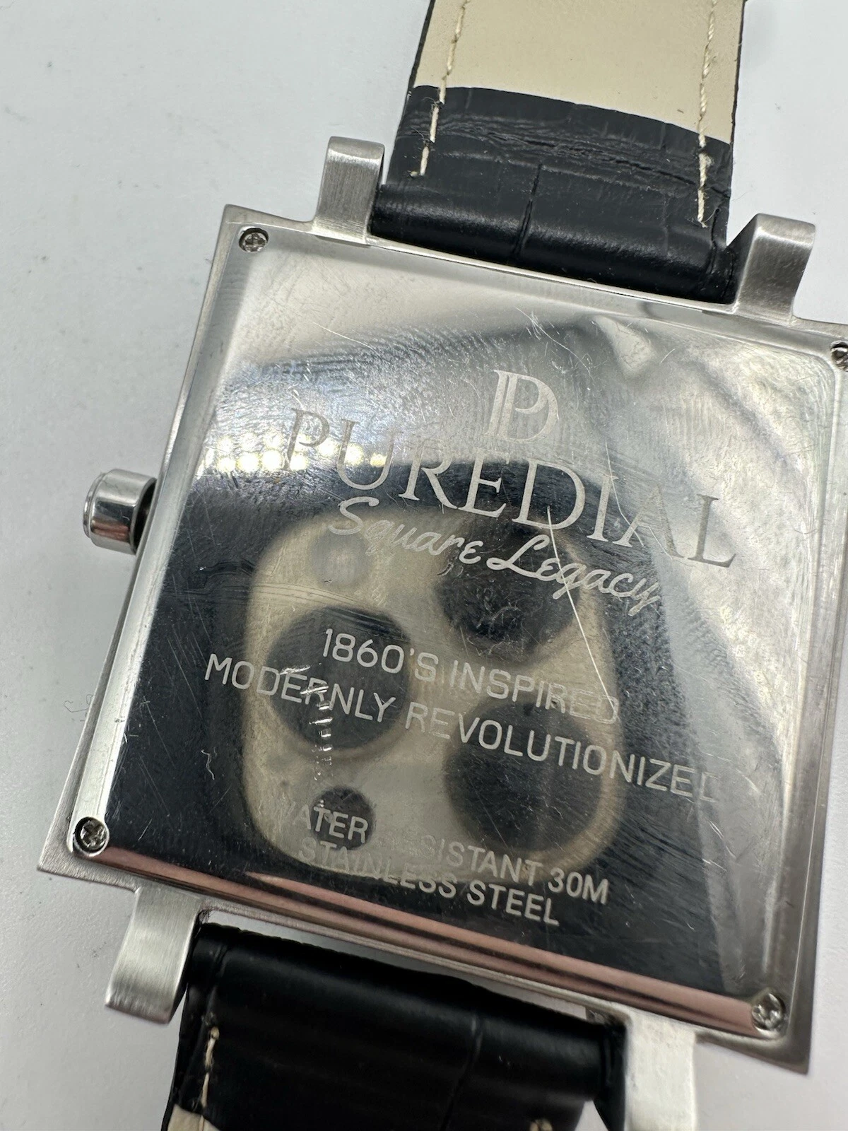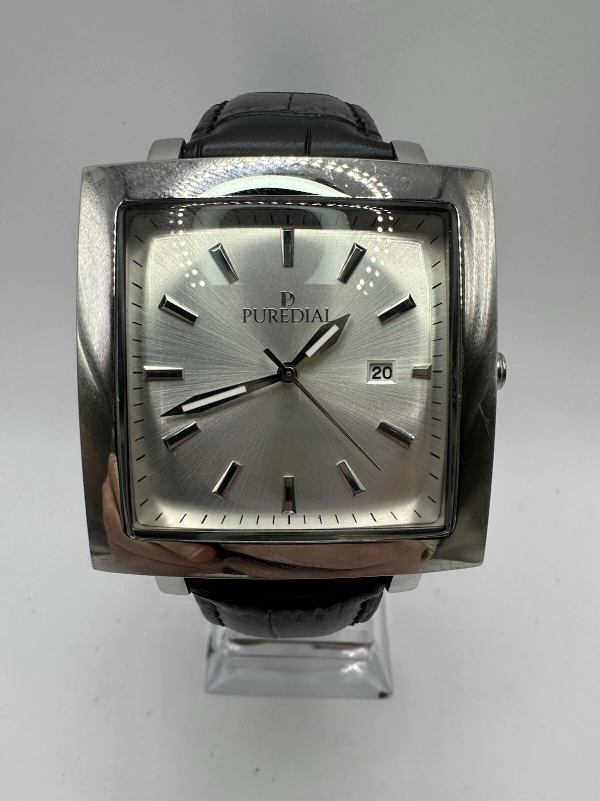 Puredial black dial stainless steel Men’s black leather strap quartz watch 42mm