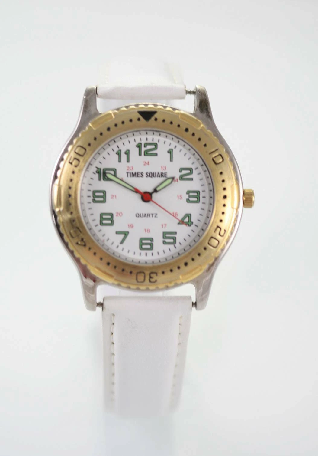 Times Square Men's White Leather Stainless Water Resistant 24hr Quartz Watch