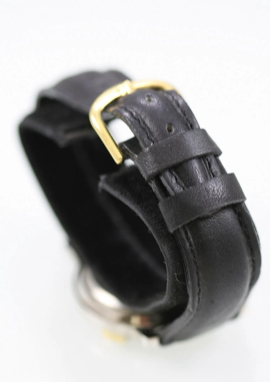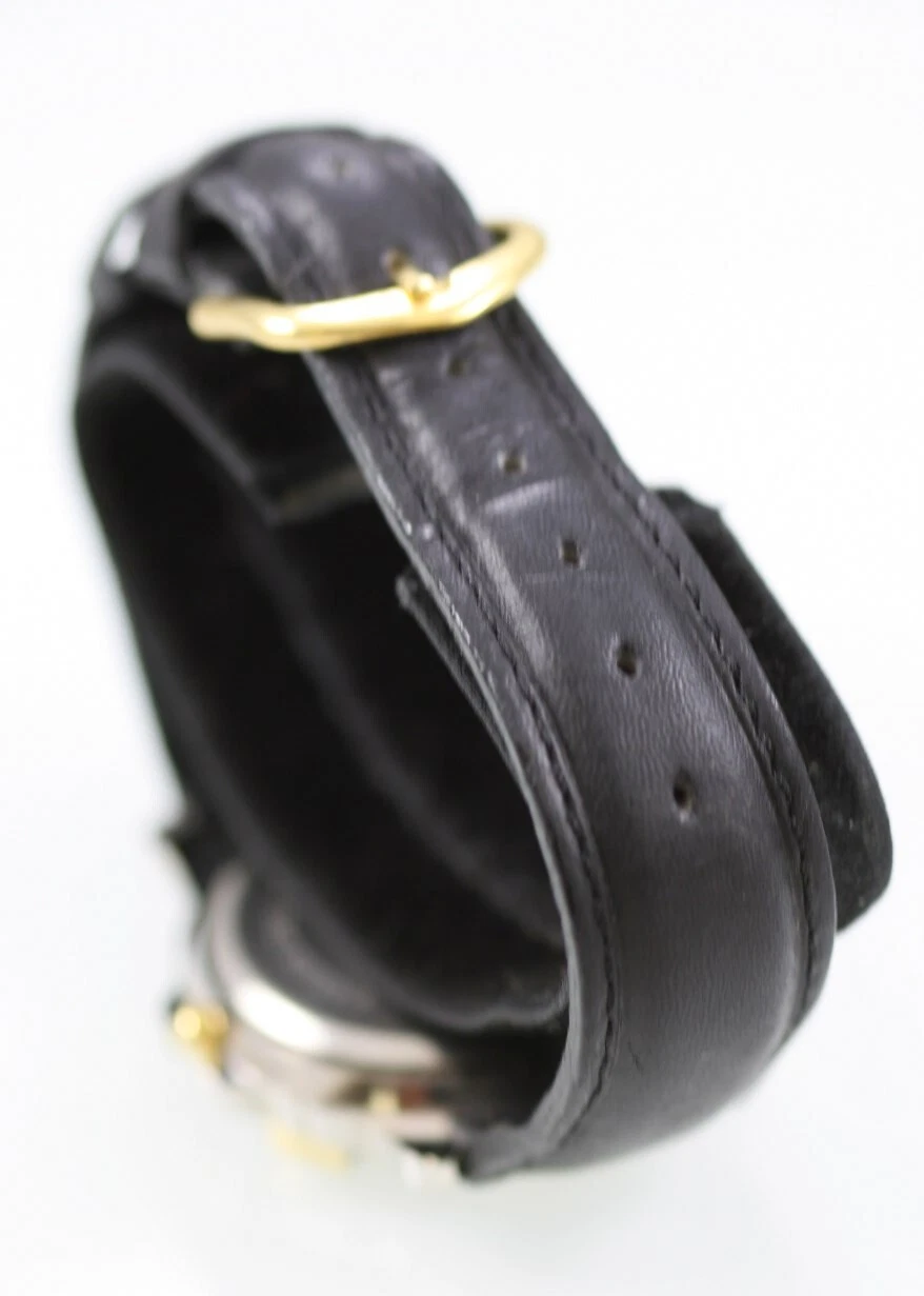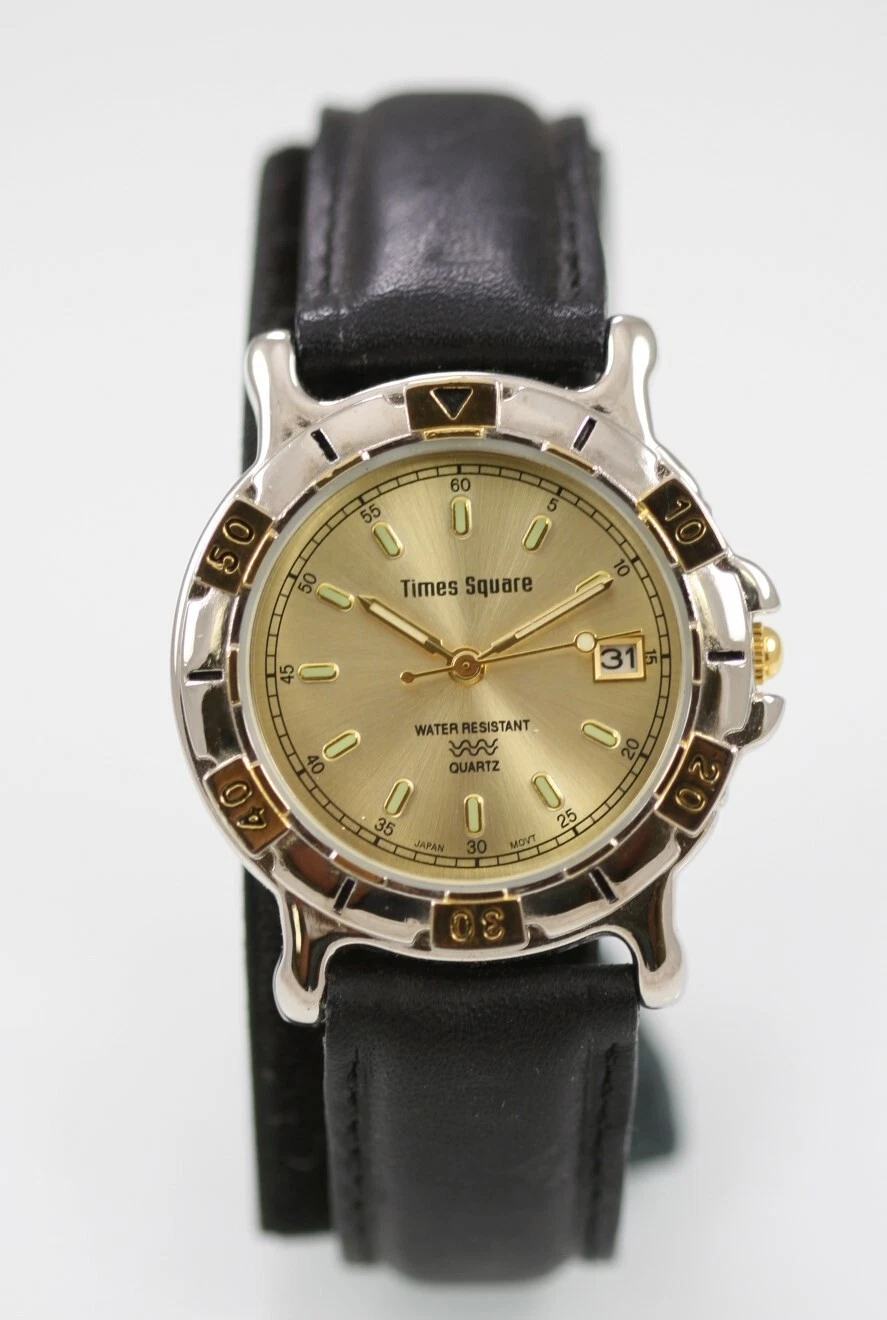 Times Square Men Watch Silver Gold Stainless Steel WR Black Leather Date Quartz