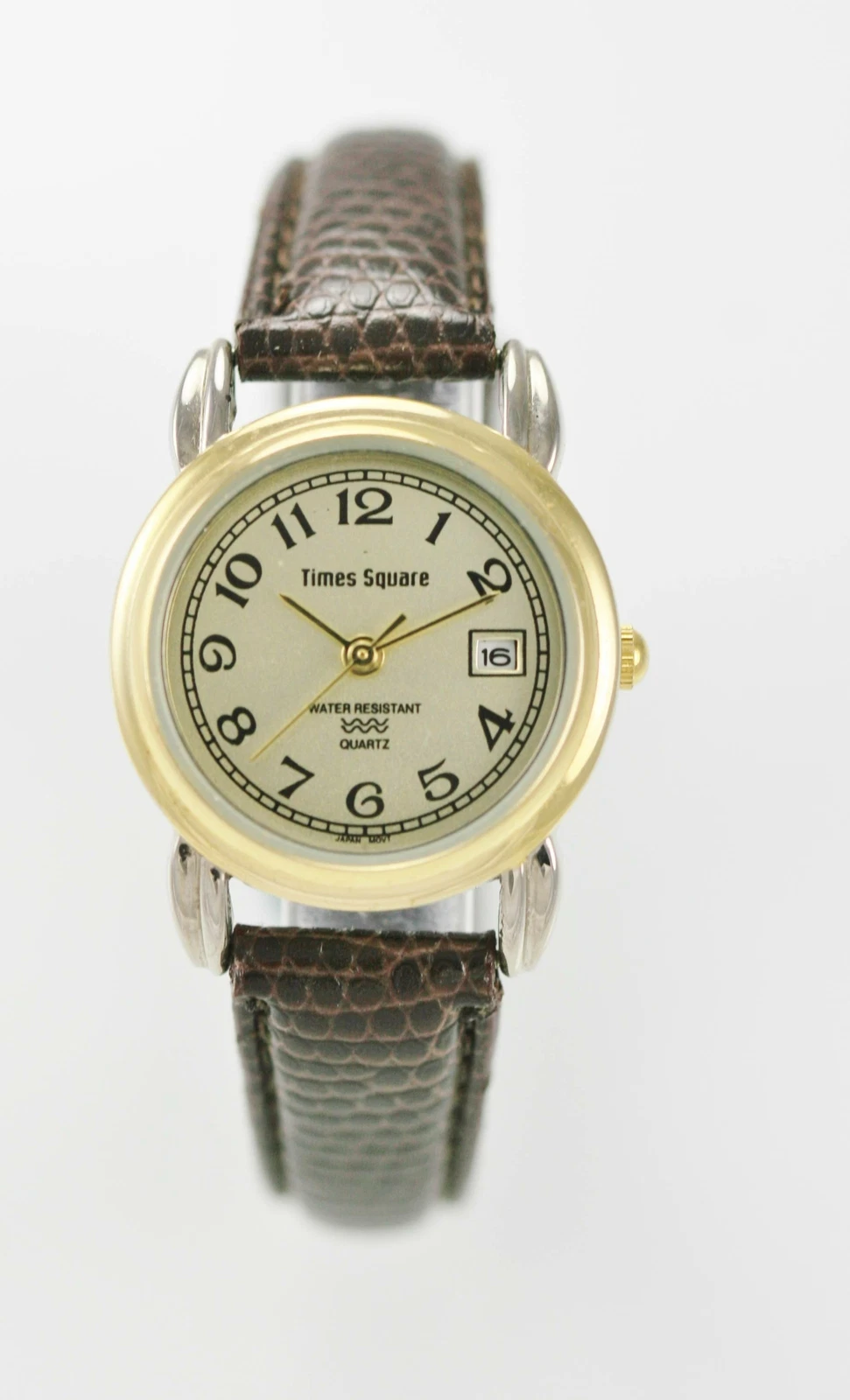 Times Square Watch Womens Stainless Silver Gold Steel Brown Leather Date Quartz