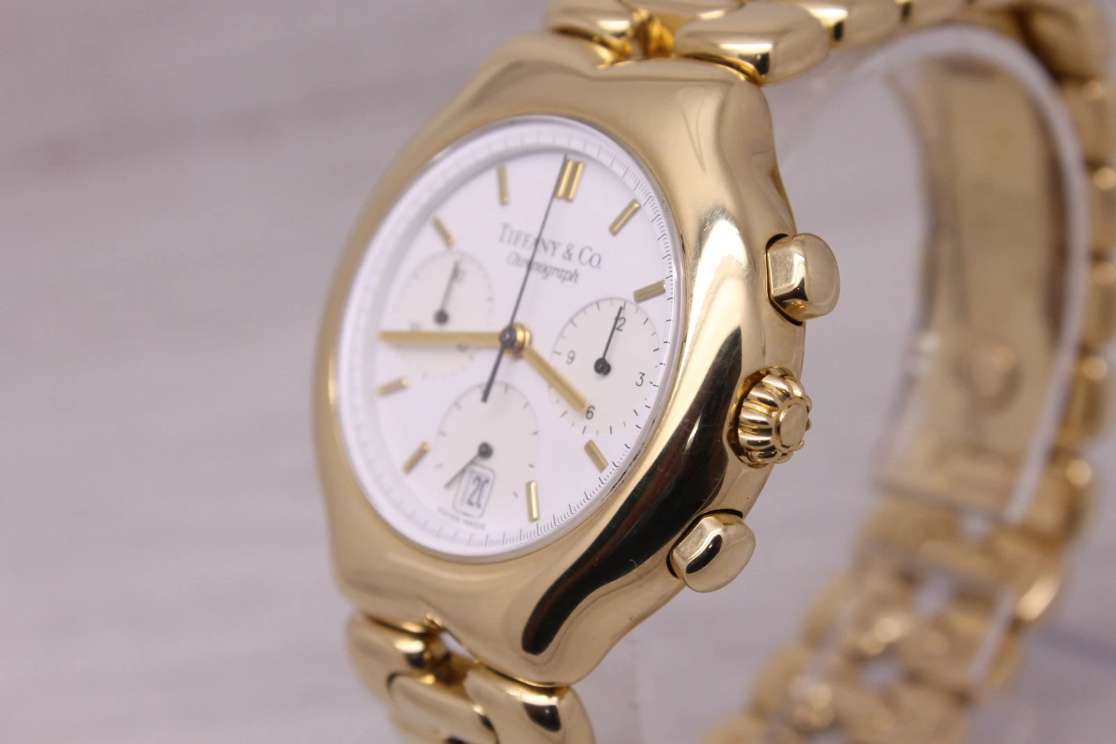 Tiffany & Co Tesoro Mens 18k Yellow Gold Heavy Quartz Chronograph Watch w/ Box