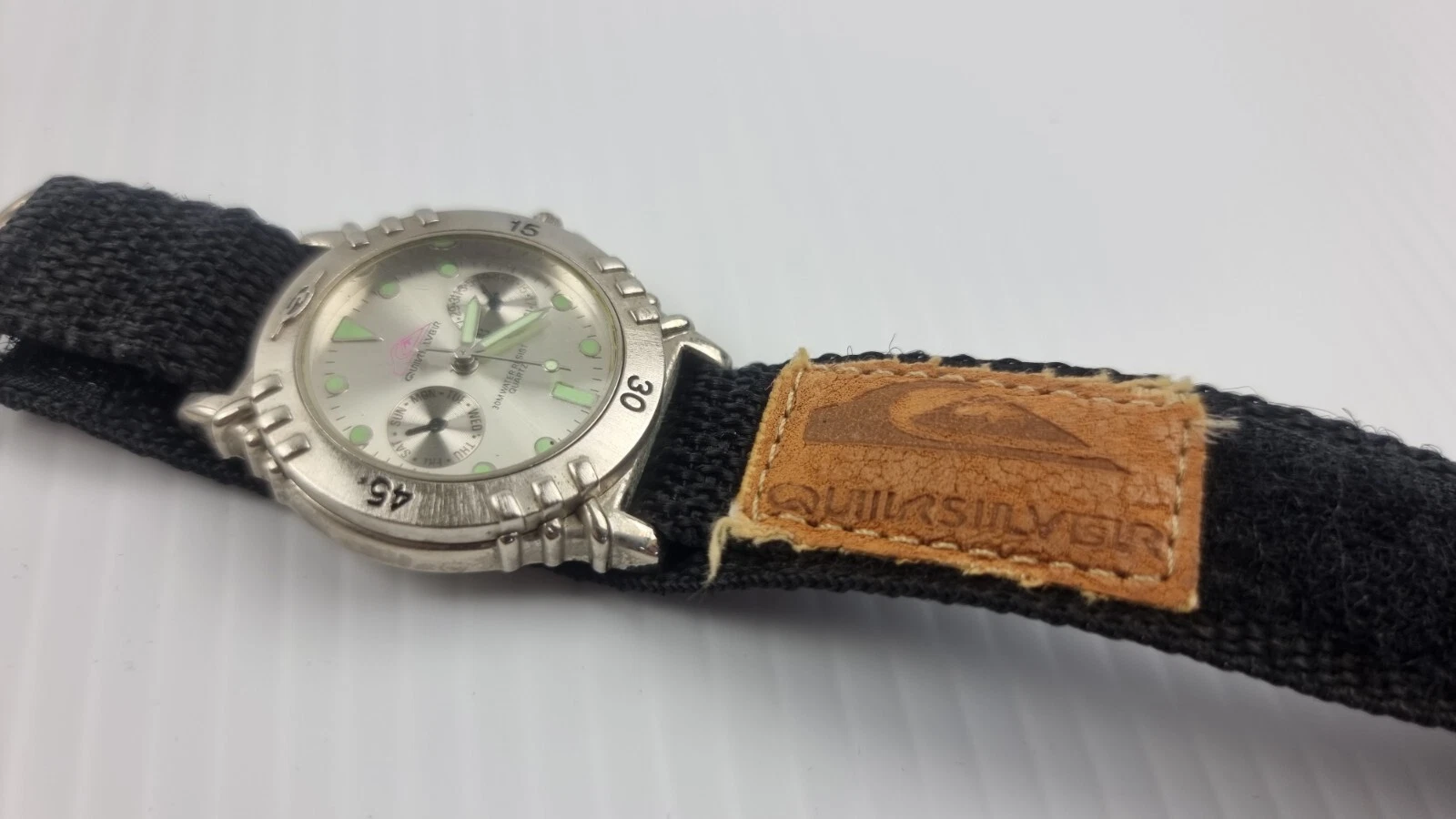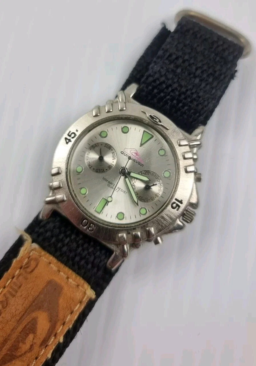 Vintage Quiksilver Wrist Band Watch Rotatable Bezel 3 Face Day Date 30M Quartz