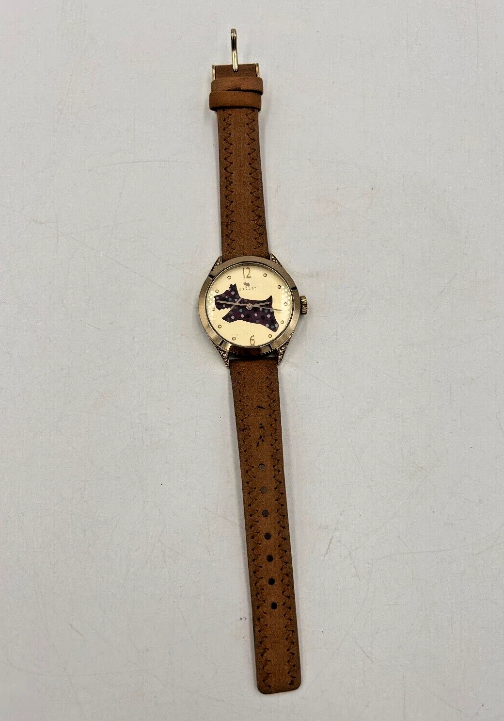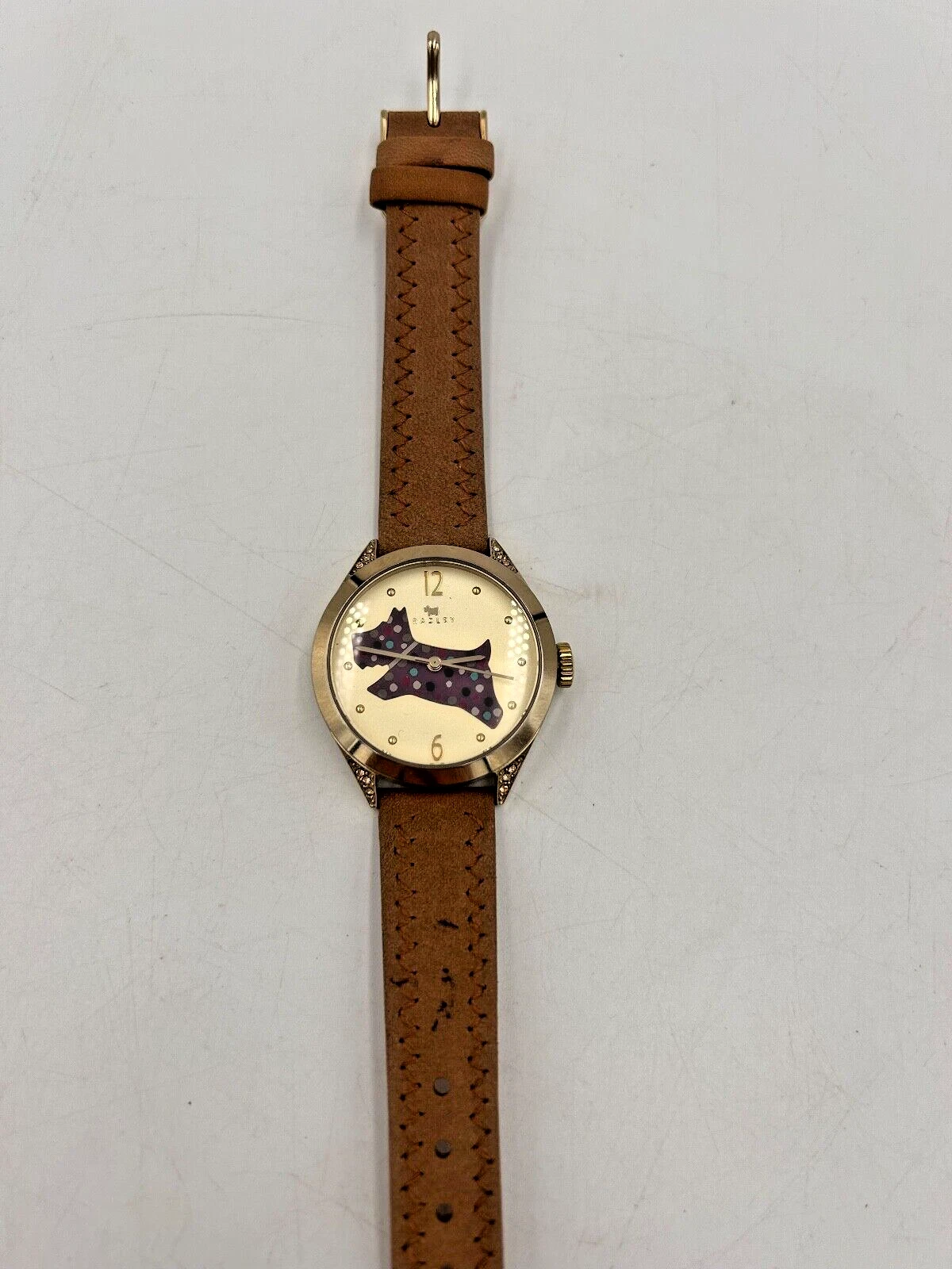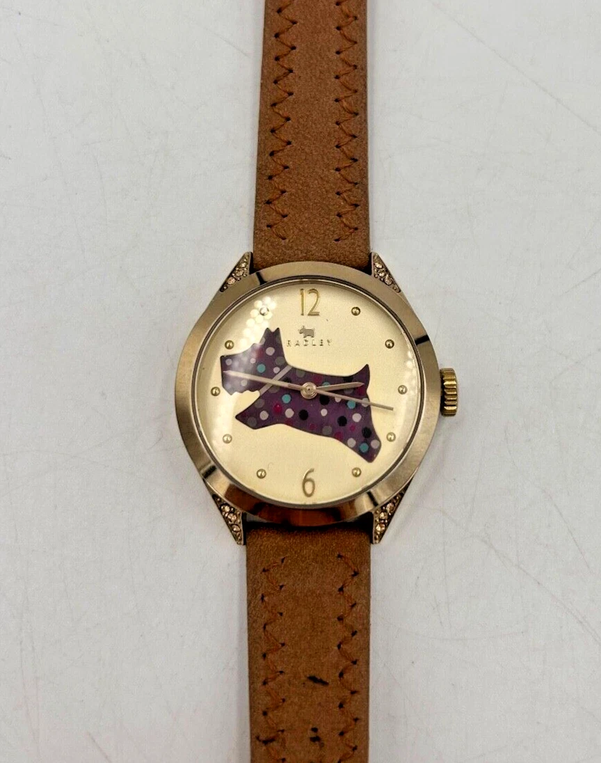 Radley Gold Ladies Watch Beige Leather Strap Purple Spotty Dog VGC