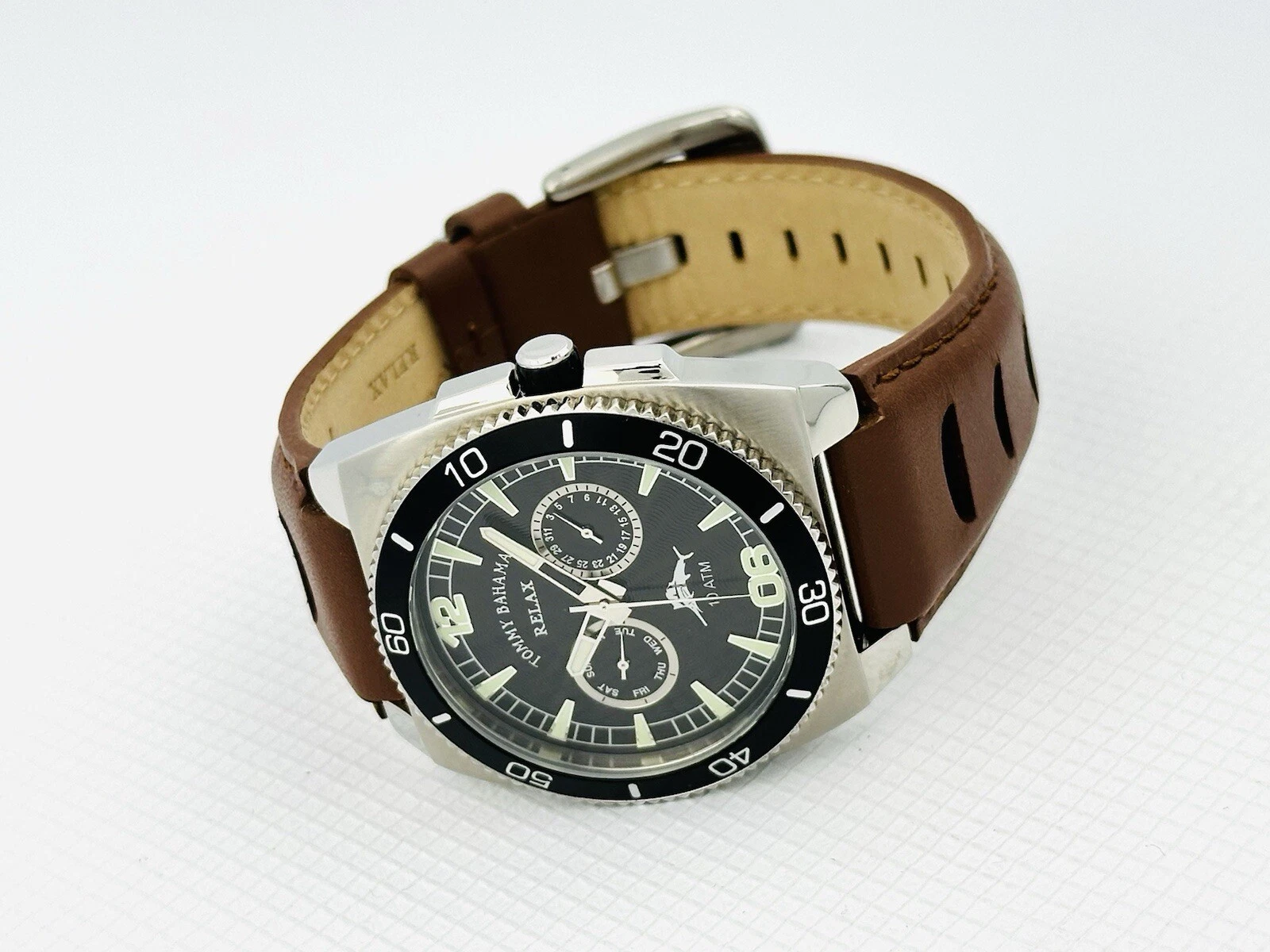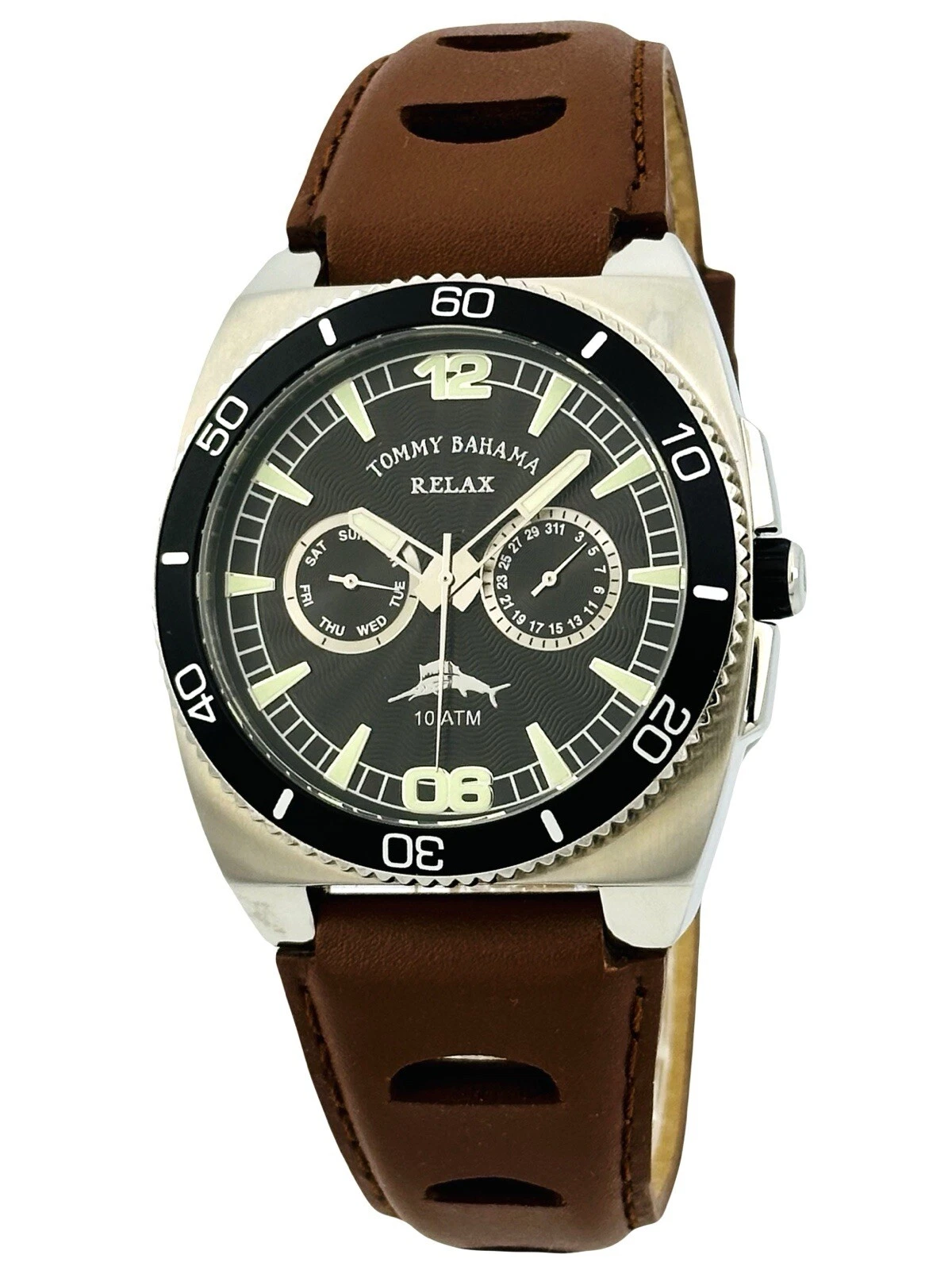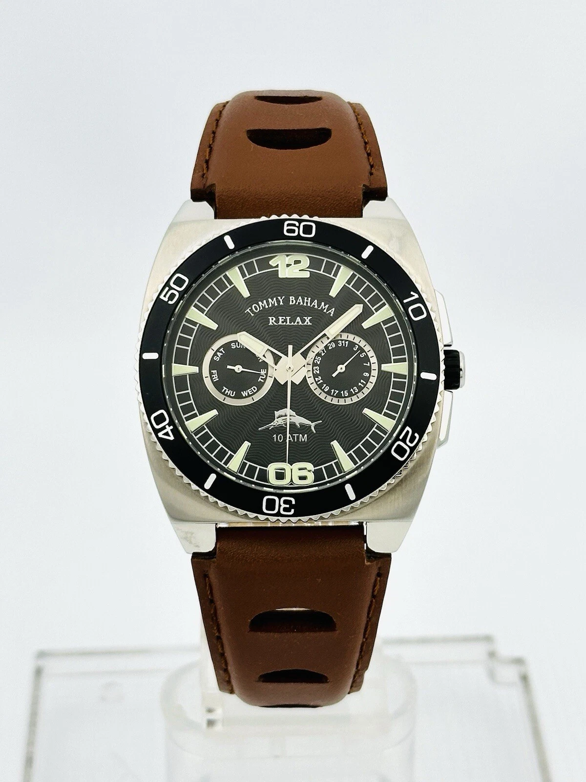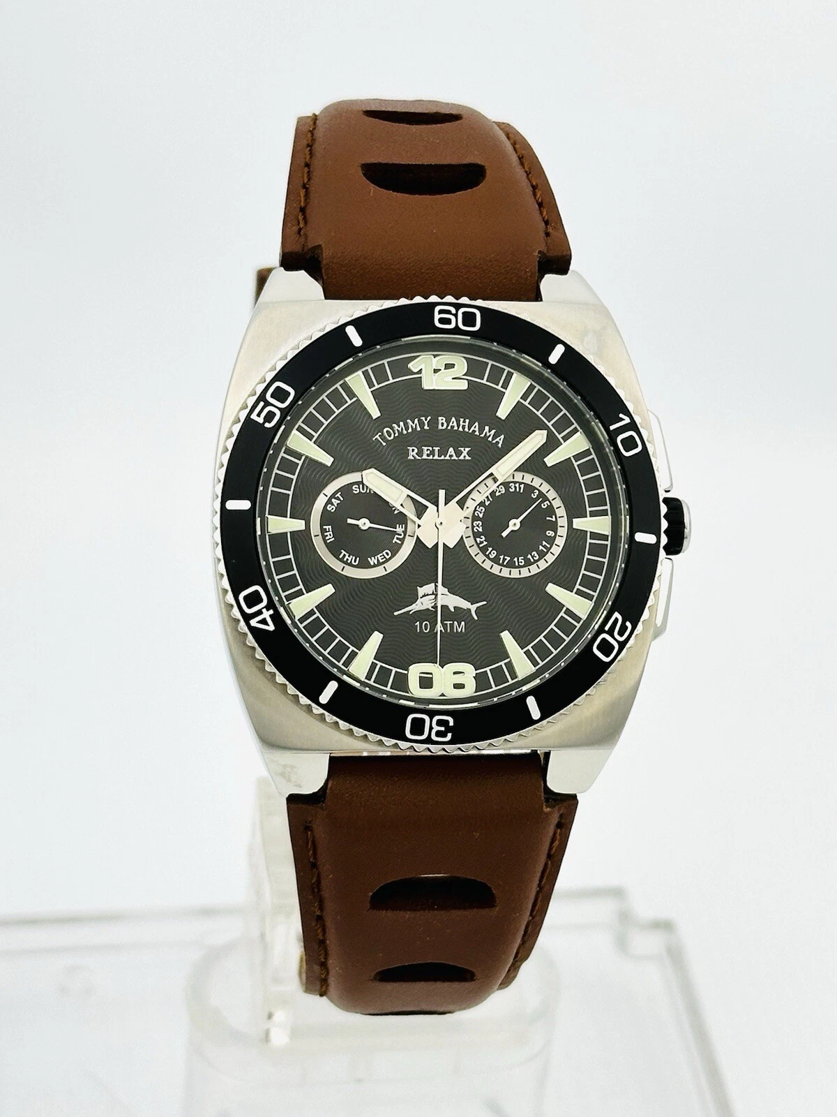 Tommy Bahama RLX1023 SHORE THING BLK Dial Timing Bezel Brown Leather Strap Watch