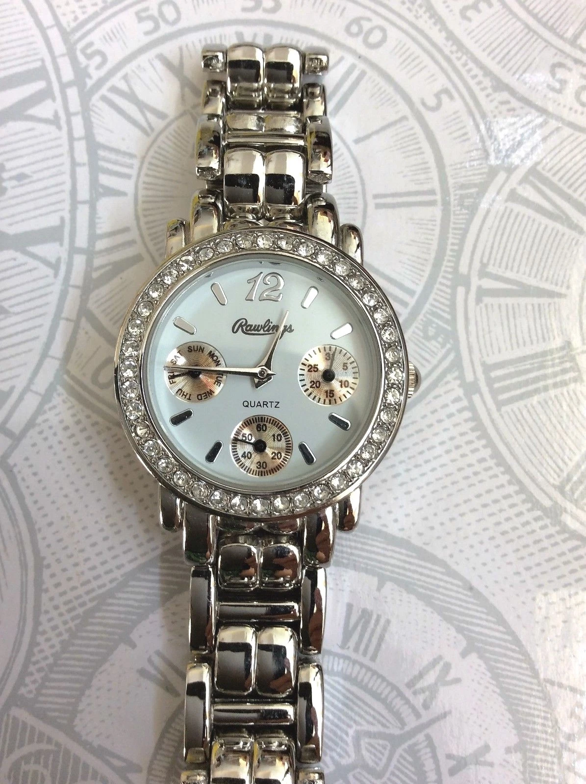Rawlings Silver Women's Watch Crystal Round White Chronograph Dial Silver Band!