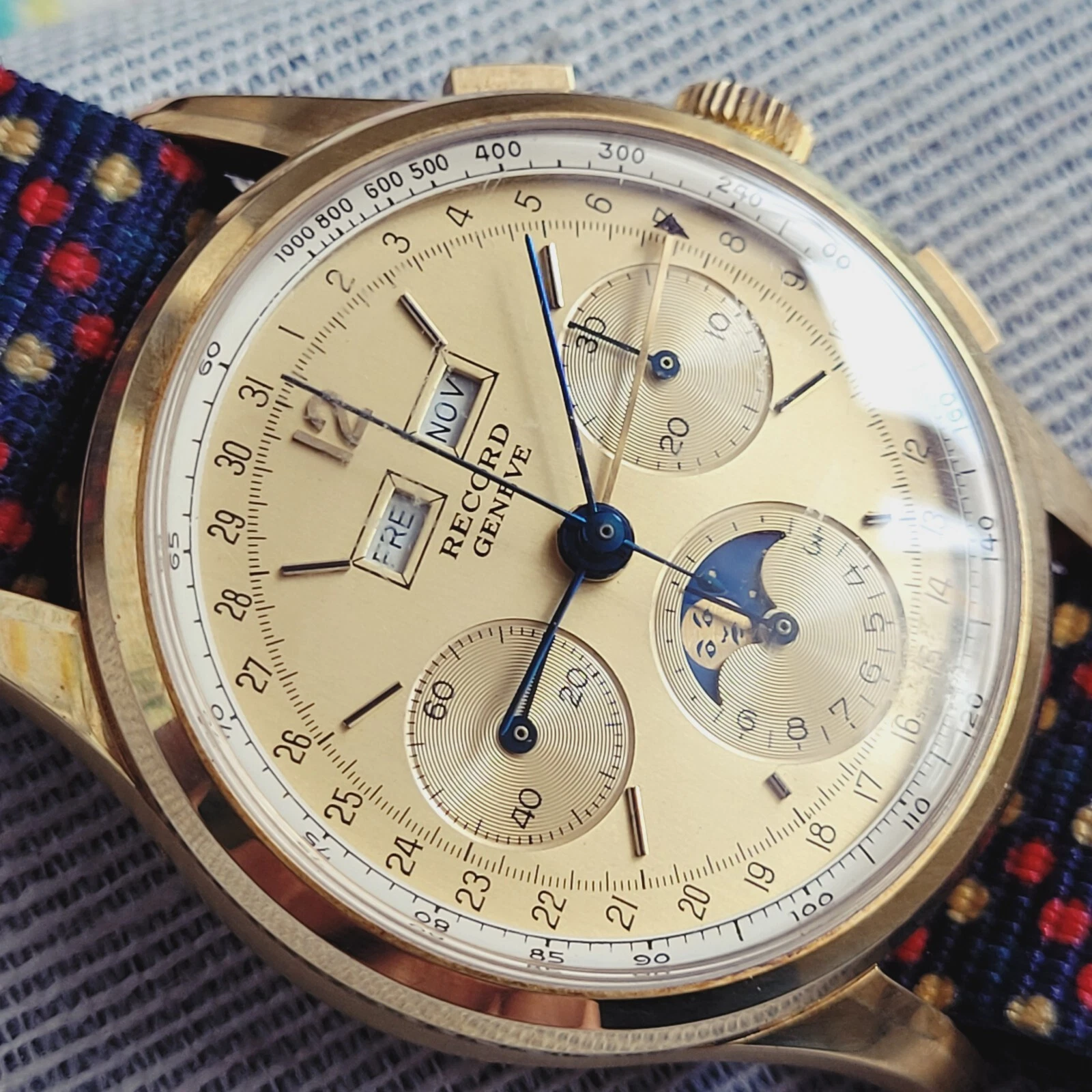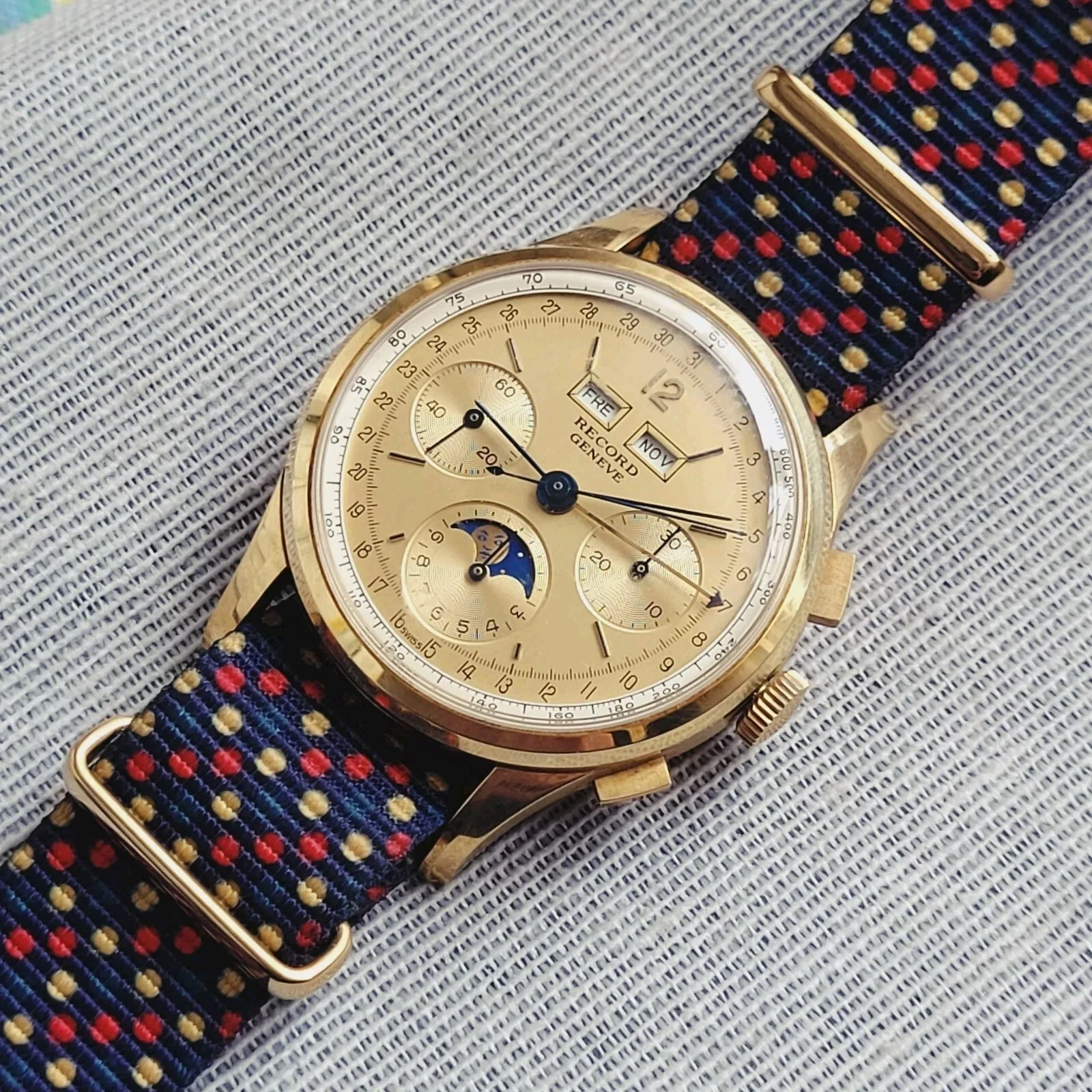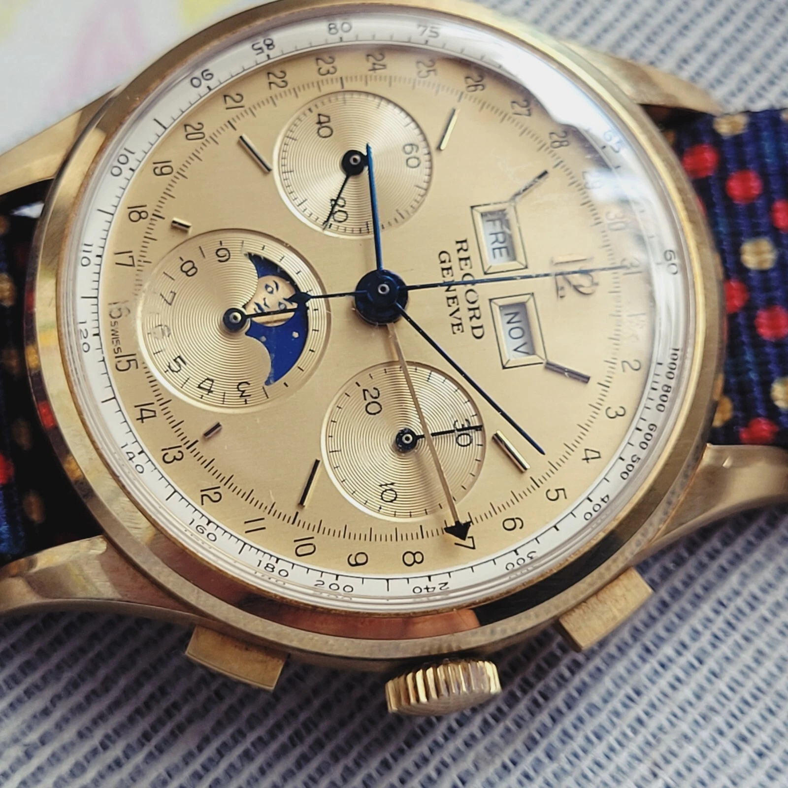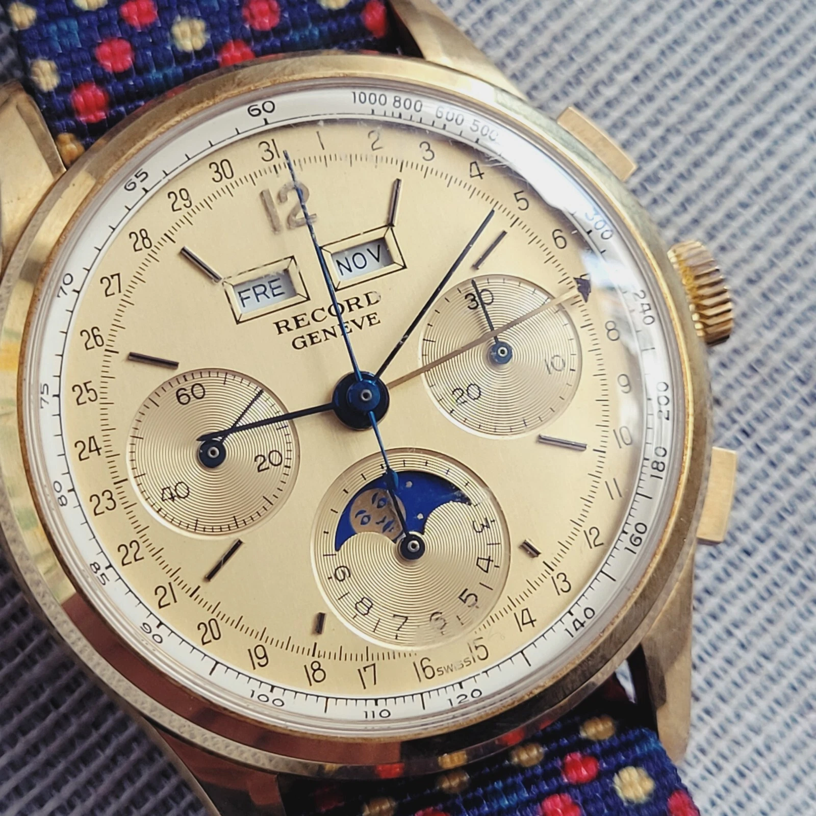 NOS 1950s Record Triple Date Moonphase 18K Gold Chronograph Valjoux 88 Watch