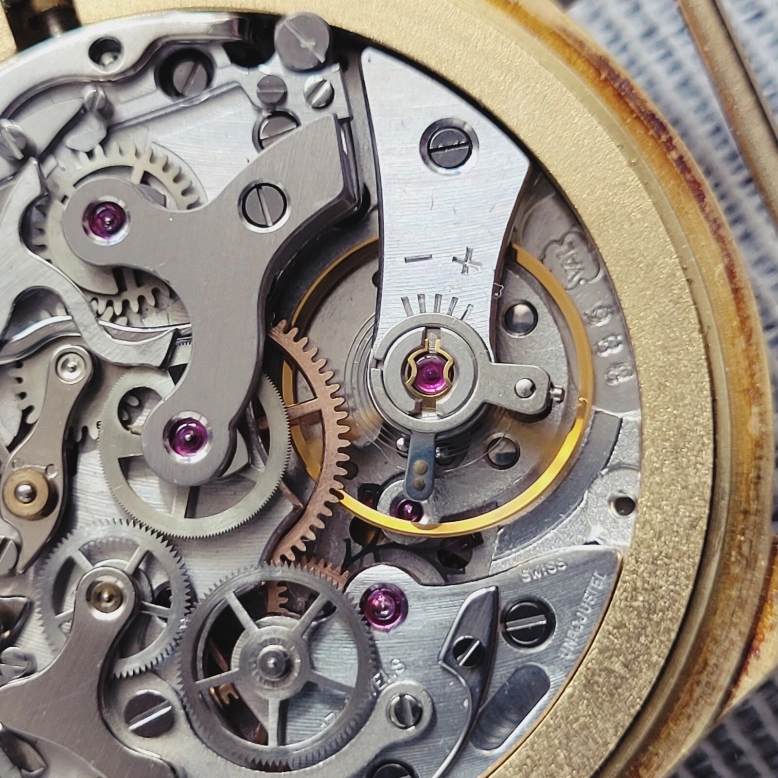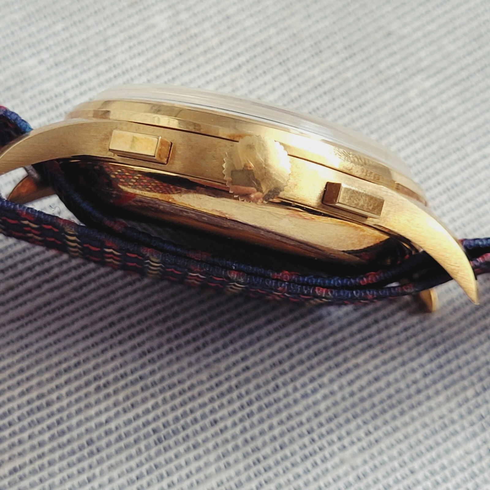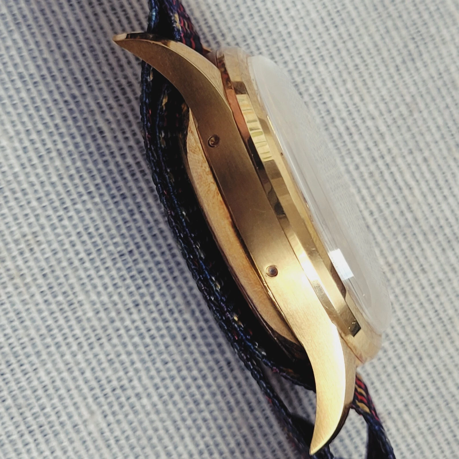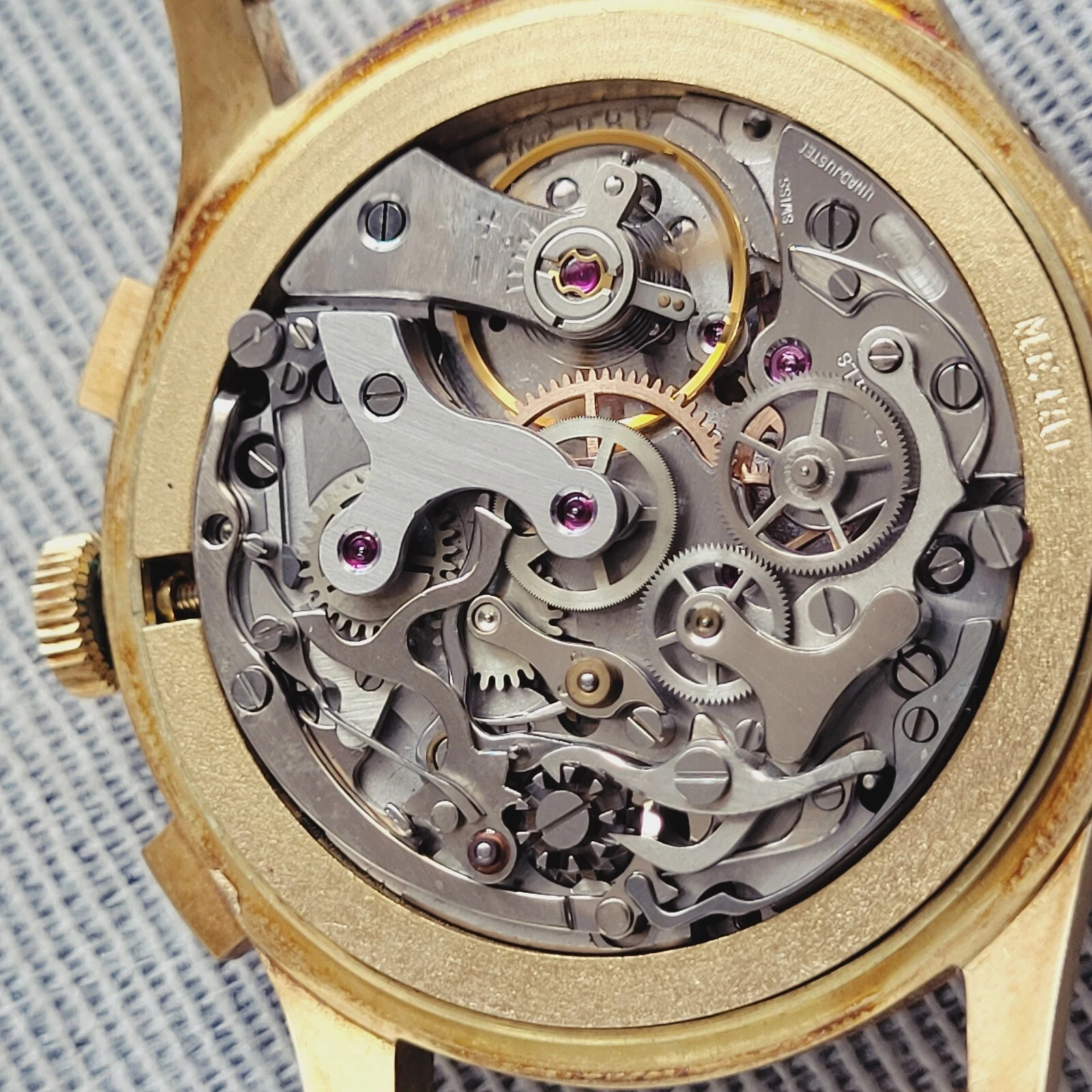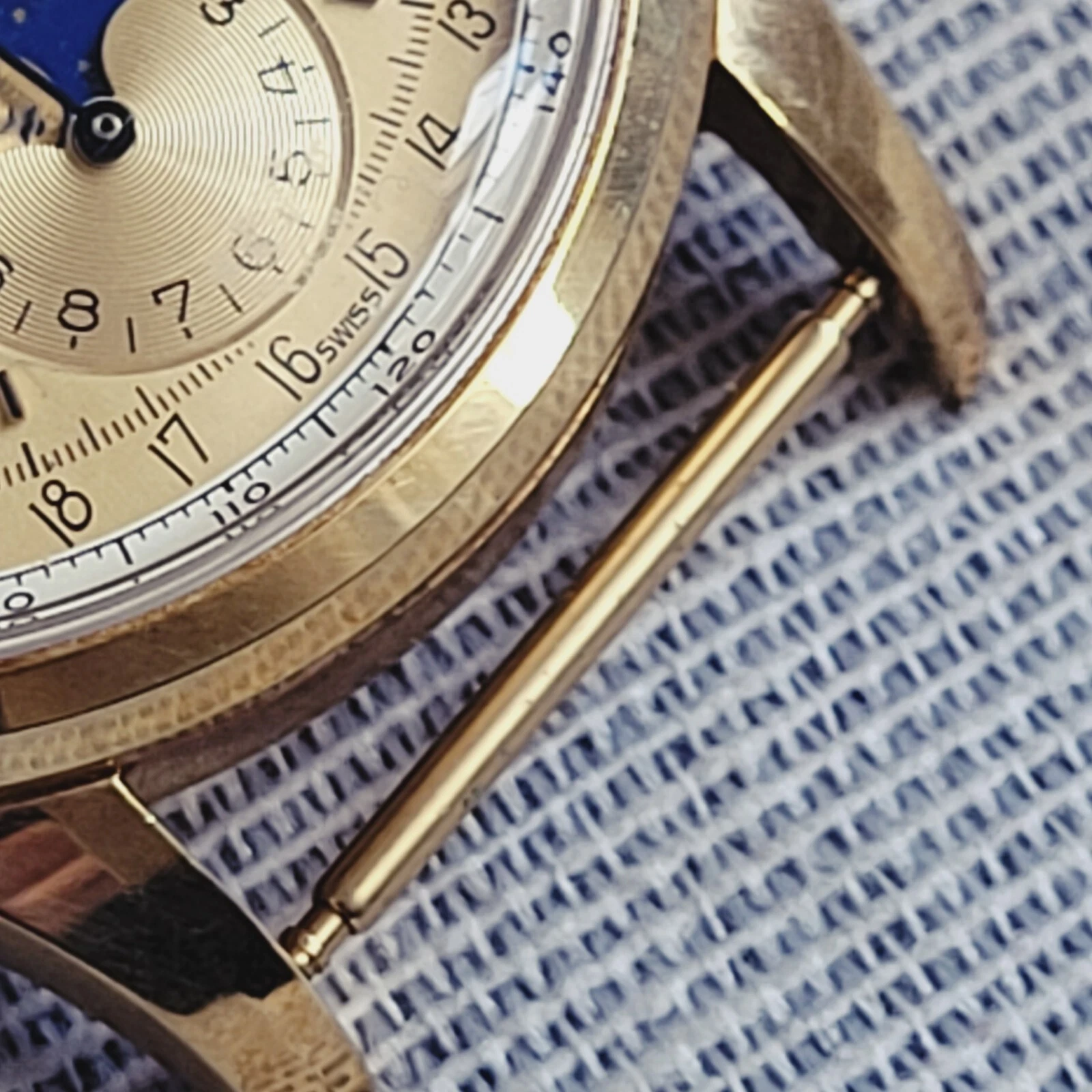 NOS 1950s Record Triple Date Moonphase 18K Gold Chronograph Valjoux 88 Watch