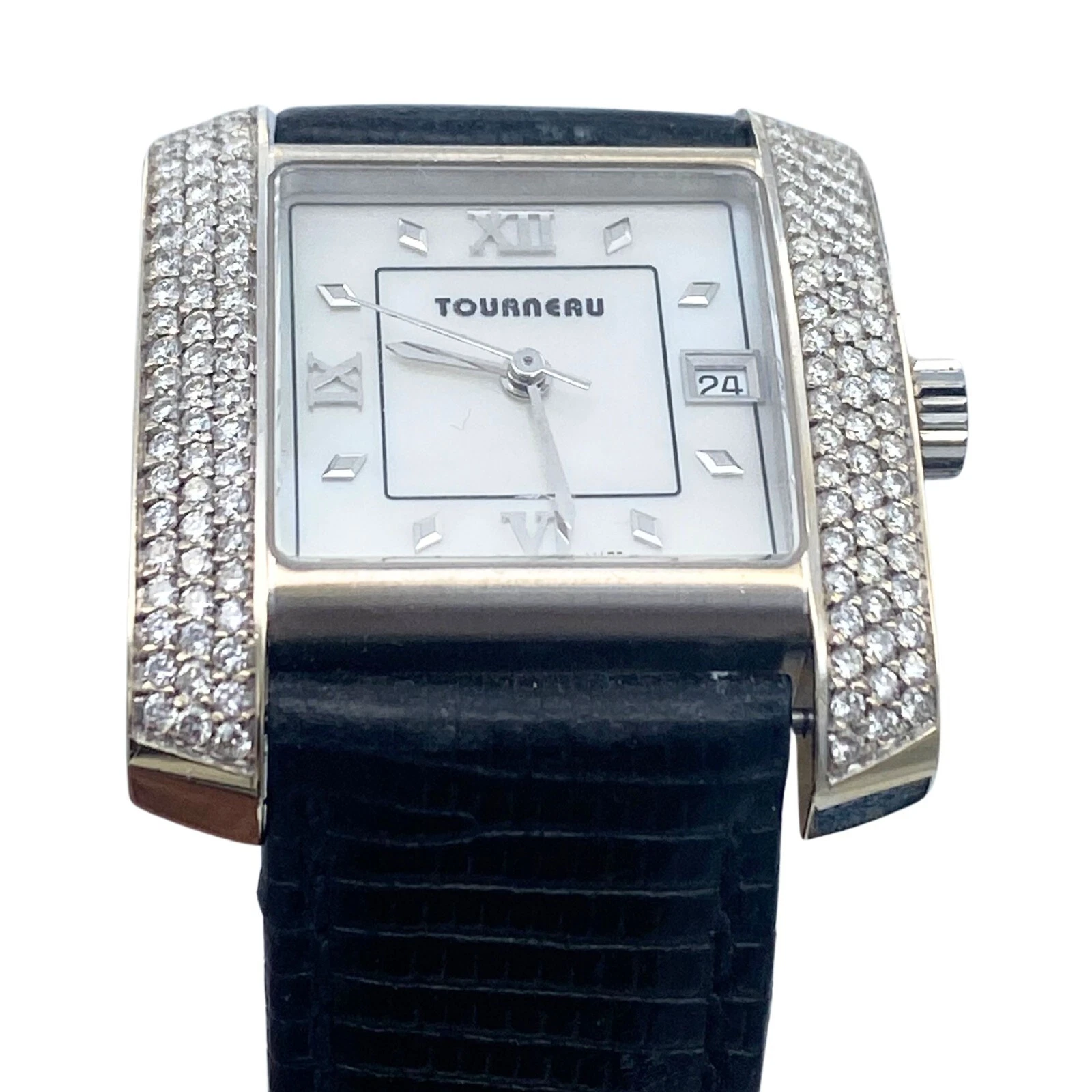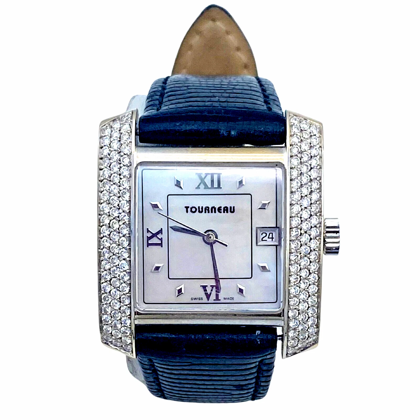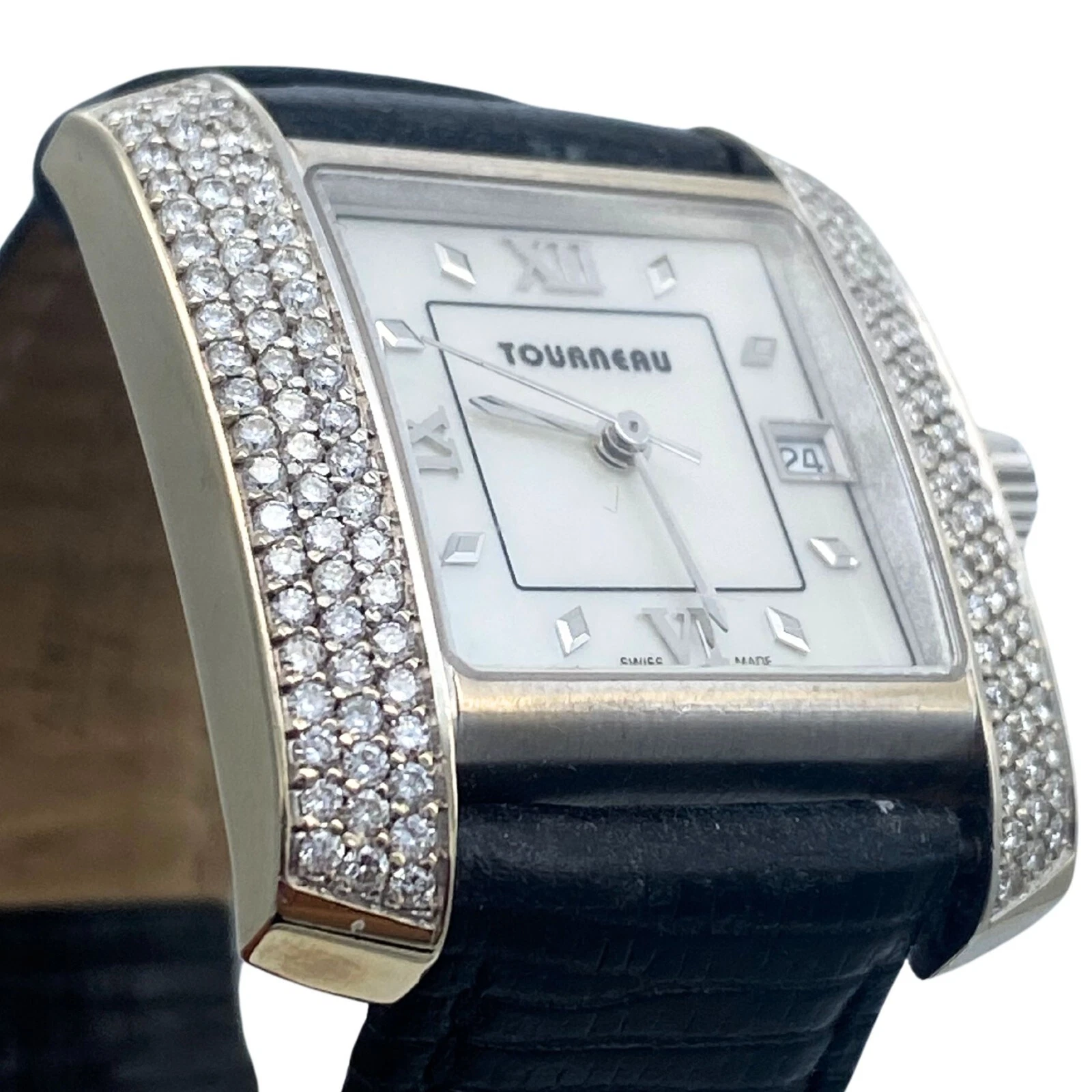 Tourneau Ladies 18k White Gold  tank watch with diamond bezel and MOP dial