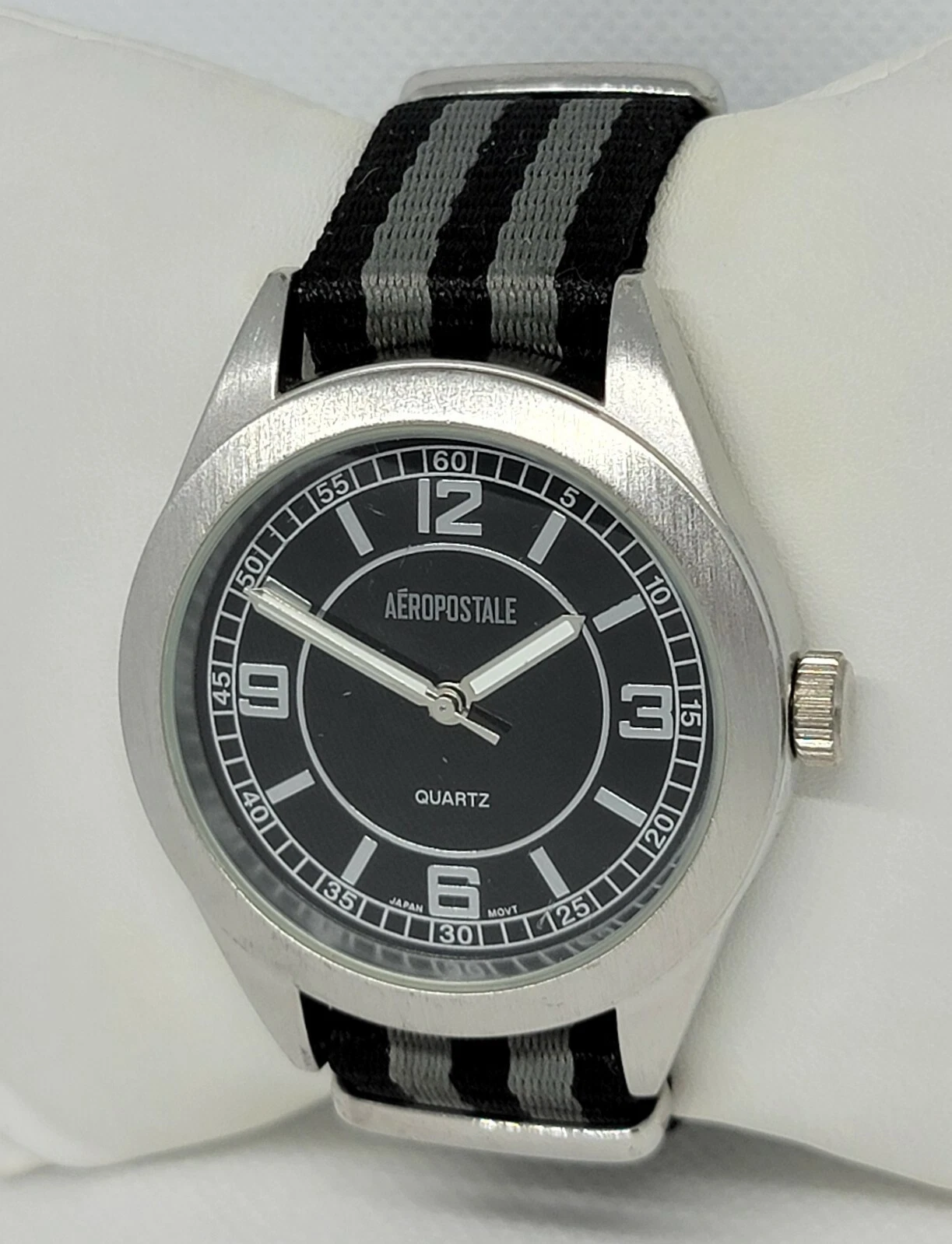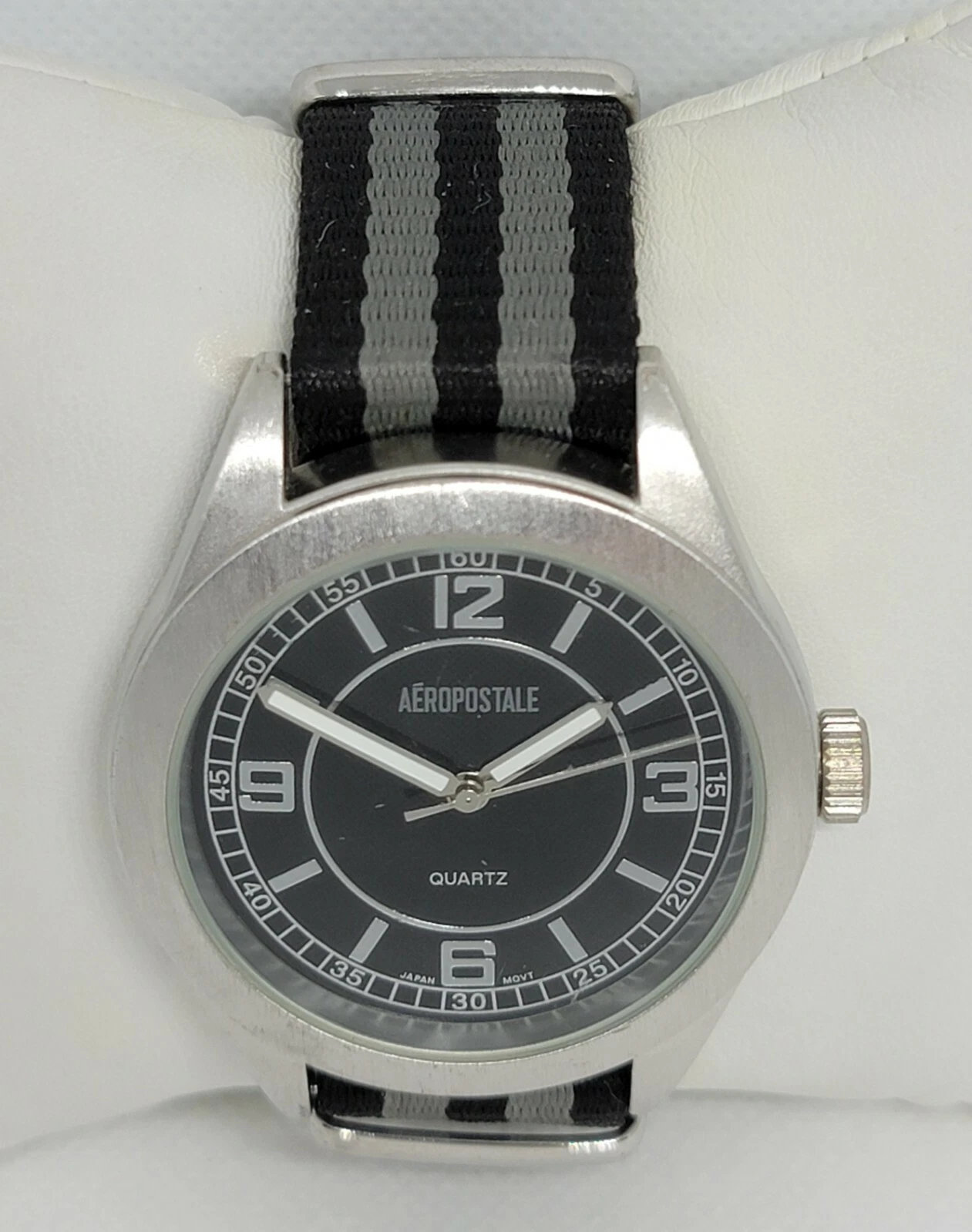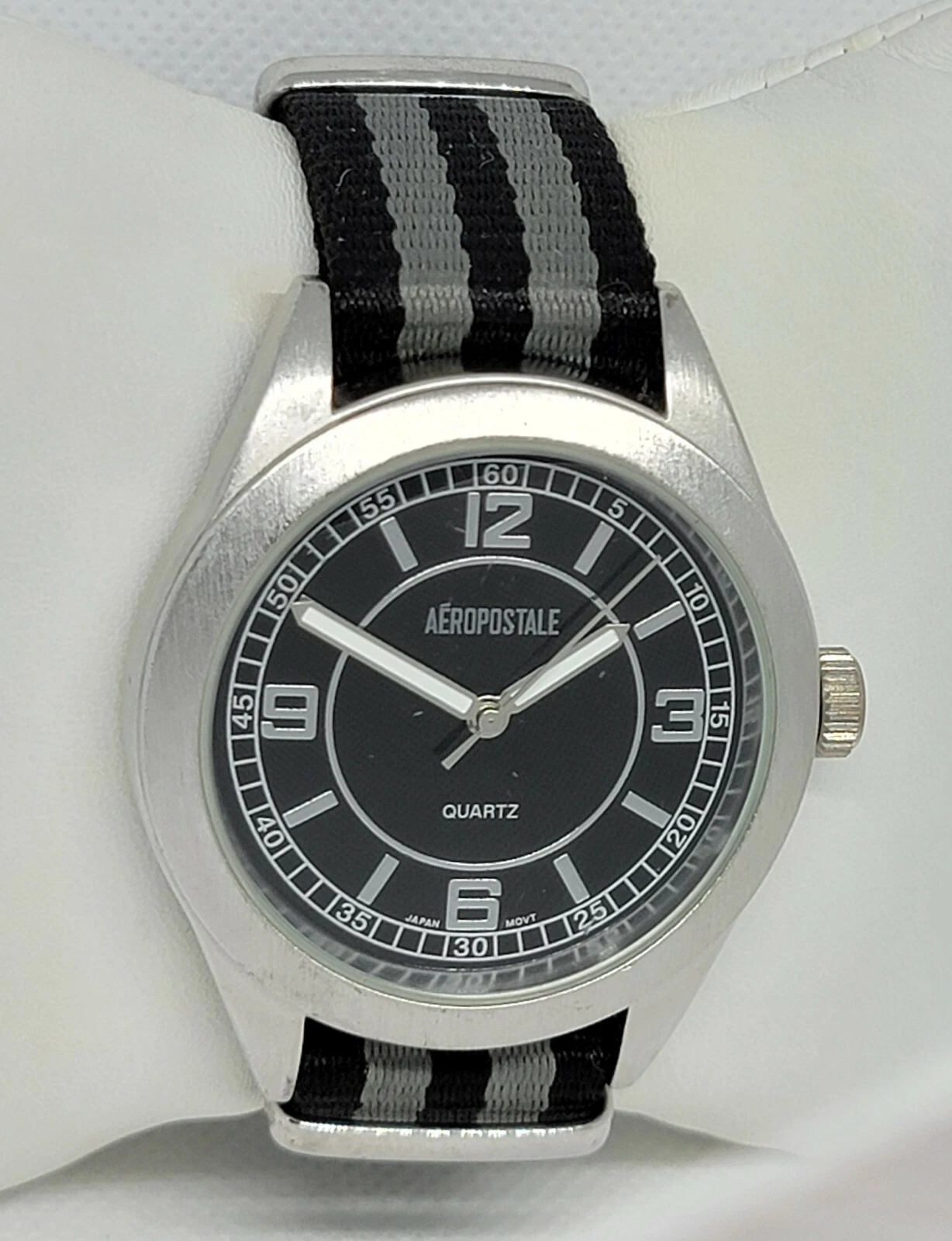 Mens Aeropostale Silver Tone Black Dial Gray Black Nylon Strap Analog Watch E7