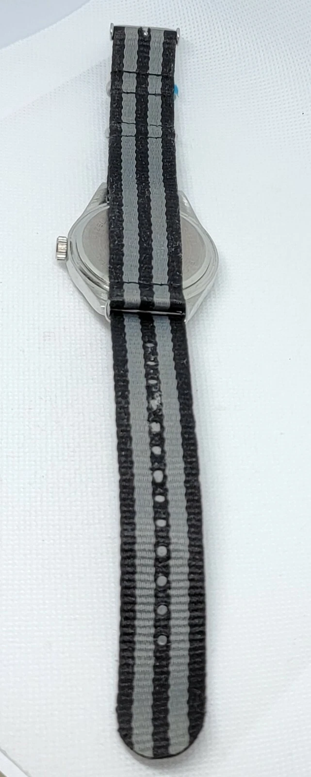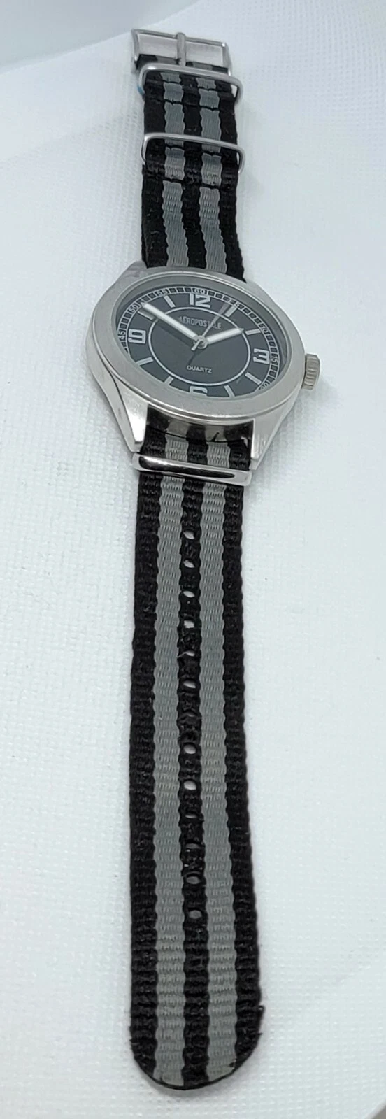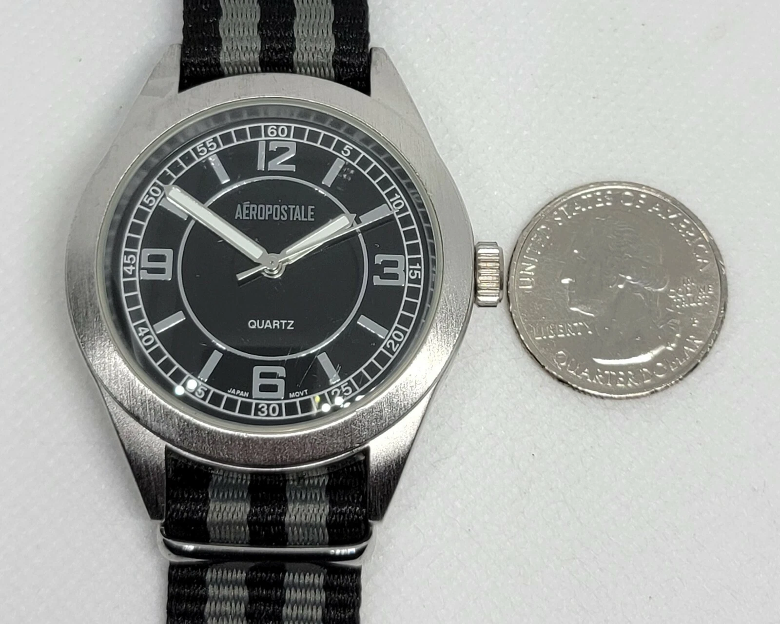 Mens Aeropostale Silver Tone Black Dial Gray Black Nylon Strap Analog Watch E7