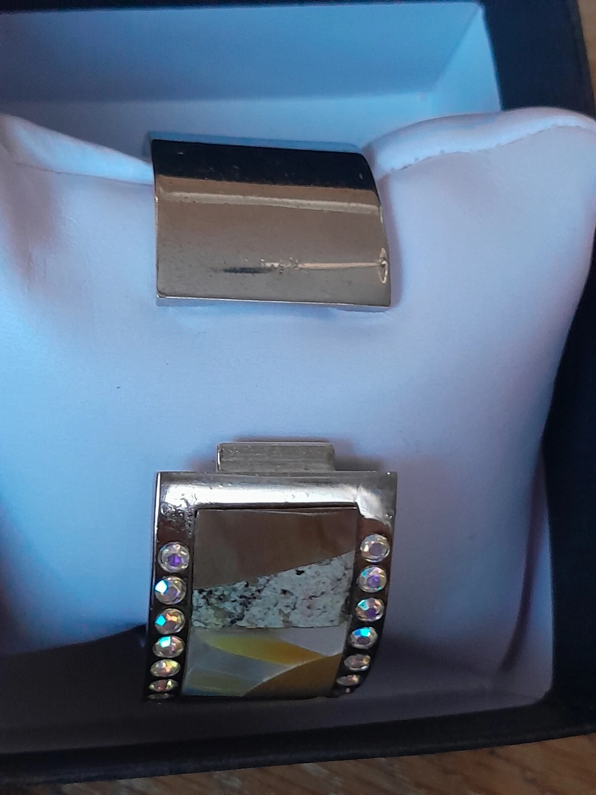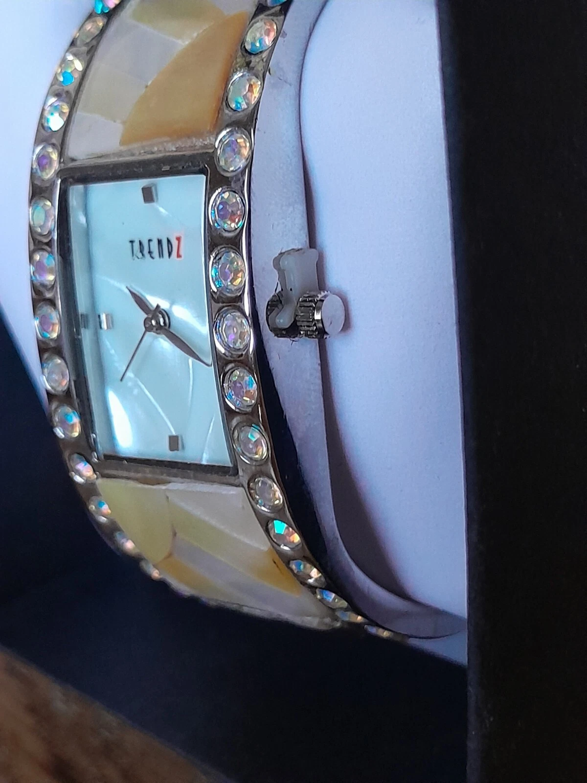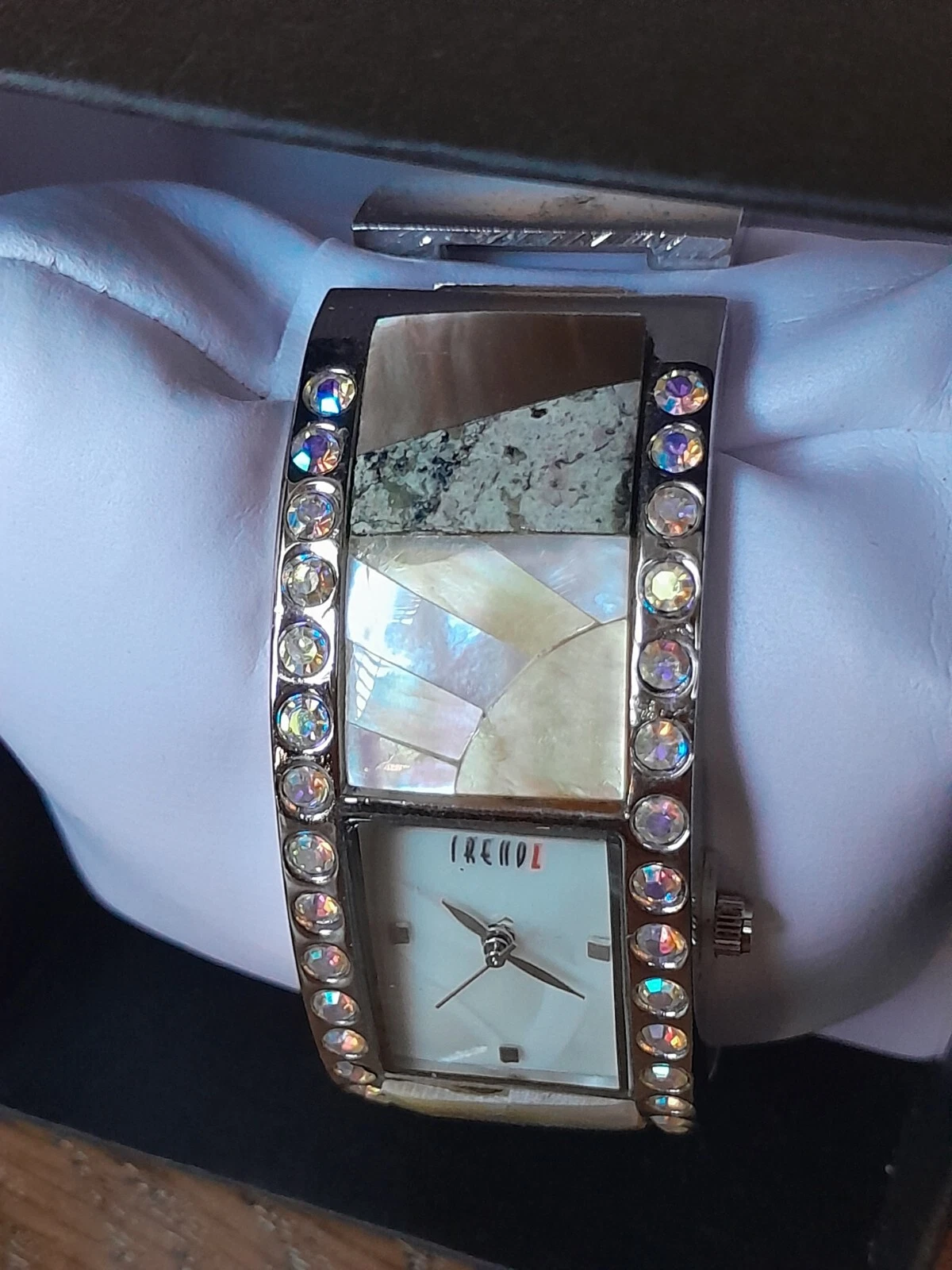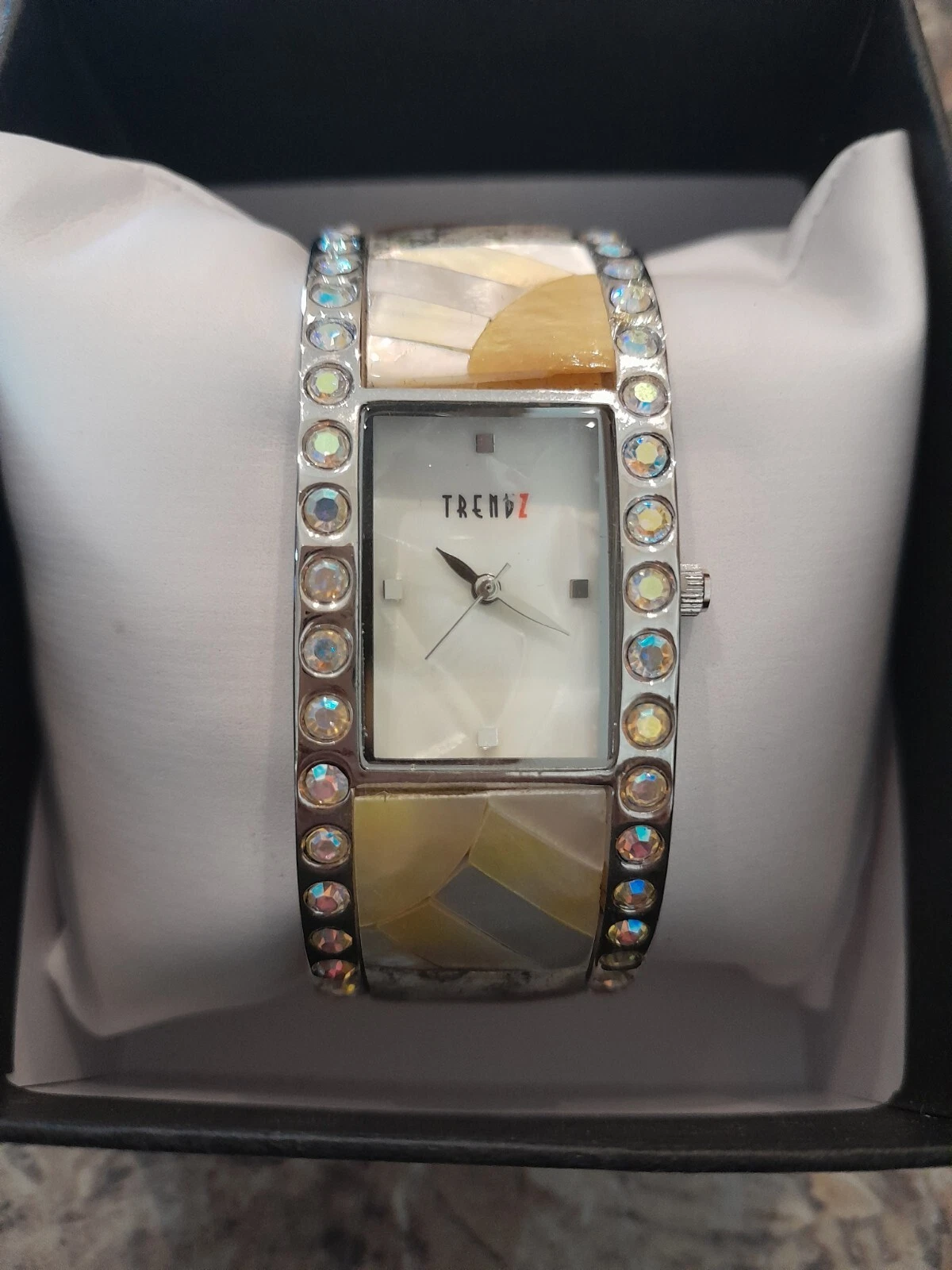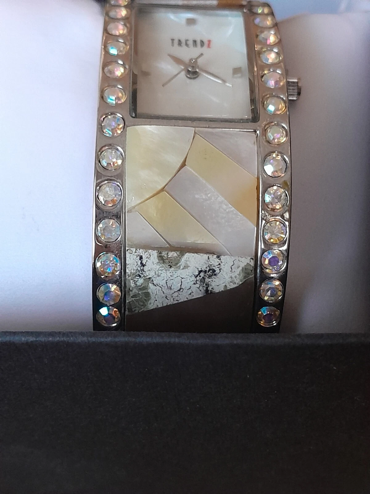 Trendz NIB Women's Watch Mother Of Pearl & Rhinestone Hinged Cuff Bracelet NOB