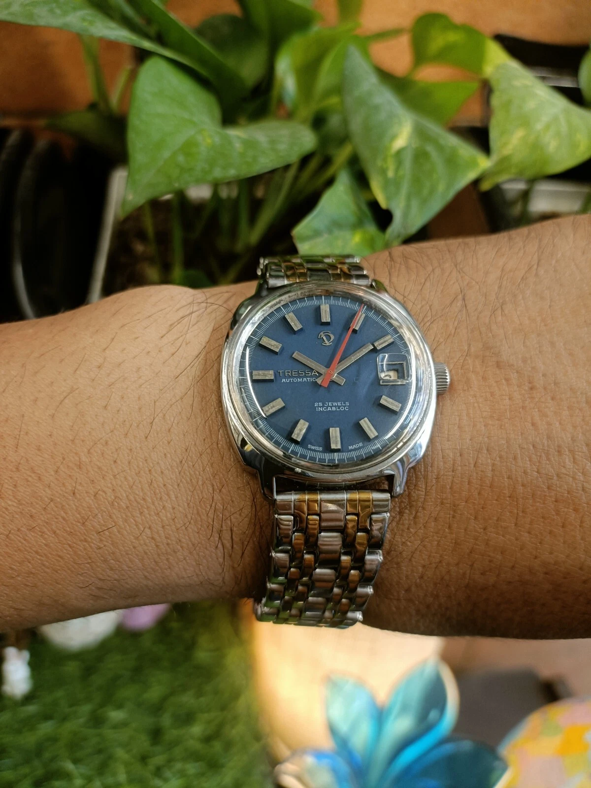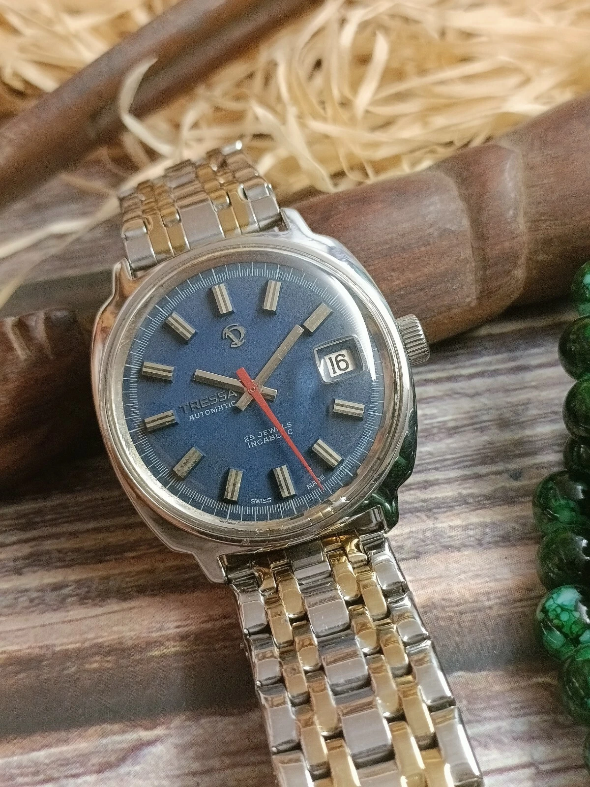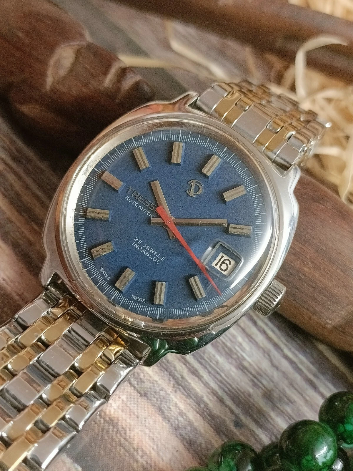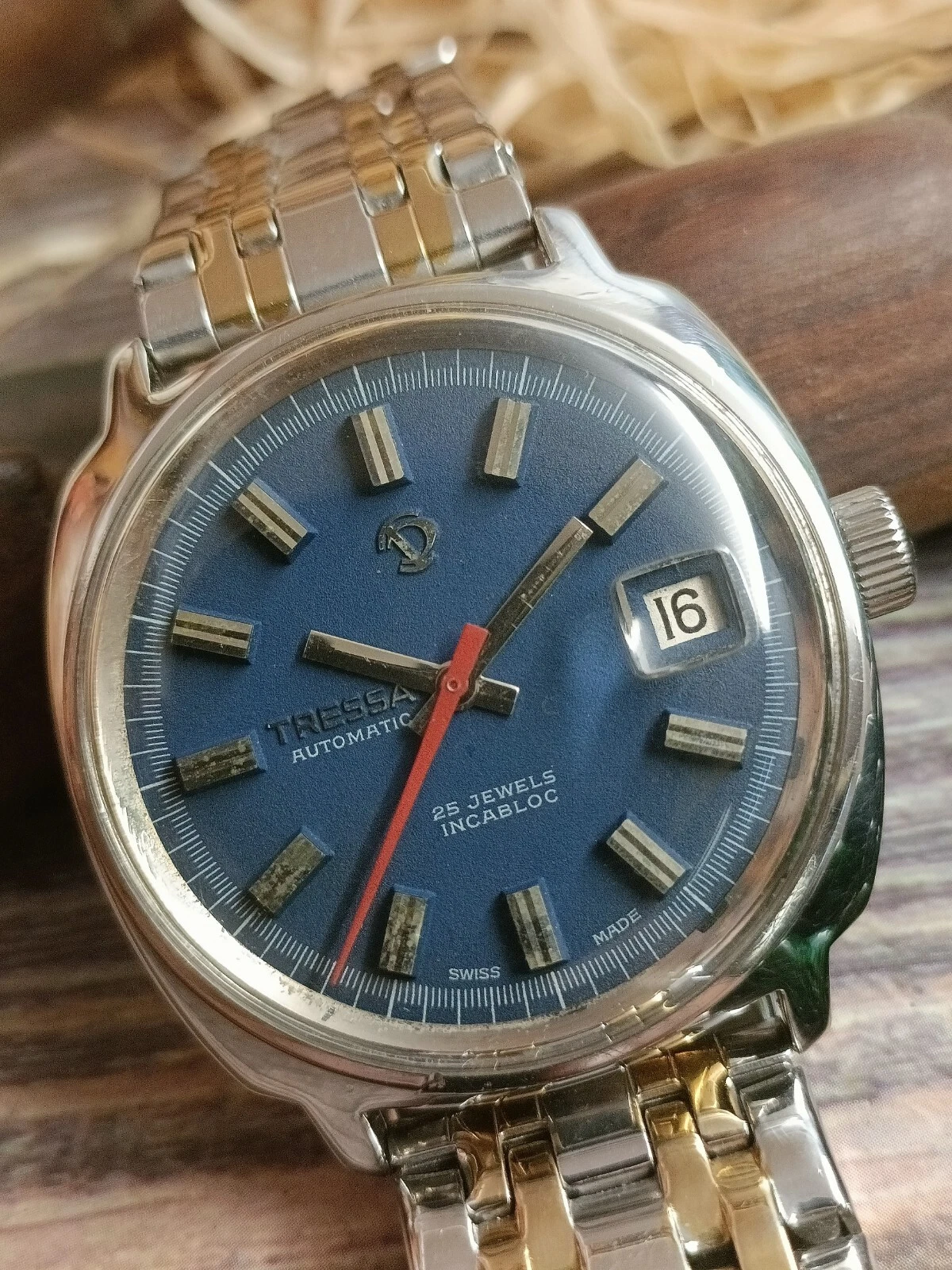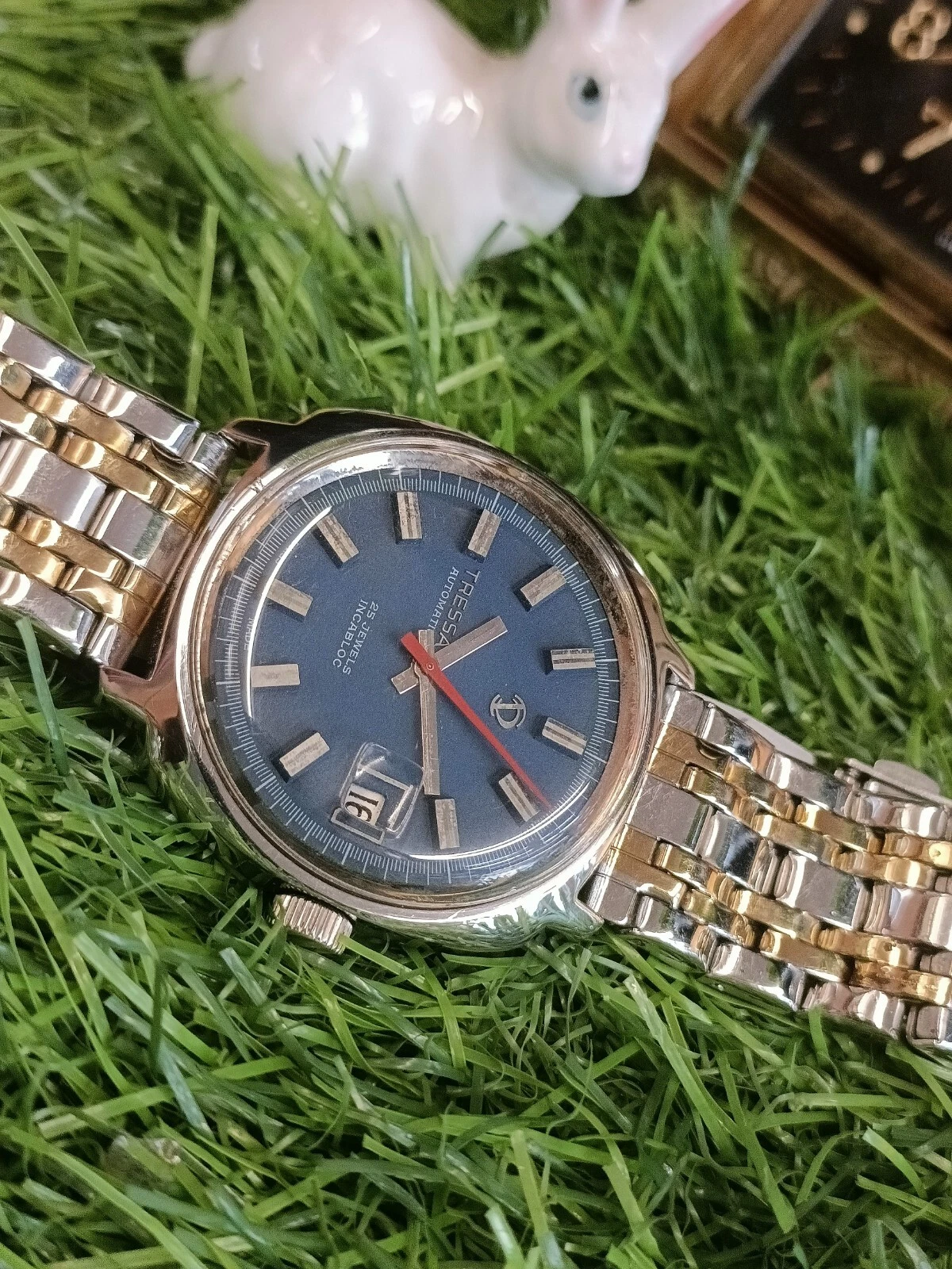 AUTHENTIC TRESSA AUTOMATIC 25 JEWELS INCABLOC BLUE DIAL DATE SWISS MEN'S VINTAGE