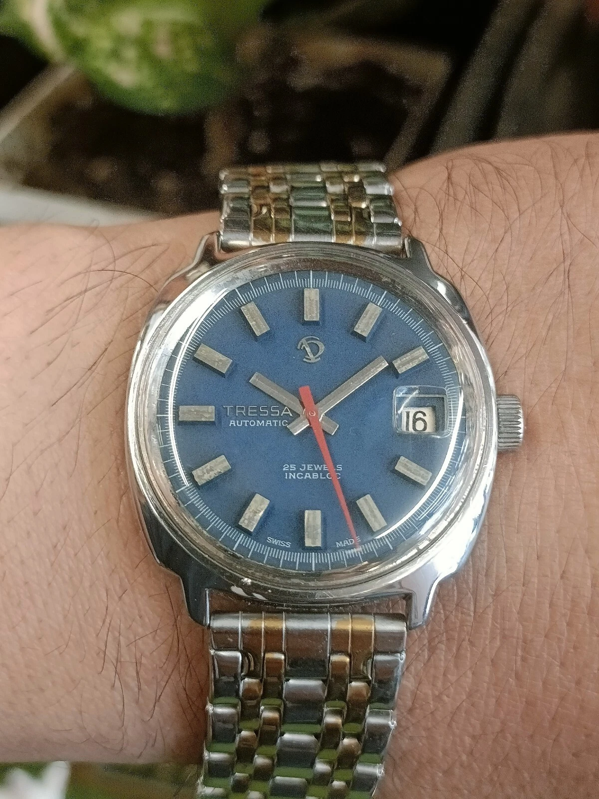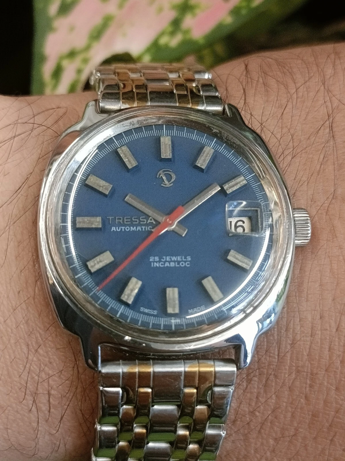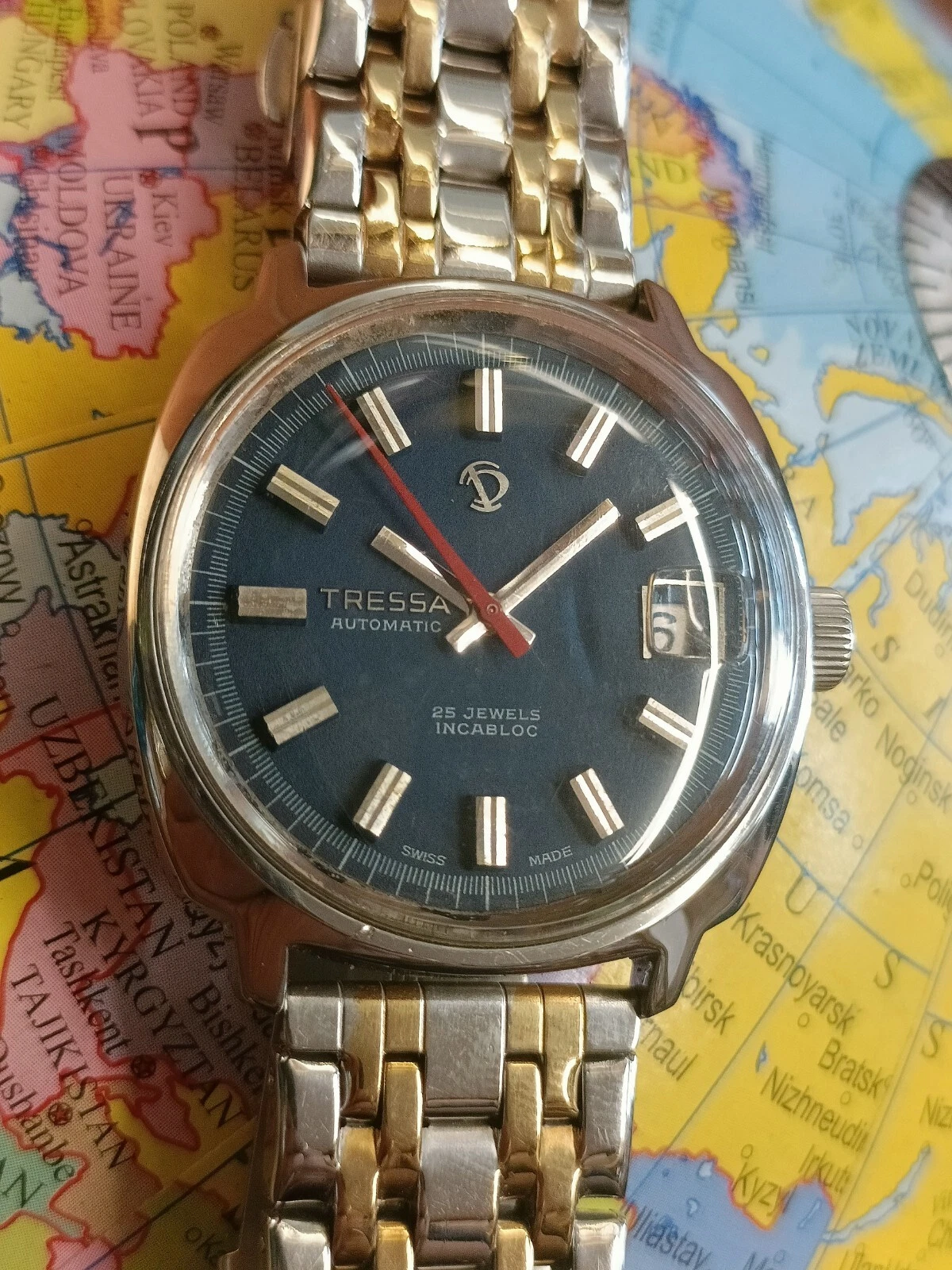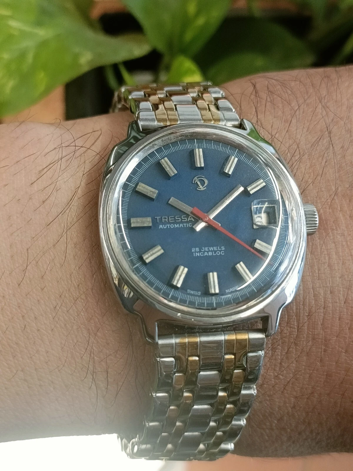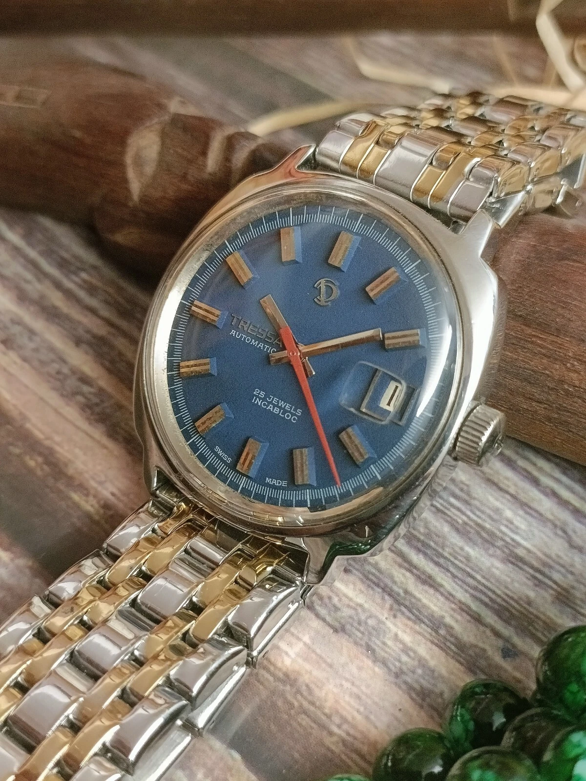 AUTHENTIC TRESSA AUTOMATIC 25 JEWELS INCABLOC BLUE DIAL DATE SWISS MEN'S VINTAGE