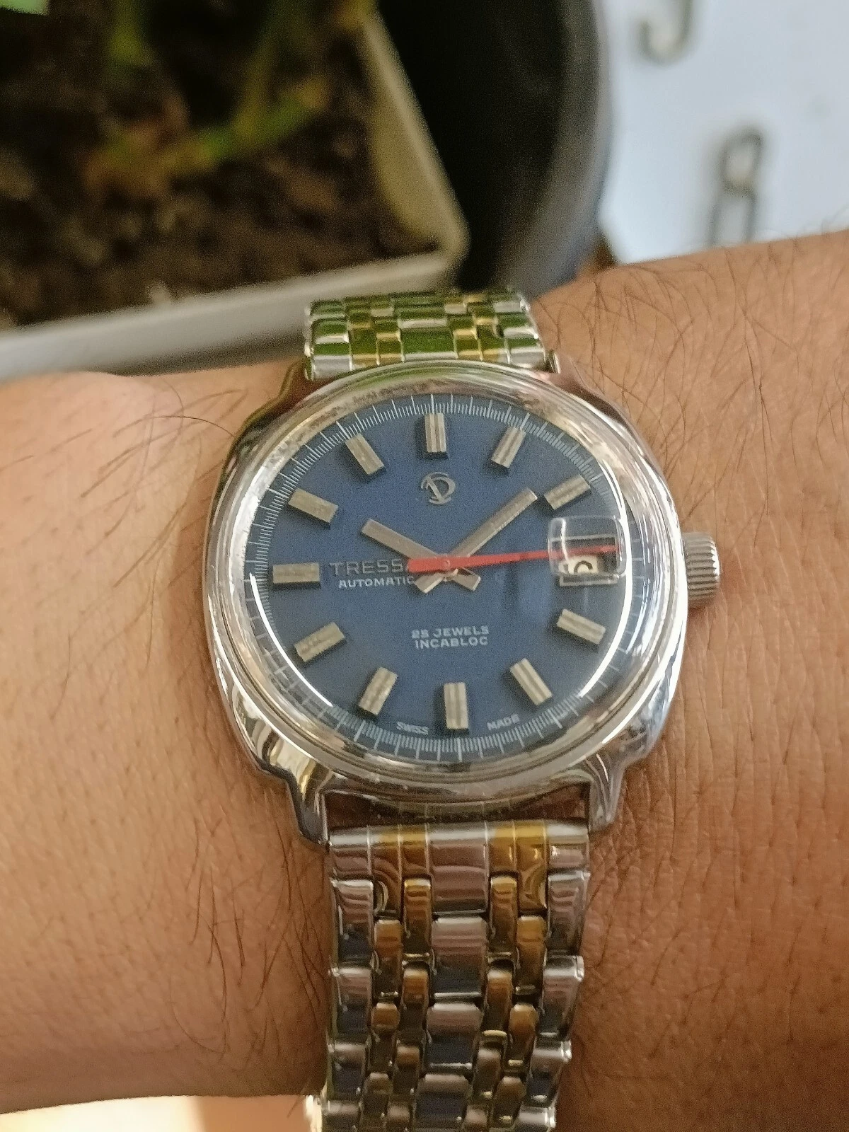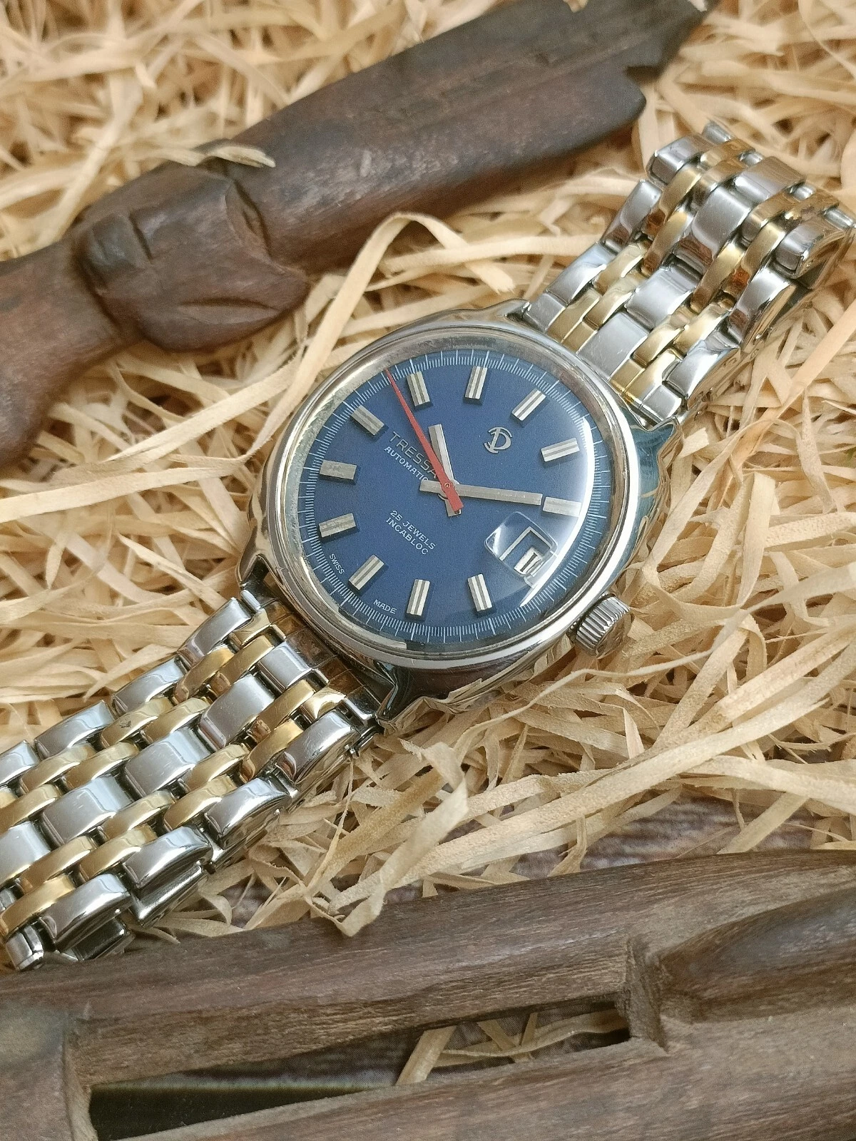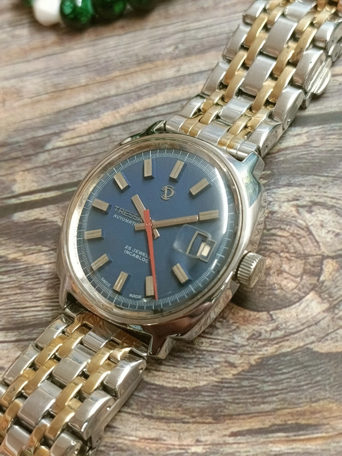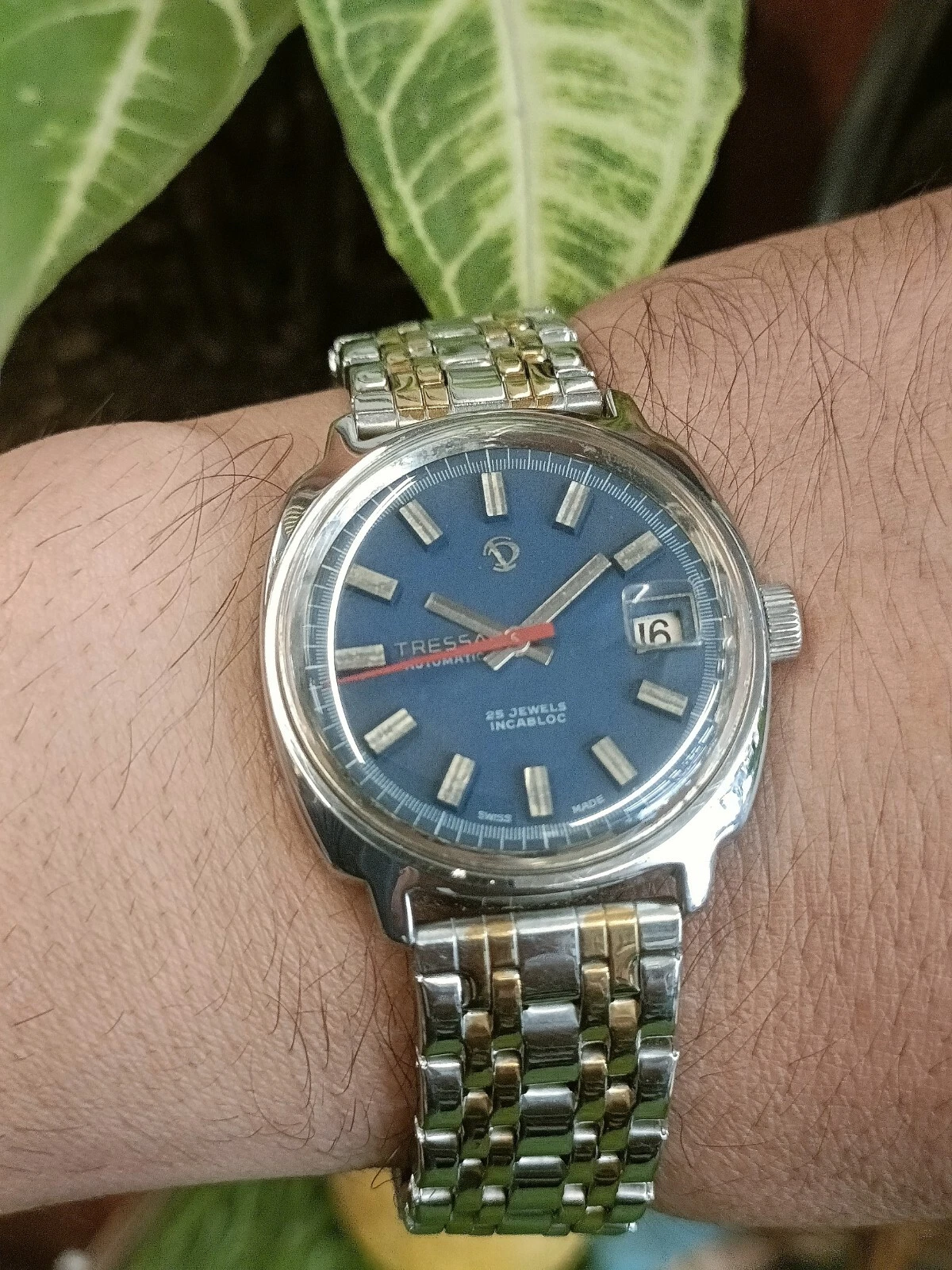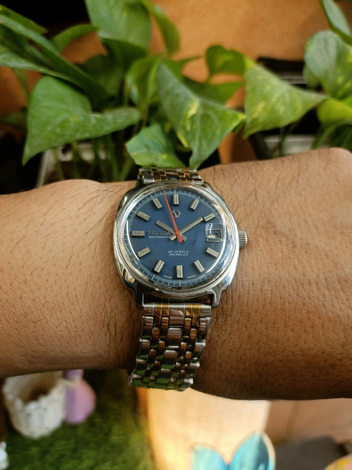 AUTHENTIC TRESSA AUTOMATIC 25 JEWELS INCABLOC BLUE DIAL DATE SWISS MEN'S VINTAGE