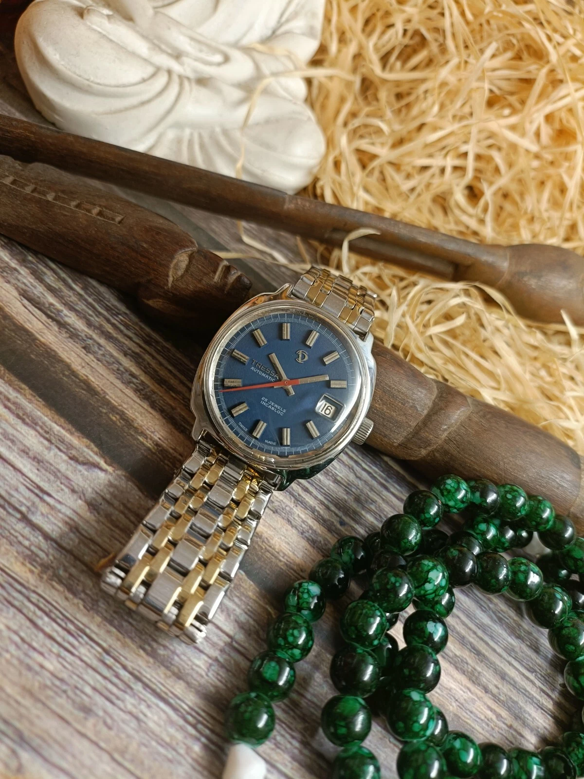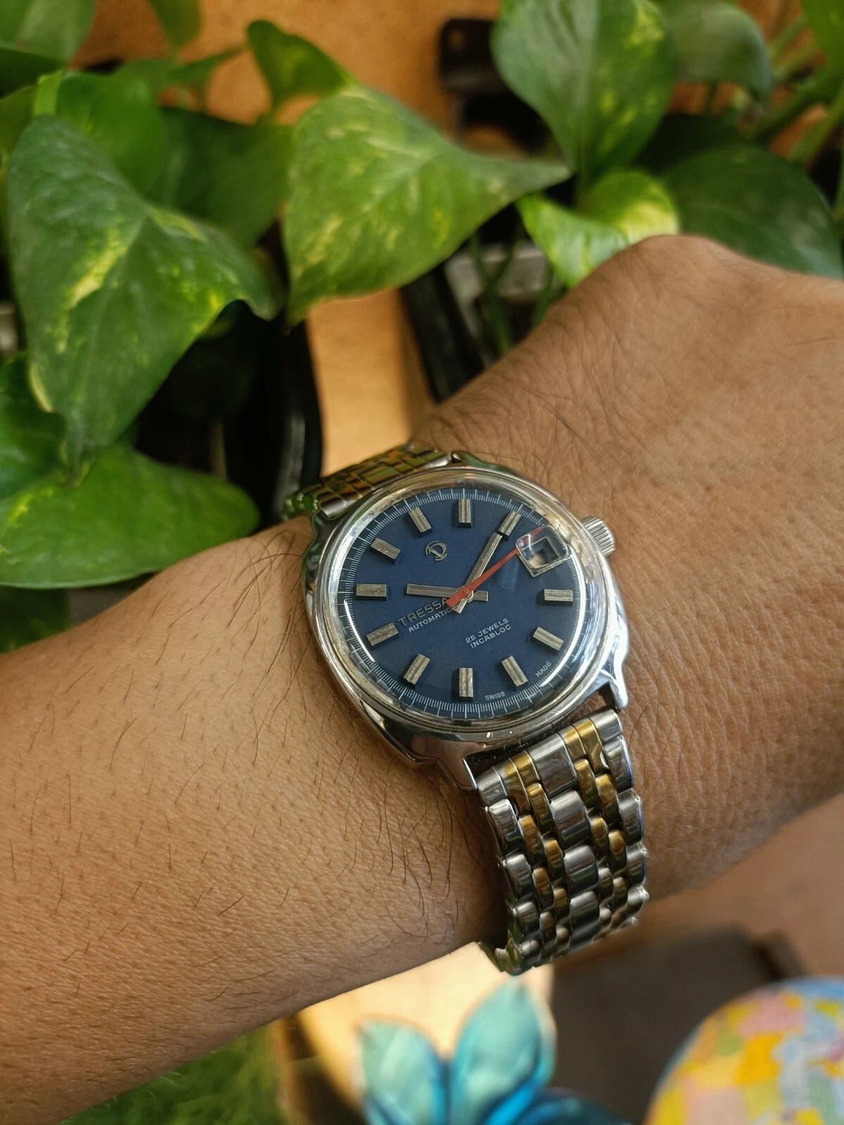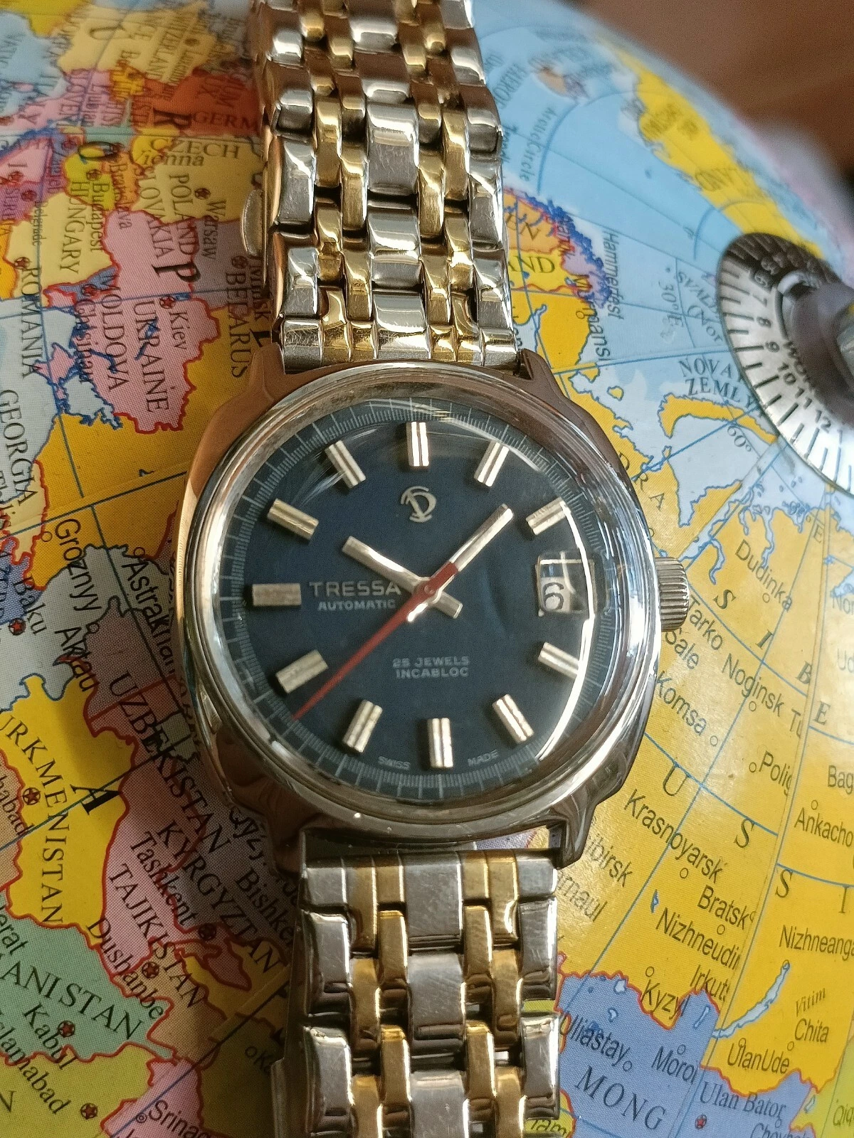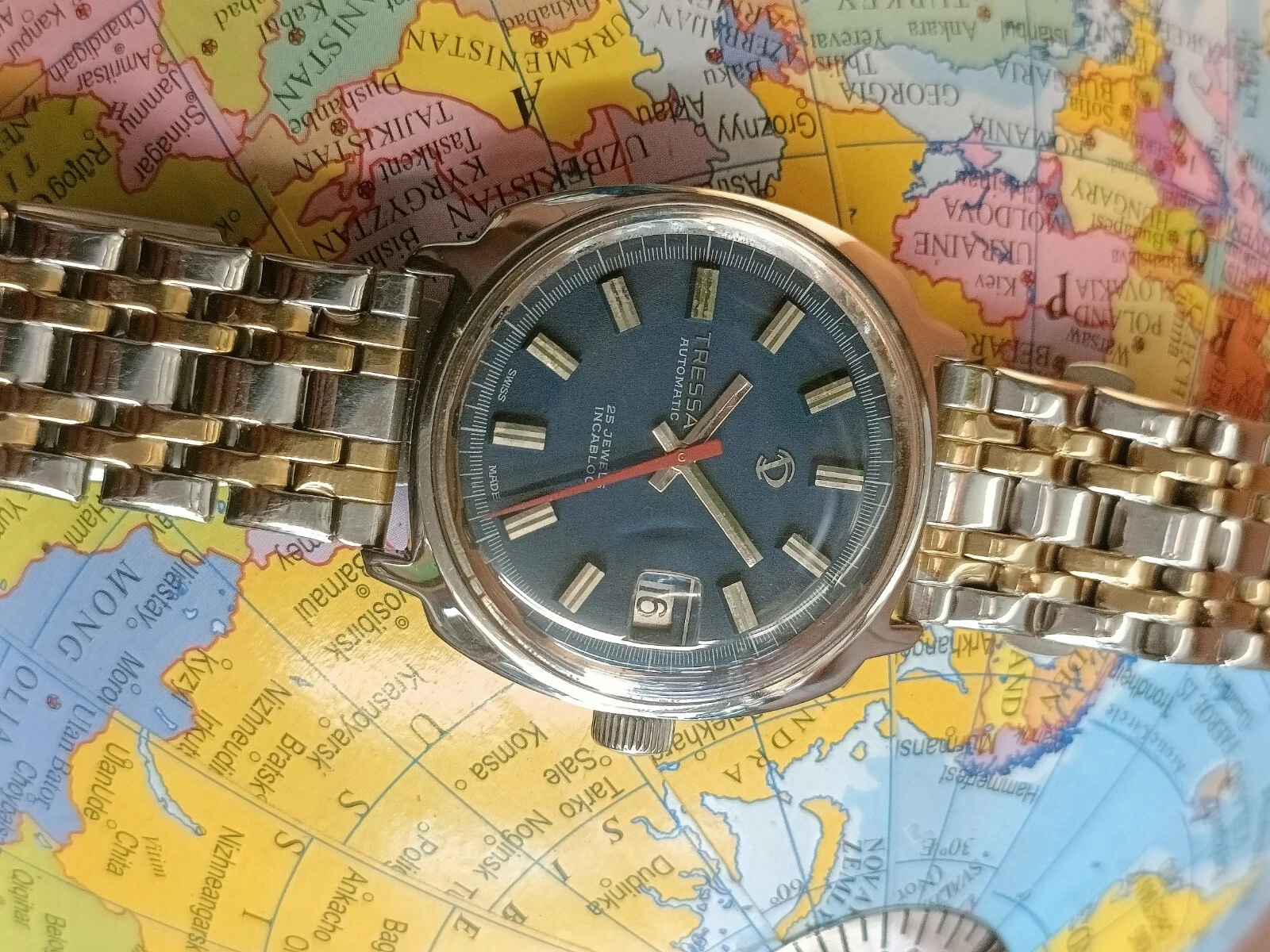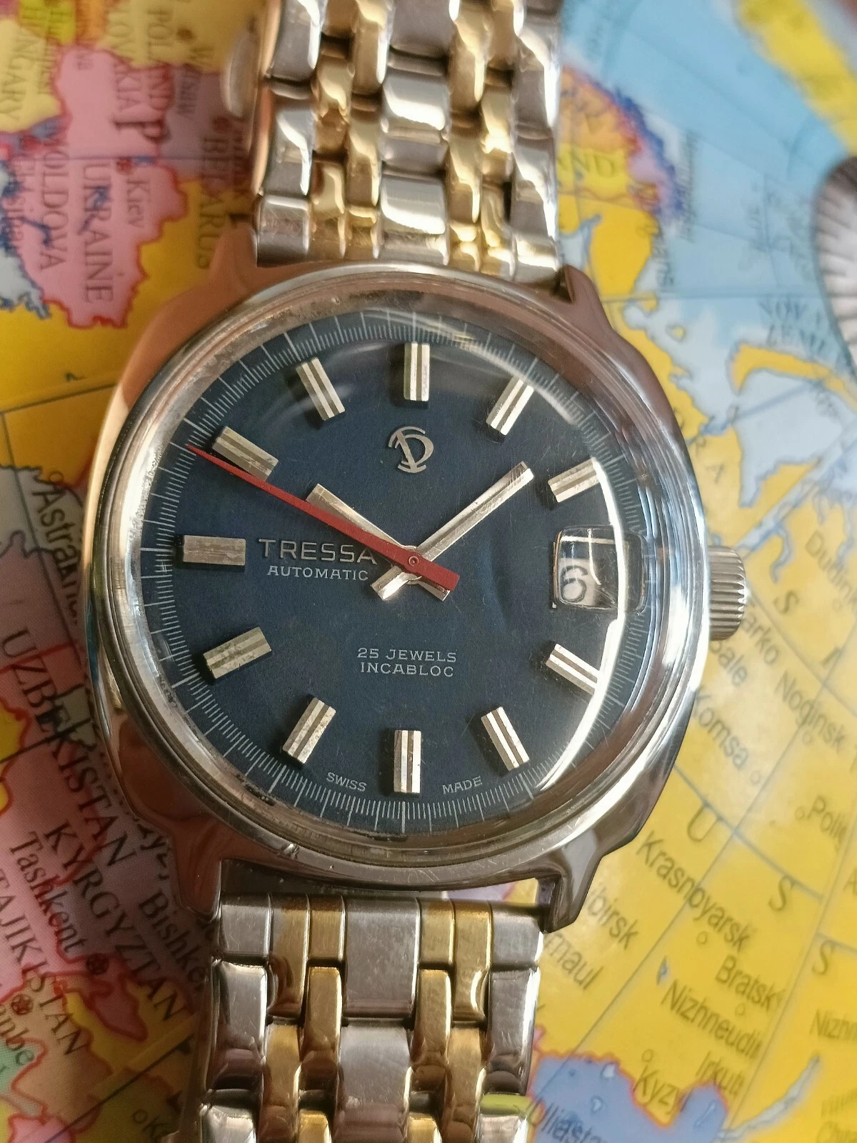 AUTHENTIC TRESSA AUTOMATIC 25 JEWELS INCABLOC BLUE DIAL DATE SWISS MEN'S VINTAGE
