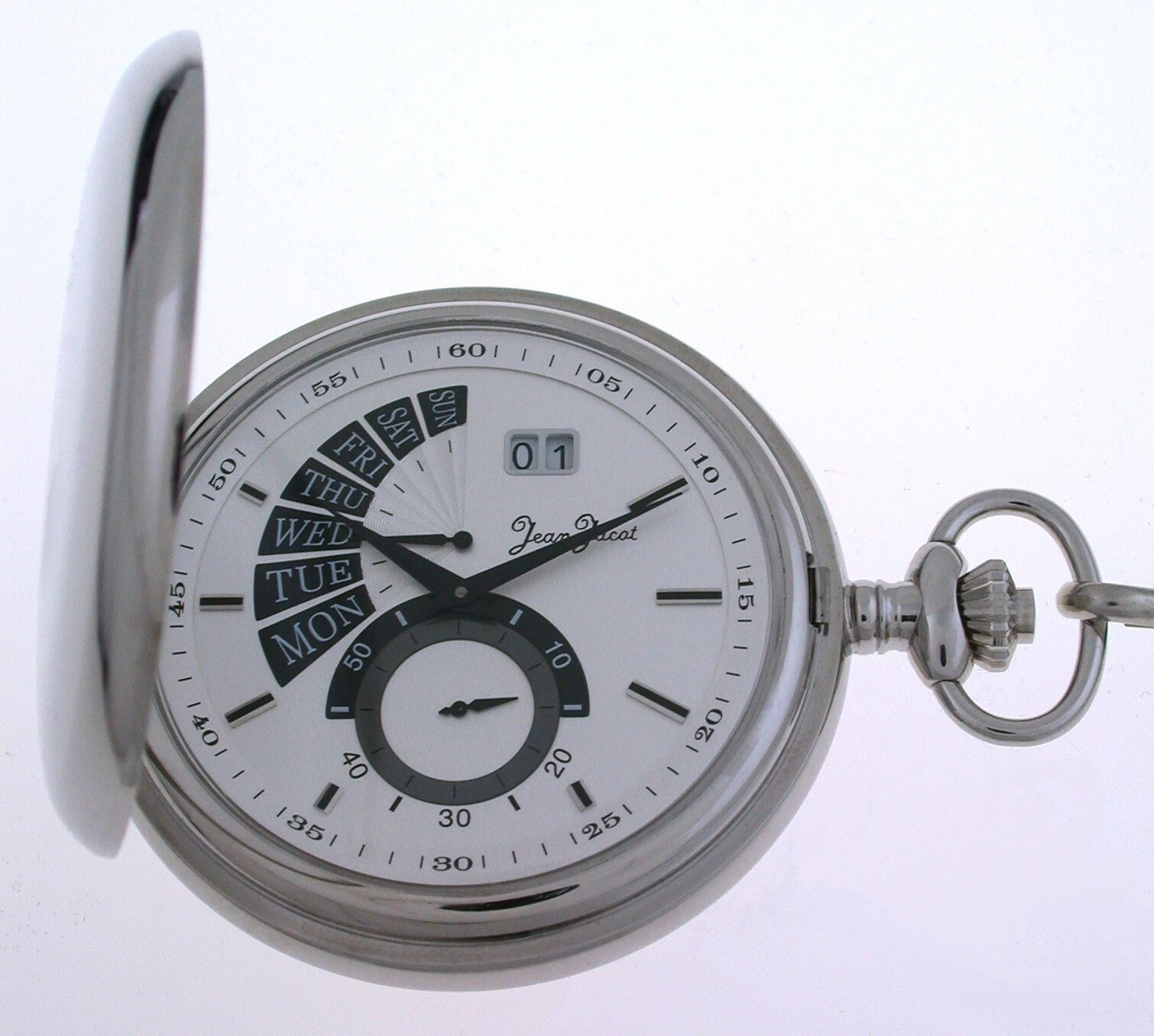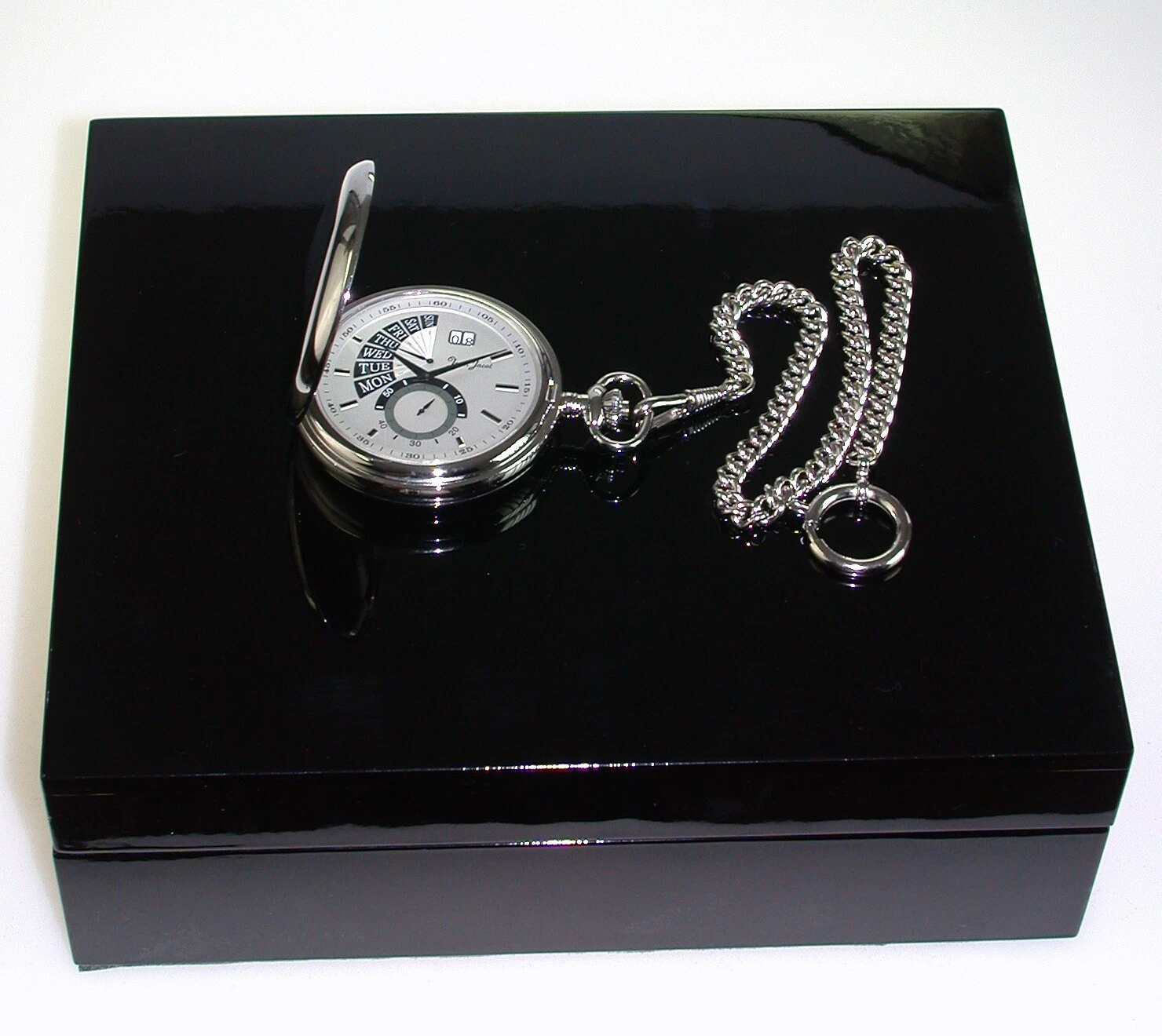 Rare Jean Jacot Swiss Movt. Quartz Pocket Watch + Wood Box + Chain