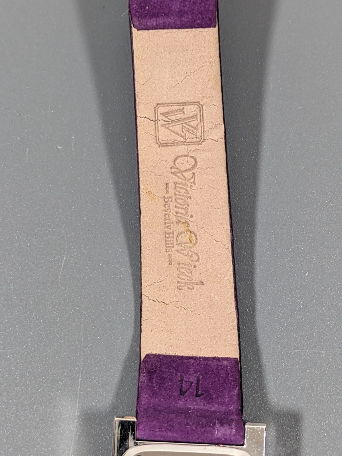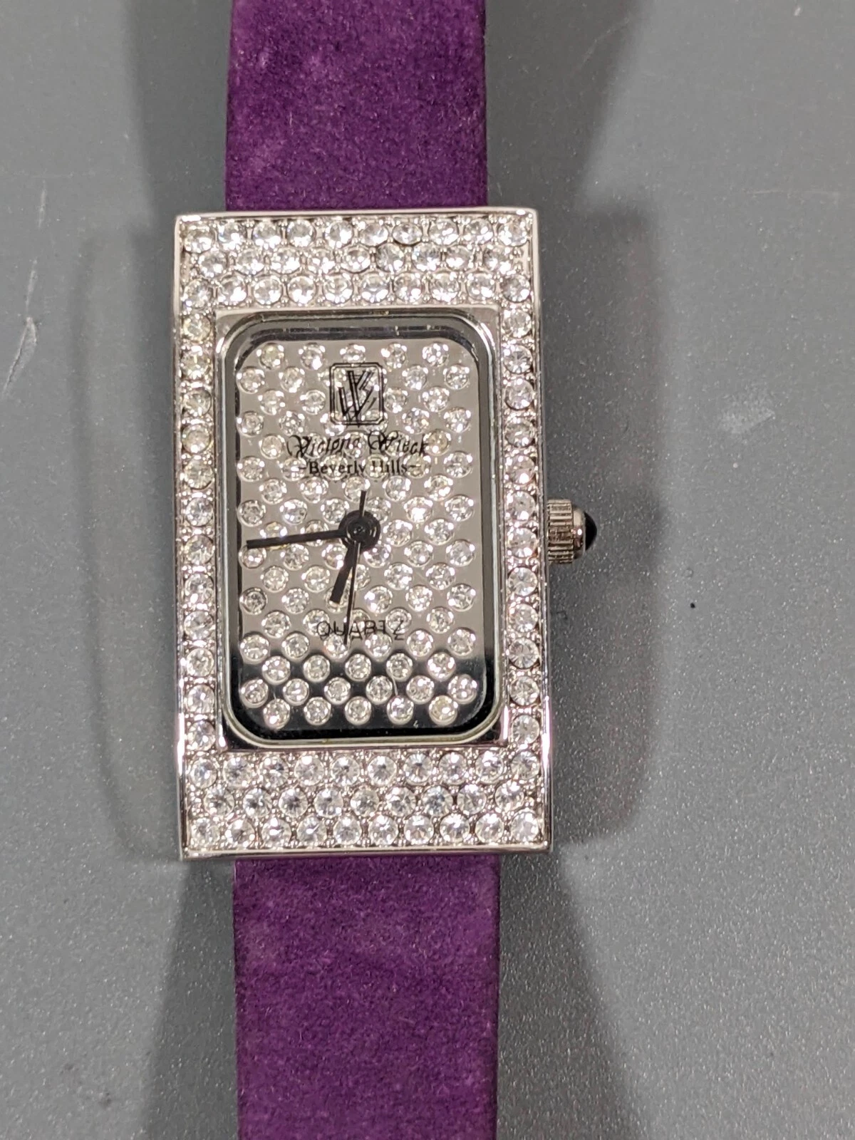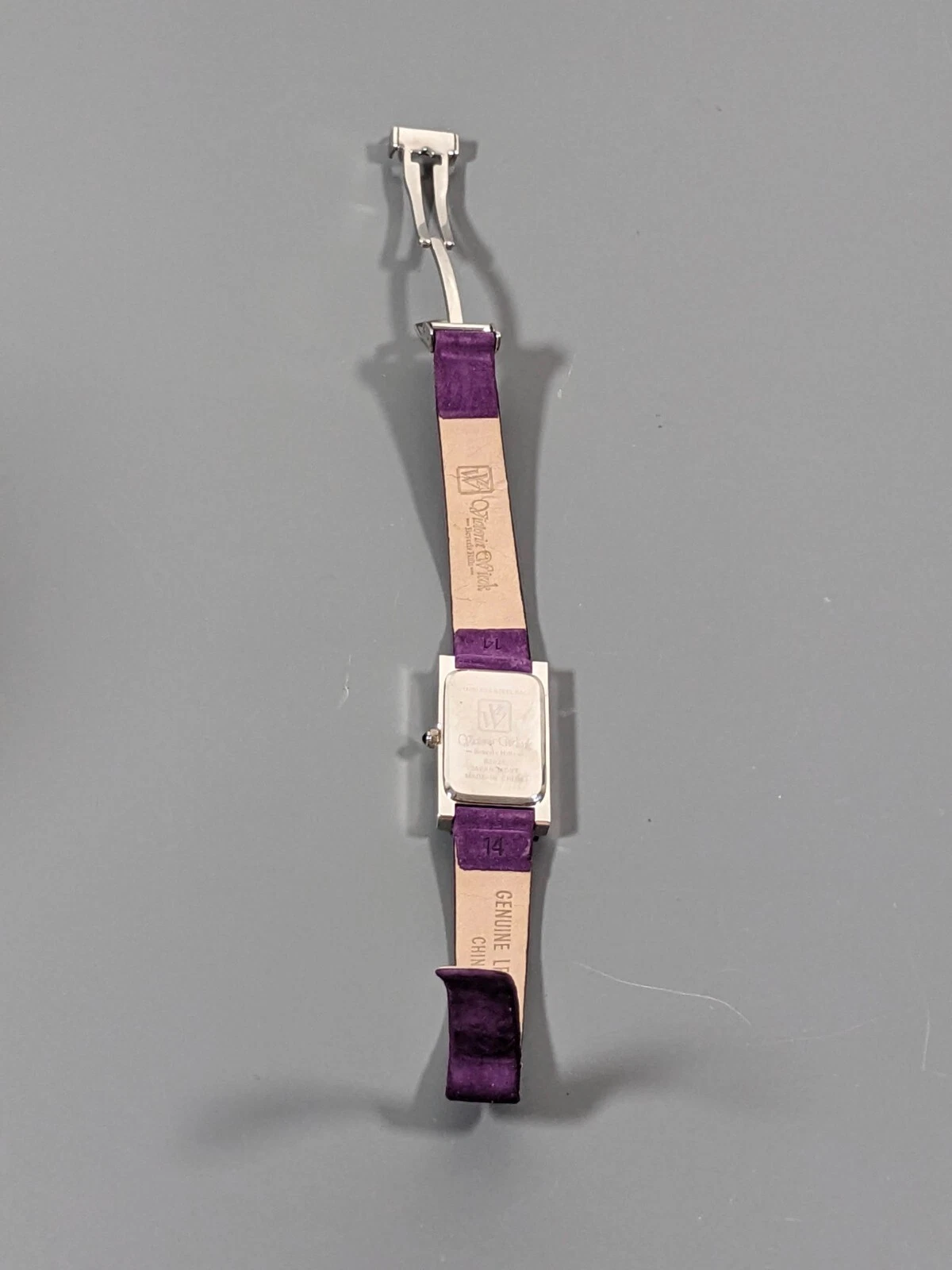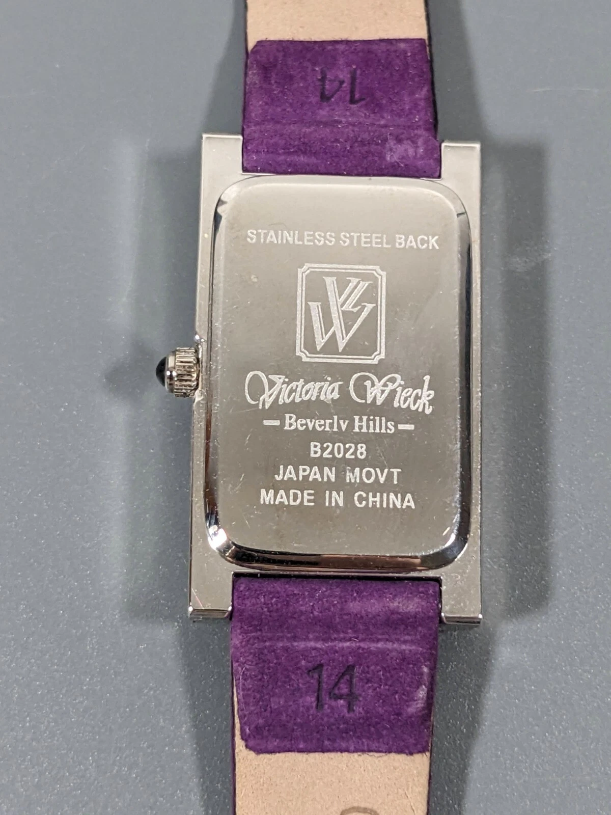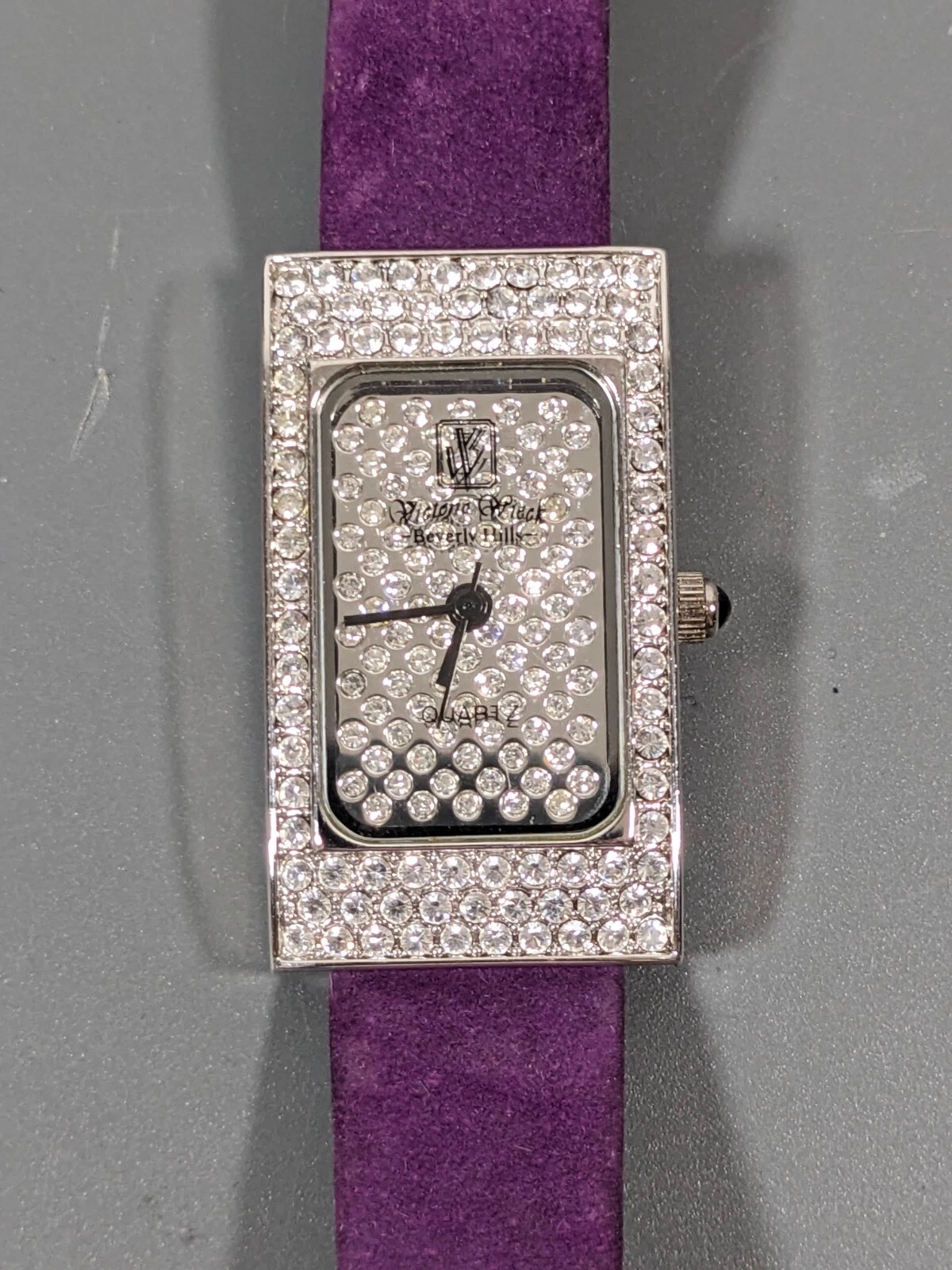 Victoria Wieck Crystal Pave Rectangle Case Purple Leather Band Watch Adjustable