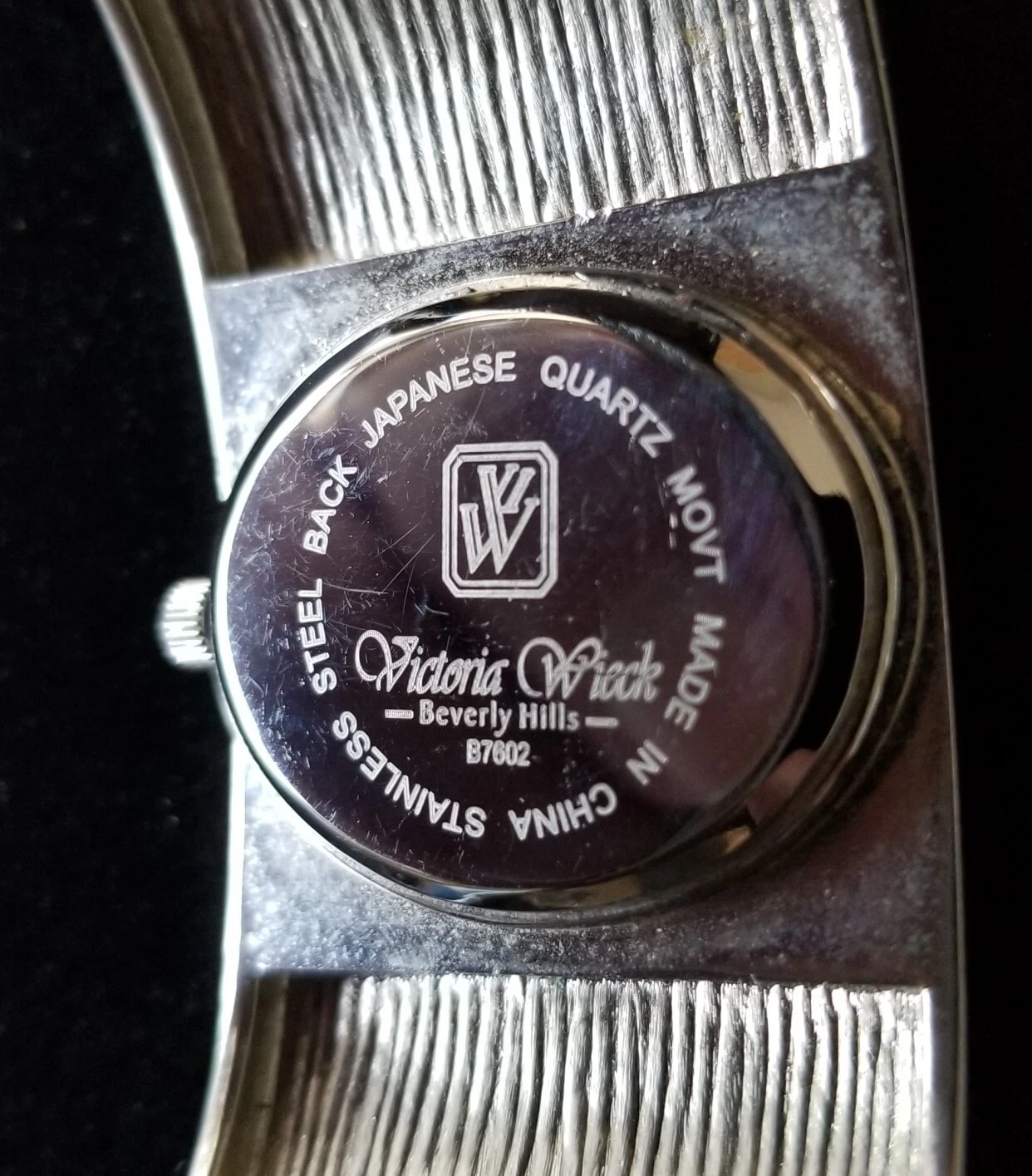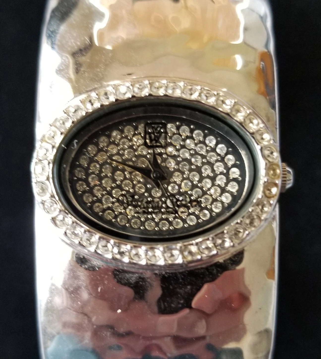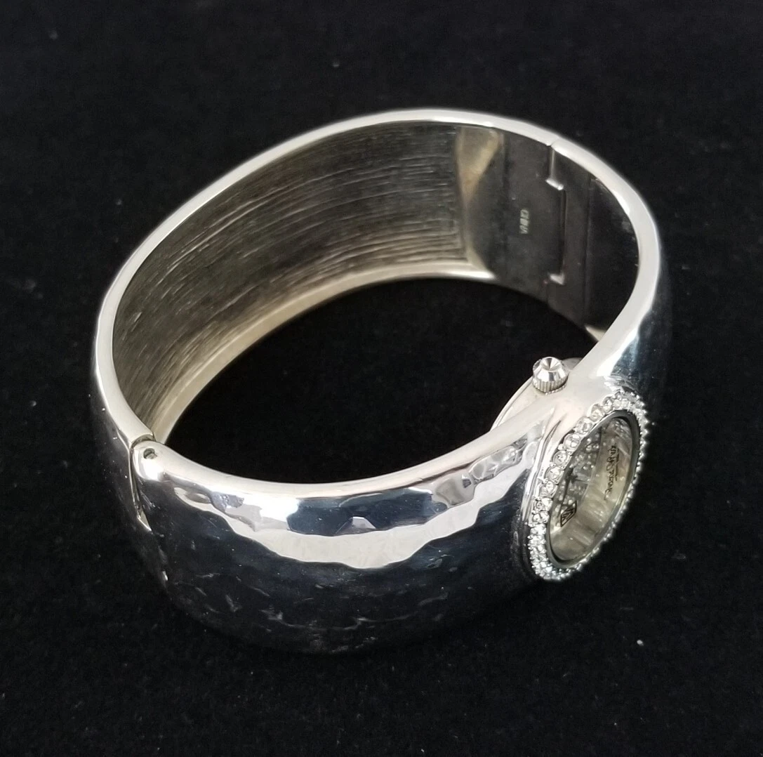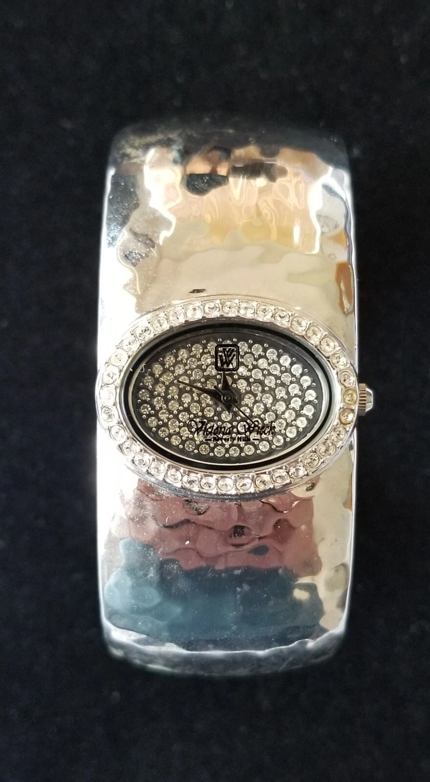 Victoria Wieck Silver Pave Dial Hammered Cuff Watch Crystal Bezel 7" New Battery