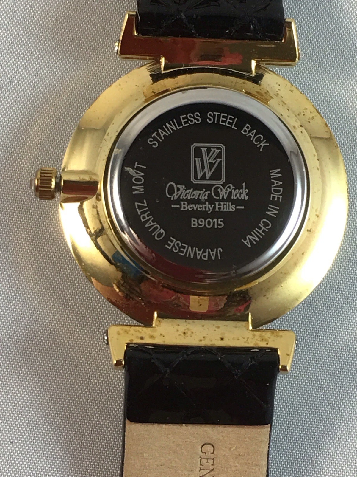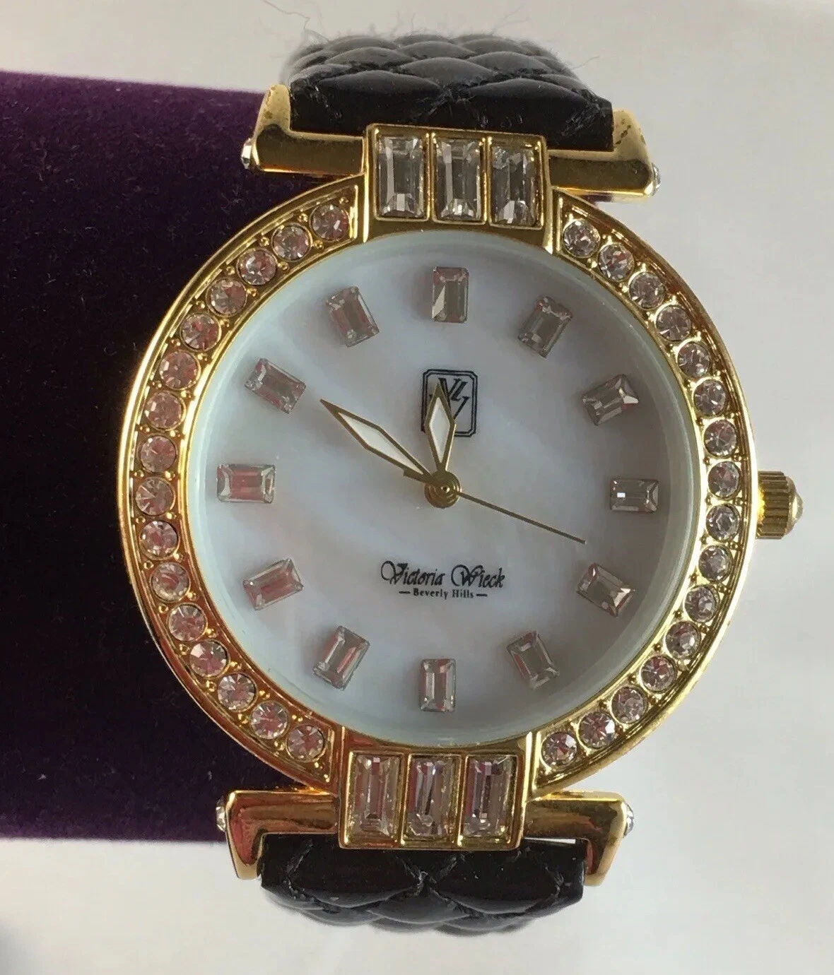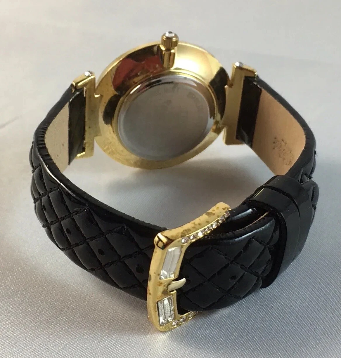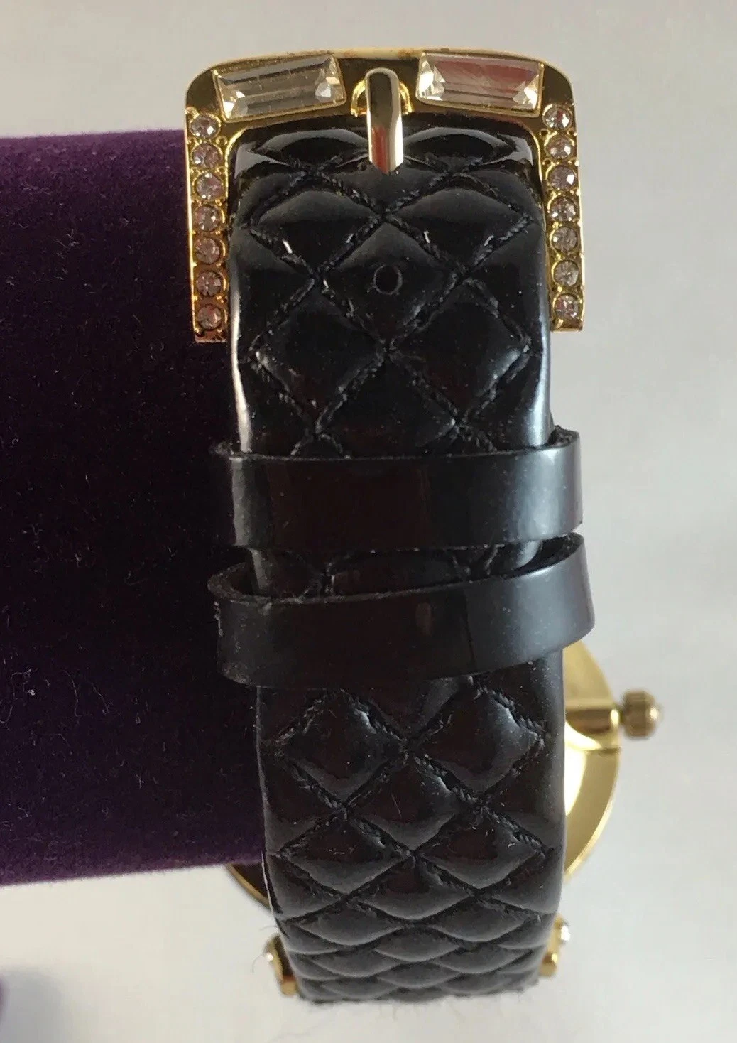 VICTORIA WIECK "QUILT PATENT" Round Goldtone Crystal Leather Strap Watch ~ Black