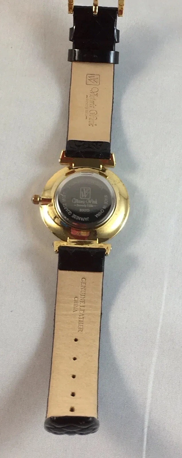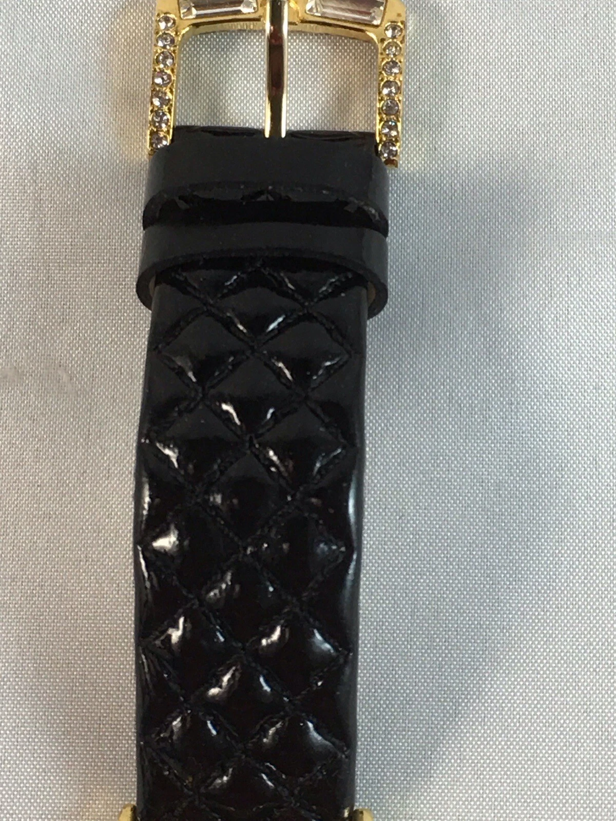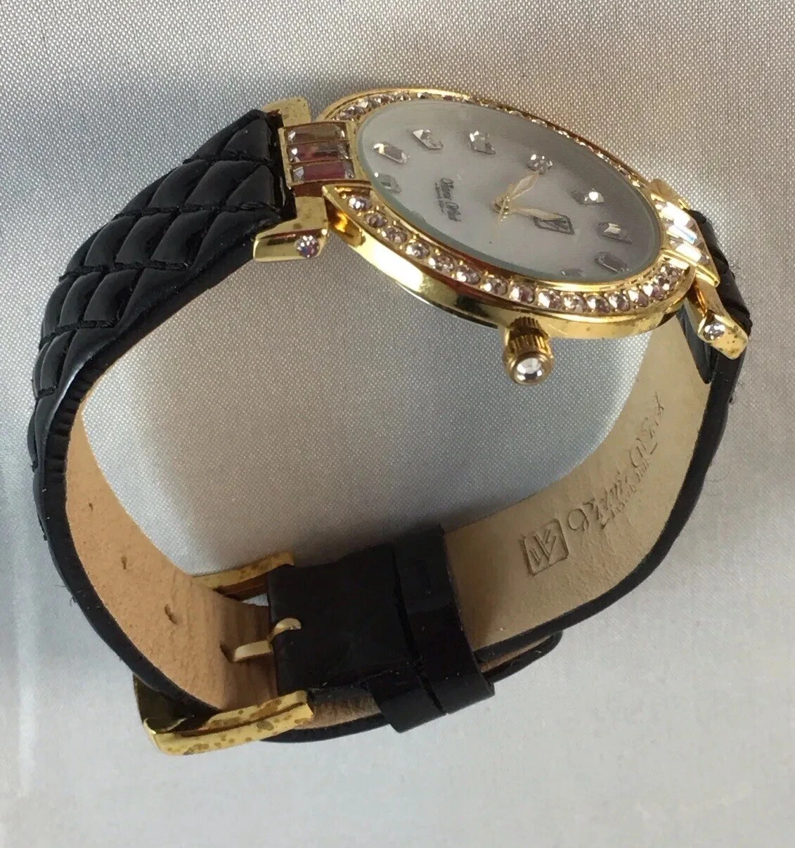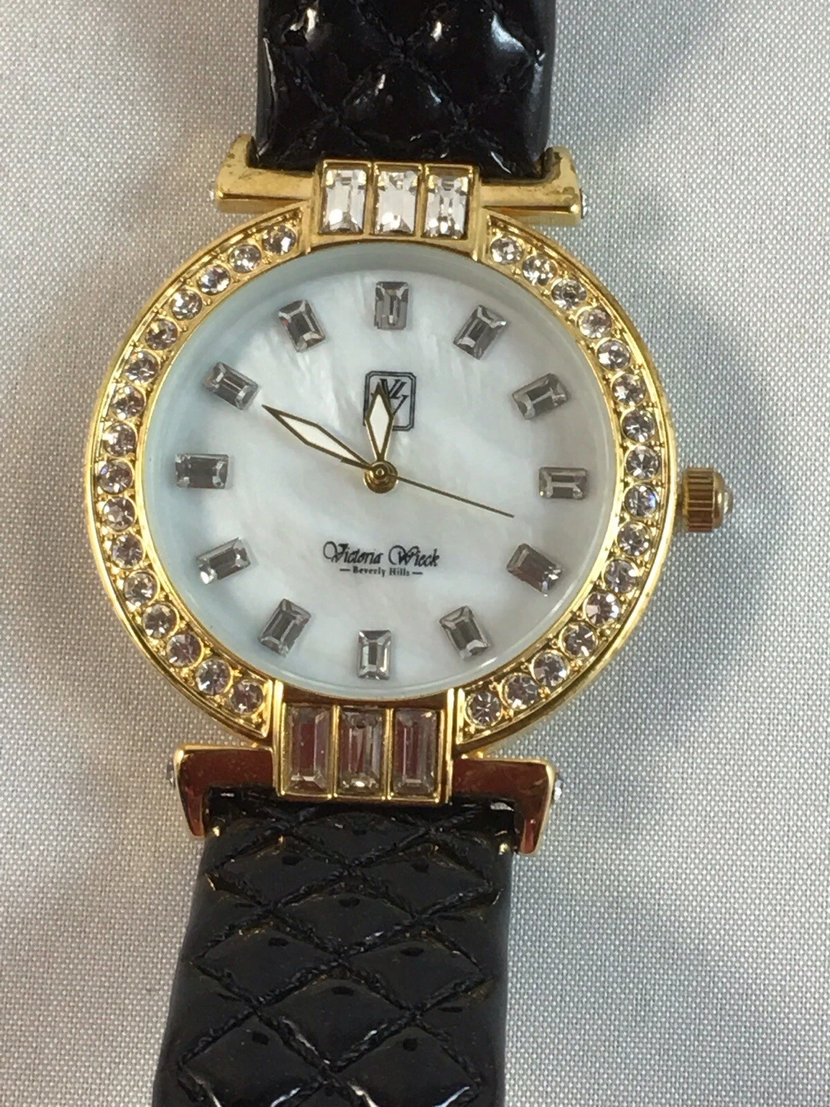 VICTORIA WIECK "QUILT PATENT" Round Goldtone Crystal Leather Strap Watch ~ Black