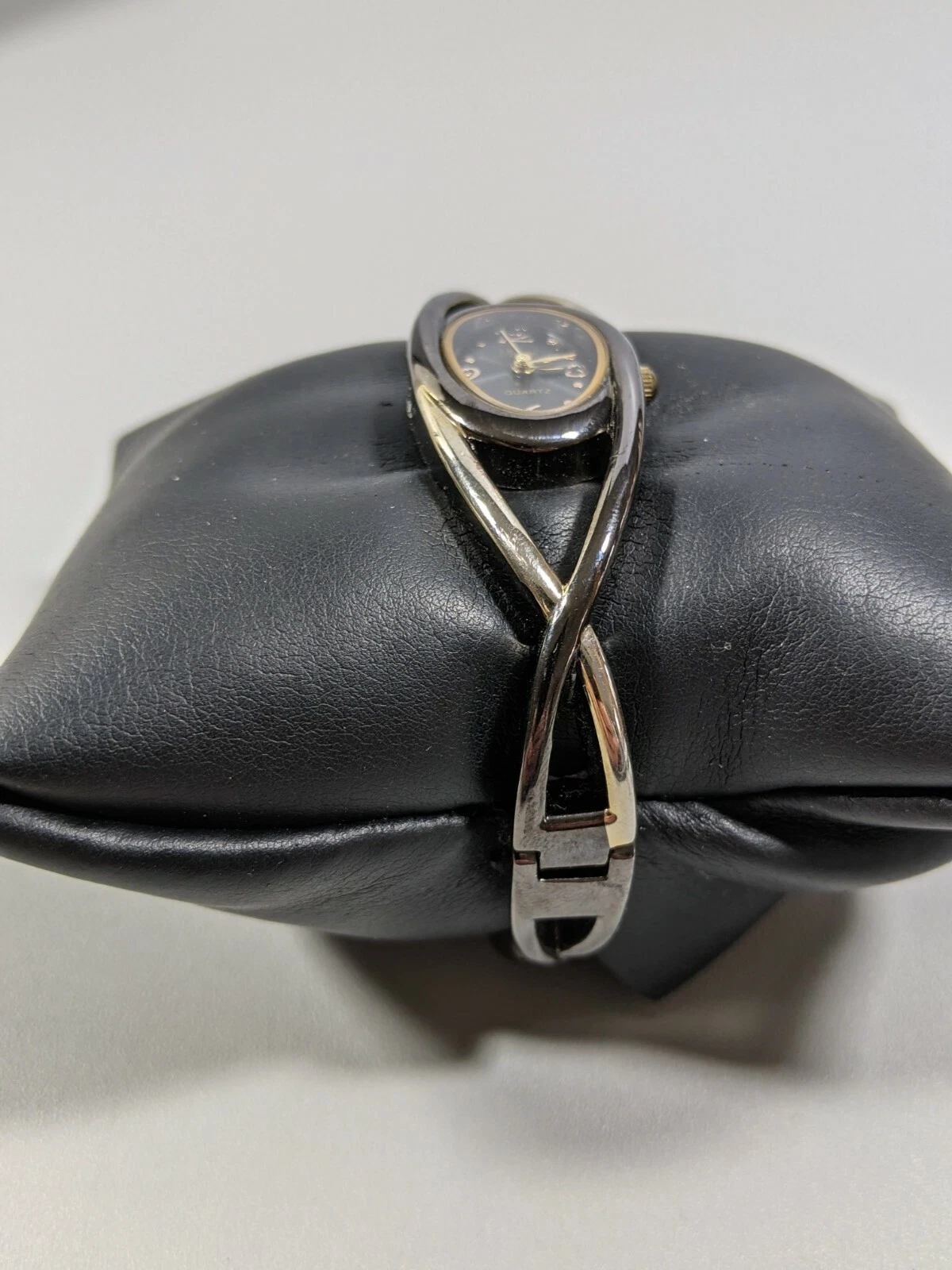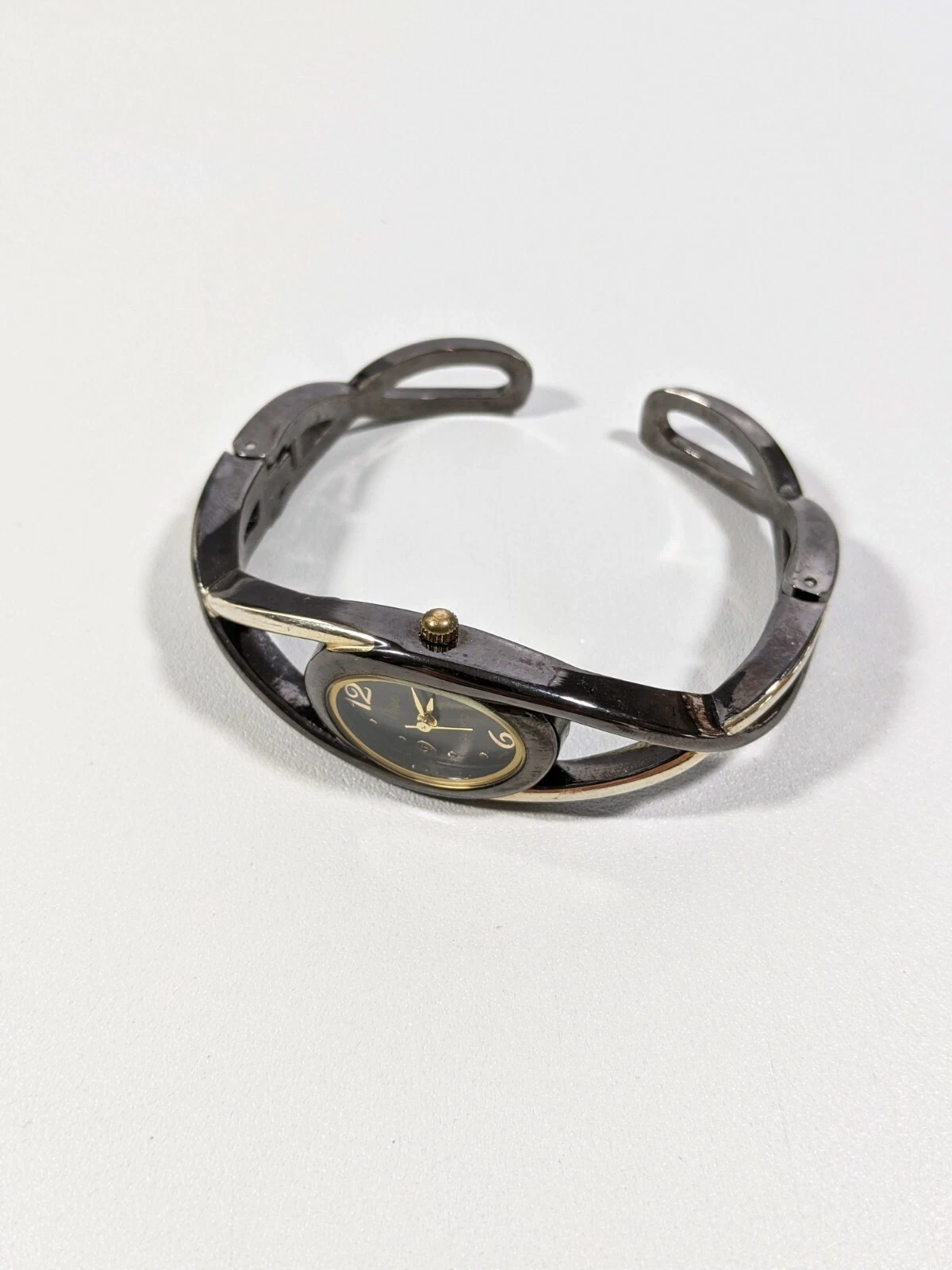 Vivani Black Gold Tone Open Cuff Cut Out Hinge Bracelet Band Watch 7 Inch