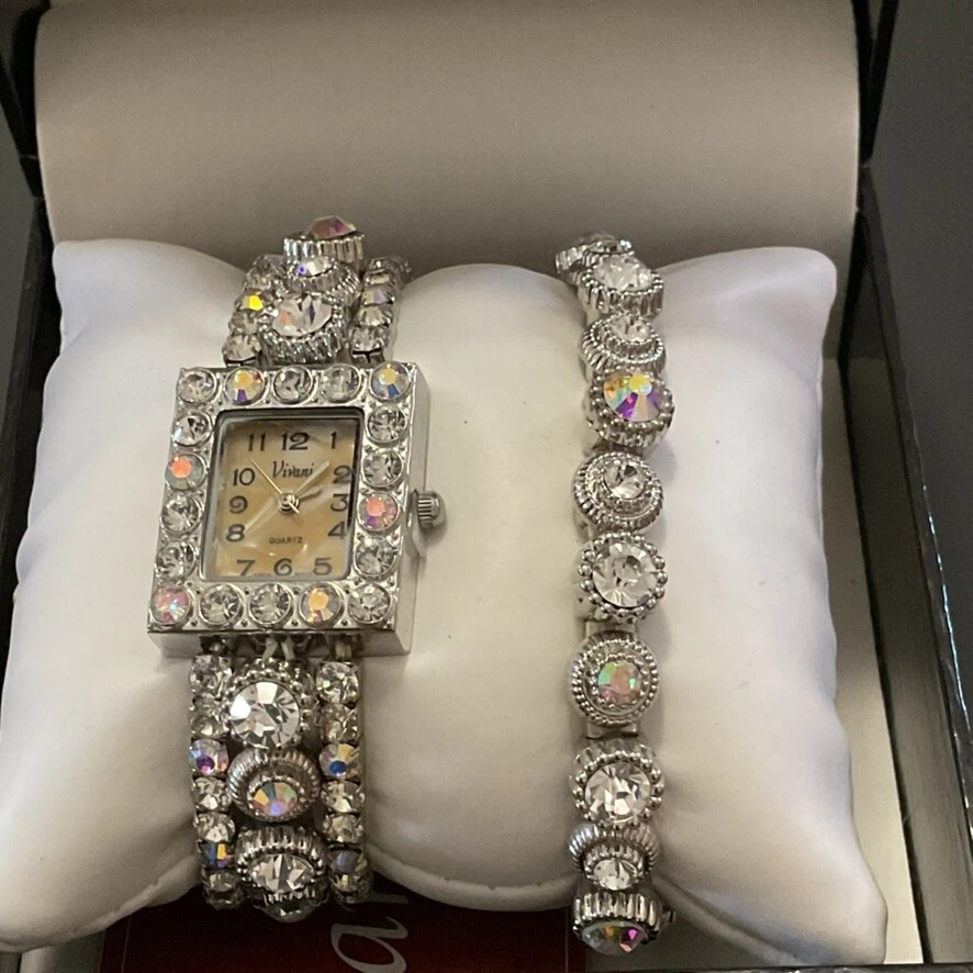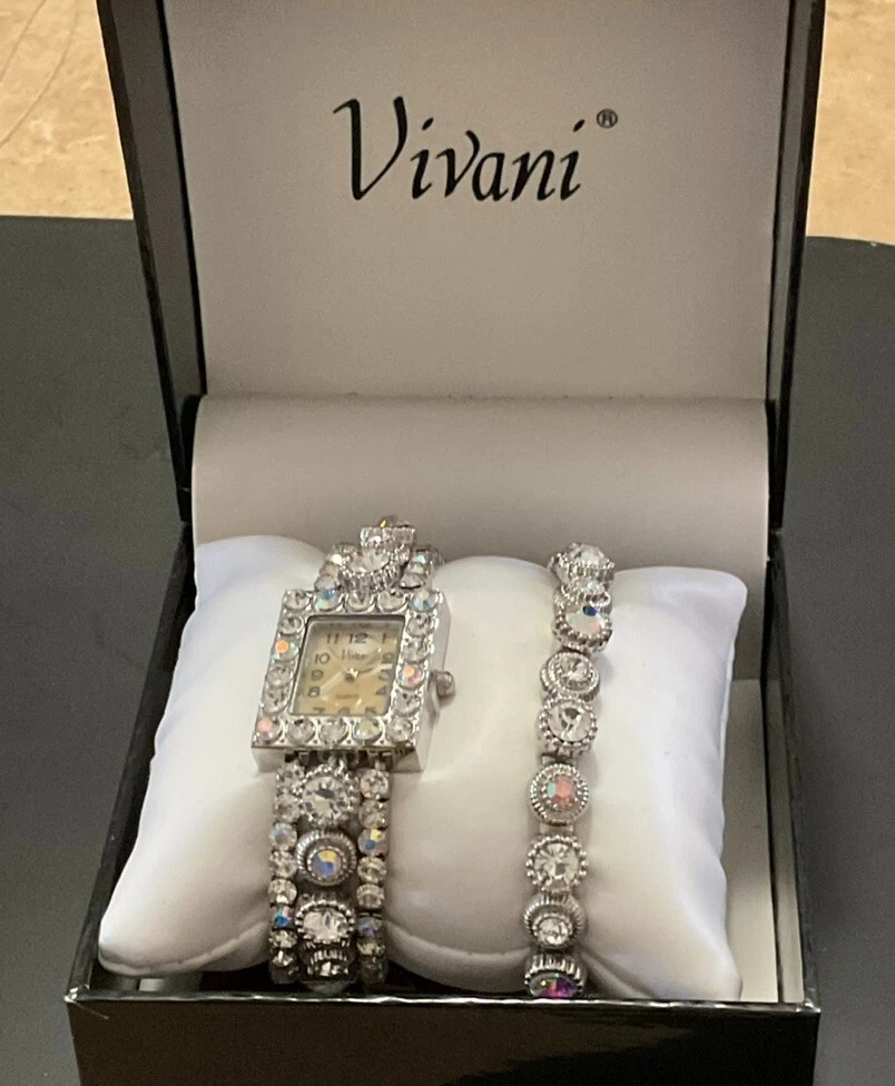 Ladies VIVANI Silver Tone Watch/Bracelet Rhinestone Glitz Set New in Box