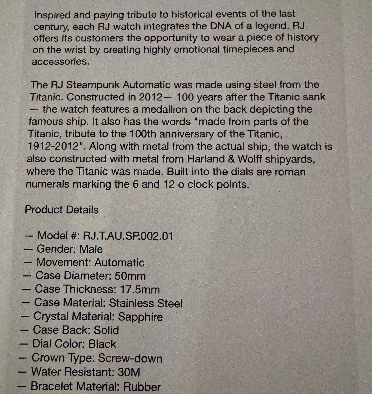 RJ Steampunk Automatic Made With Steel From The Titanic RJTAUSP.002.01