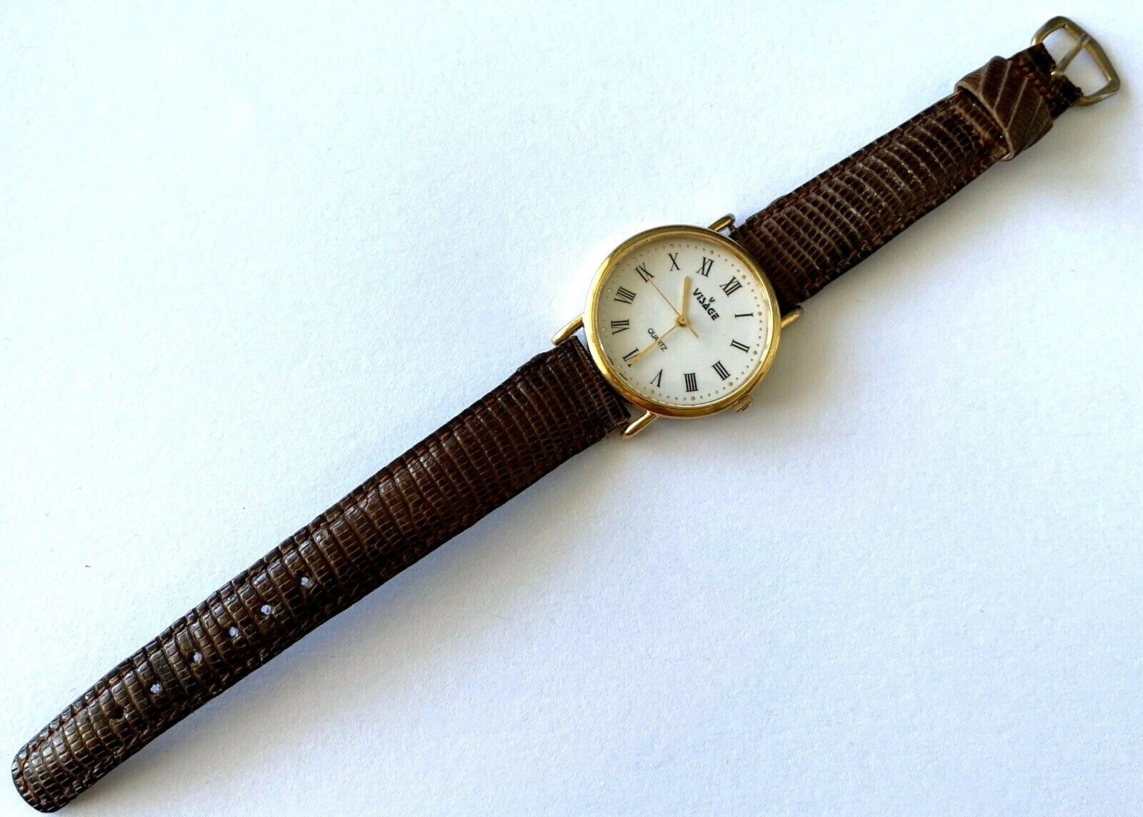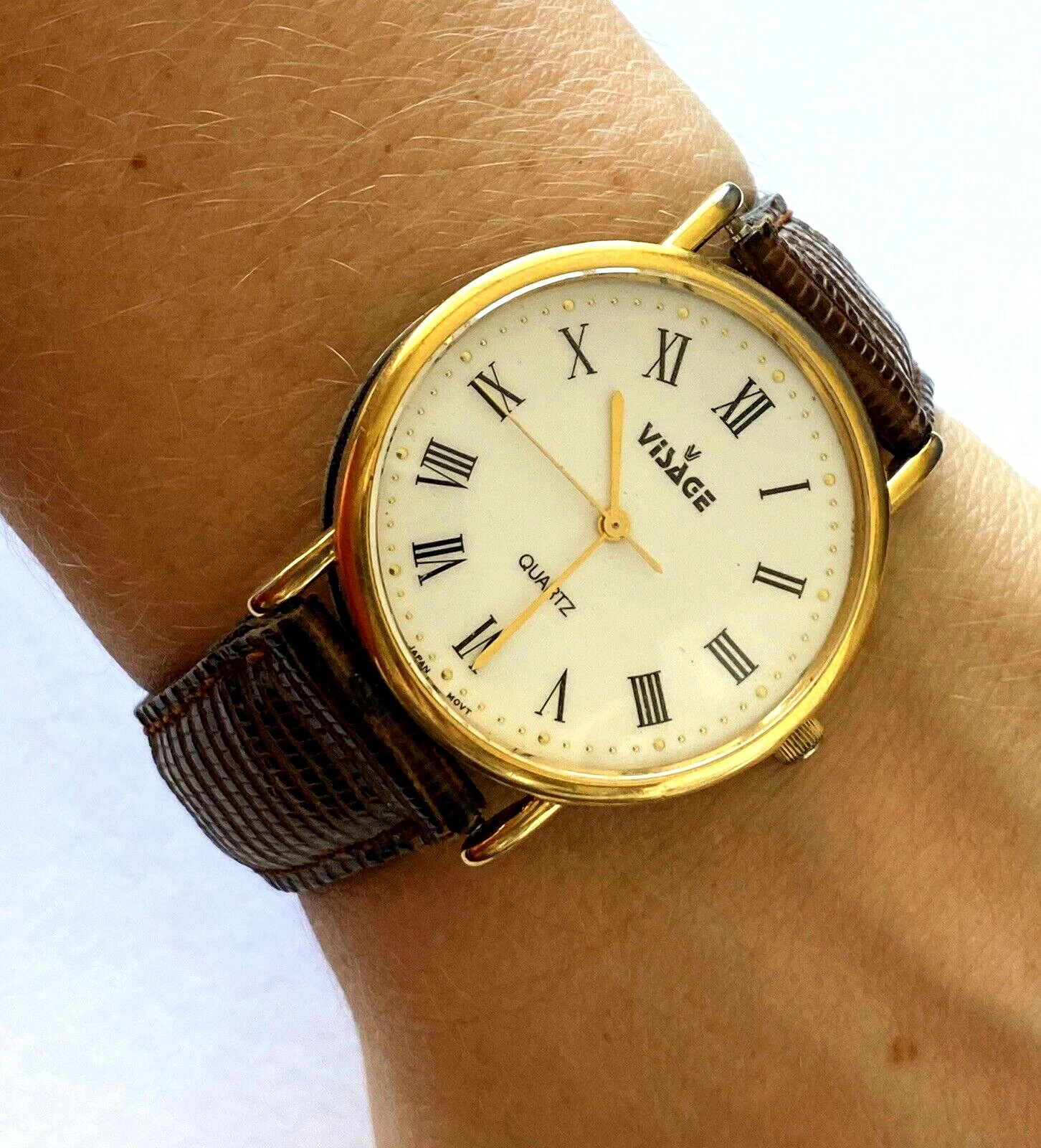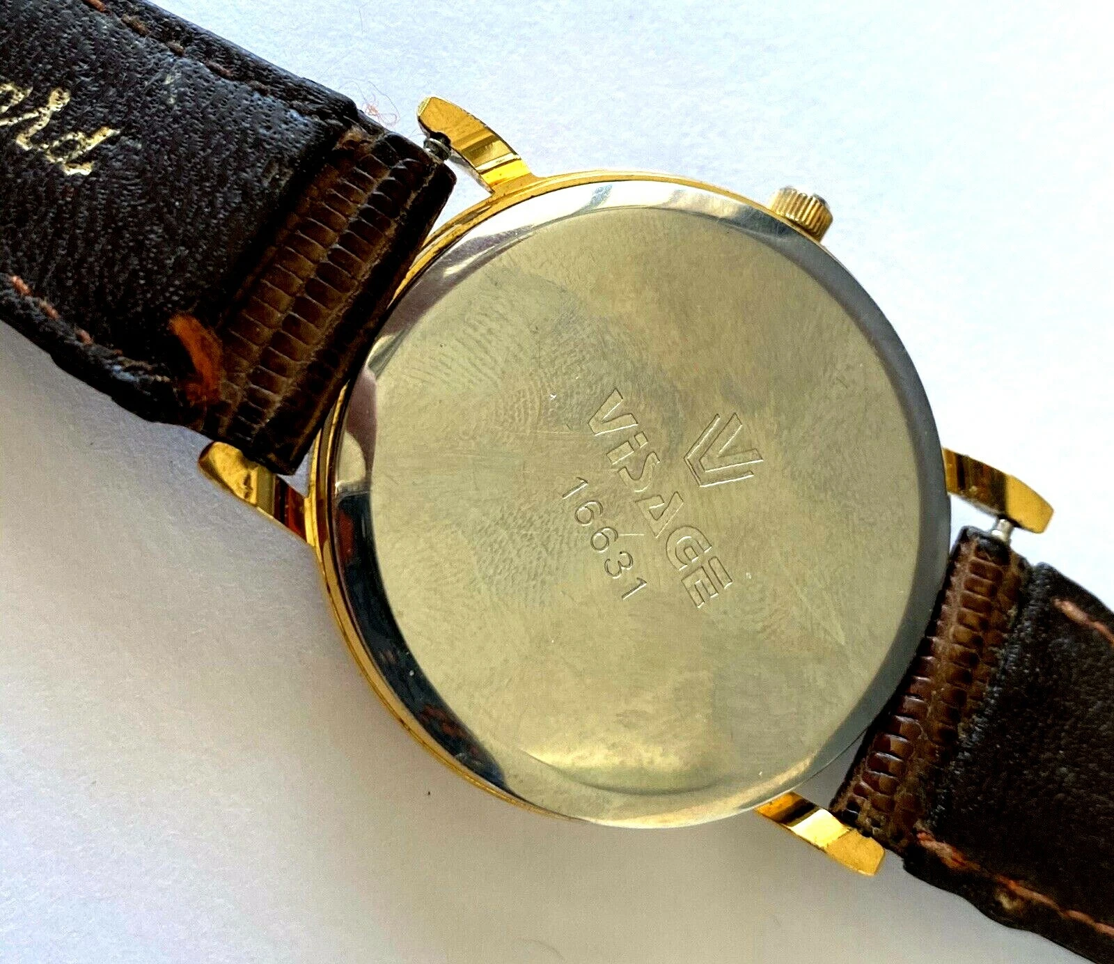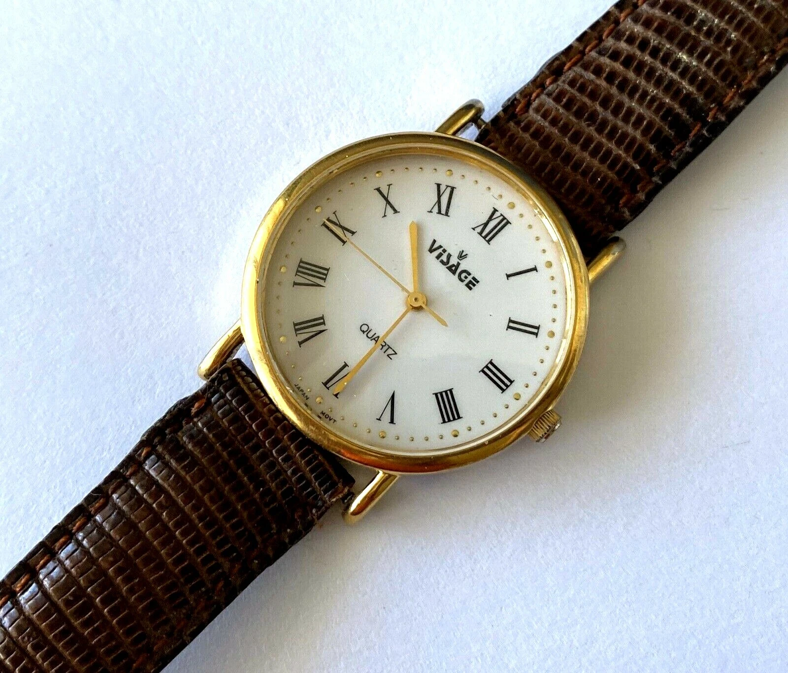 Visage 16631 Quartz White Dial Gold Tone Case Brown Band Men's Wrist Watch Runs
