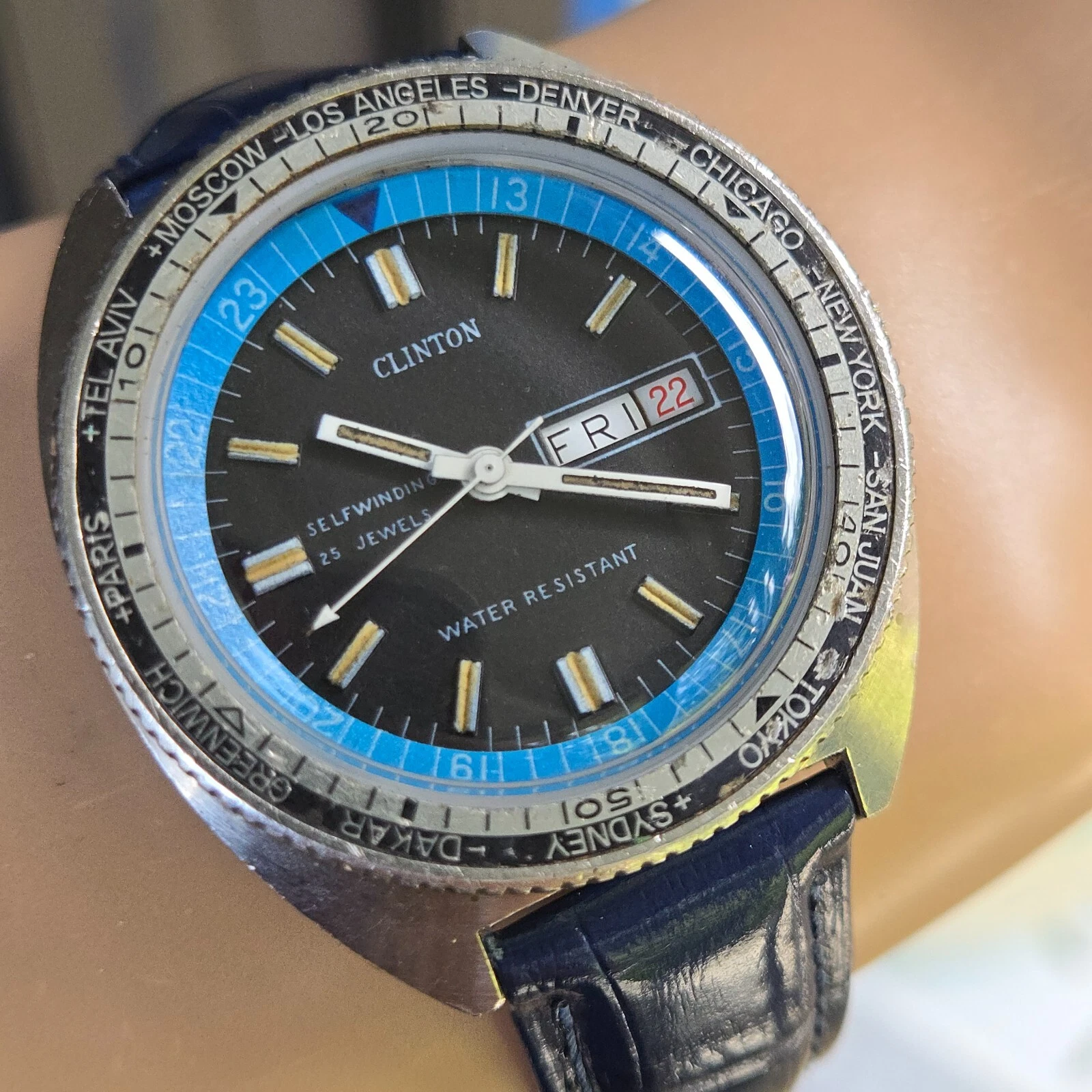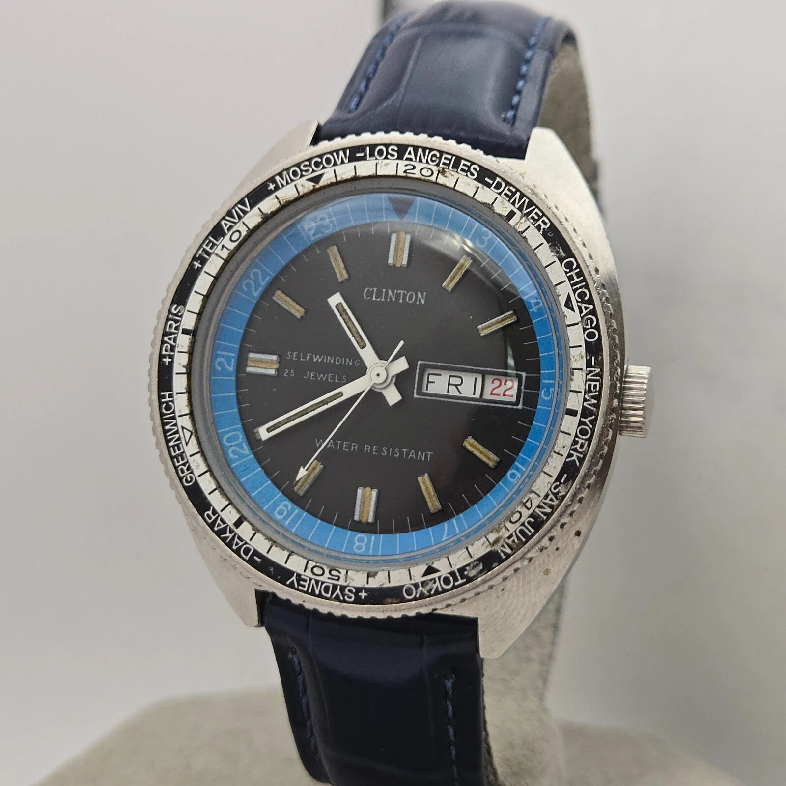 Vintage CLINTON men's automatic watch World time Ronda 1239 25Jewels swiss 1970s
