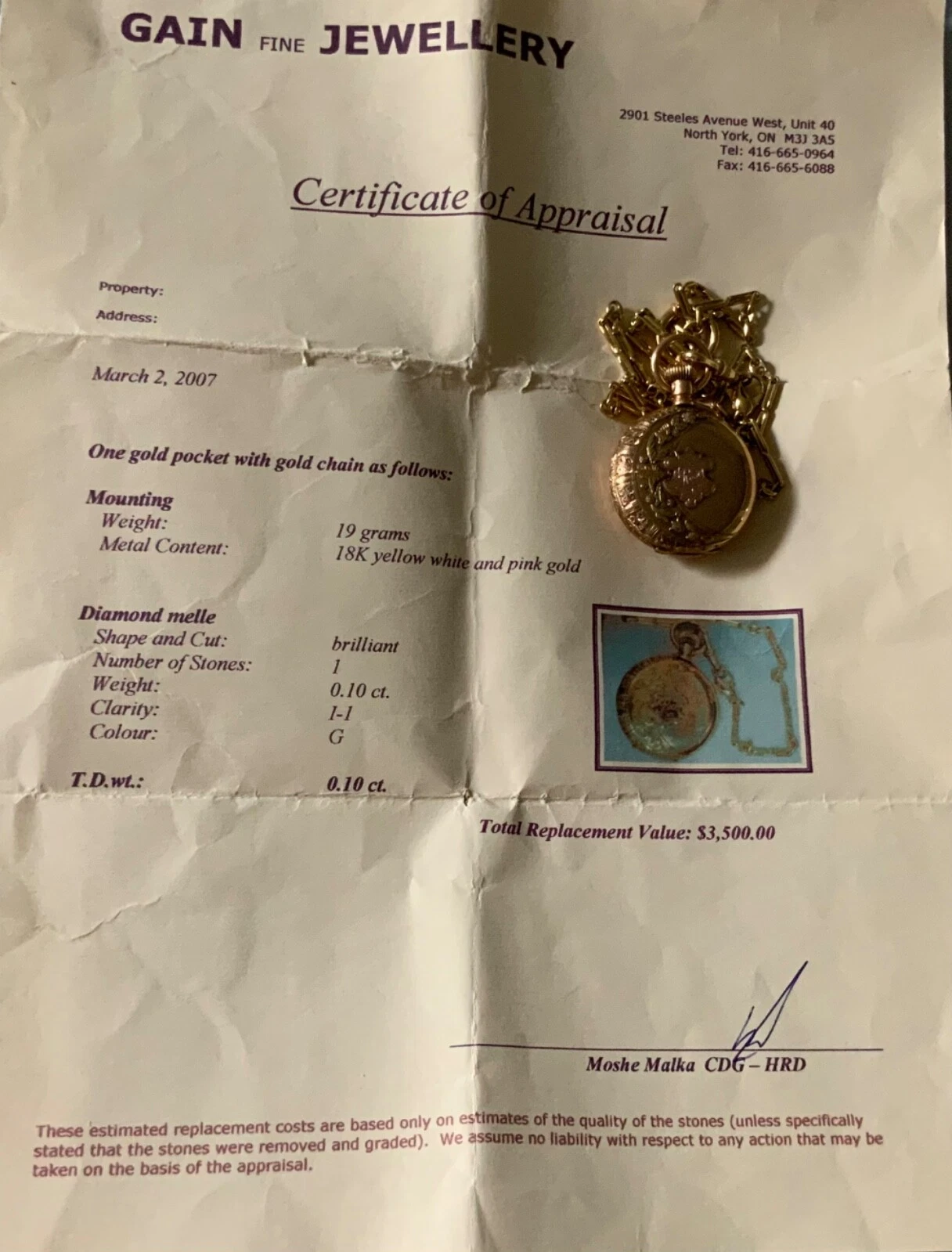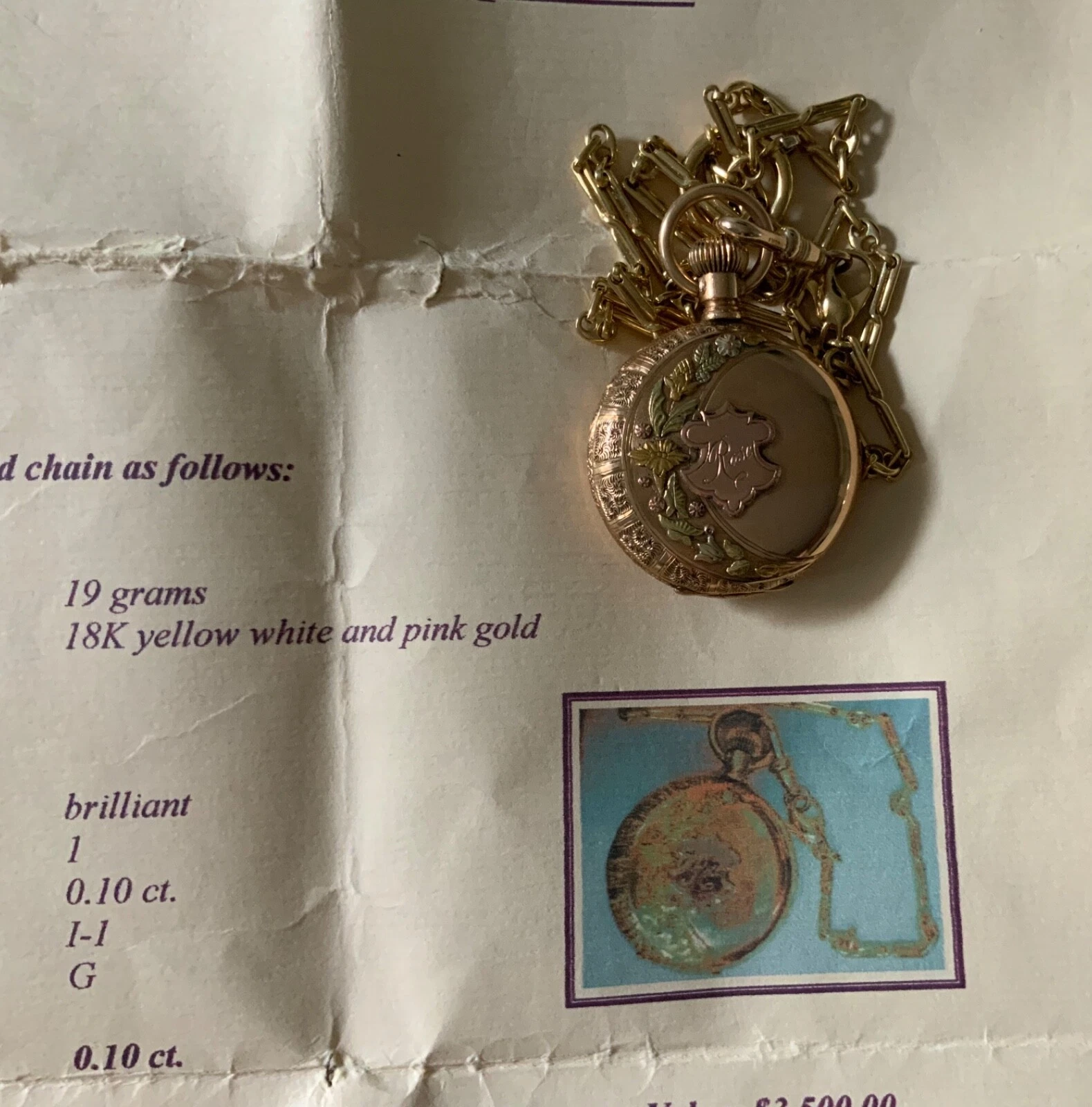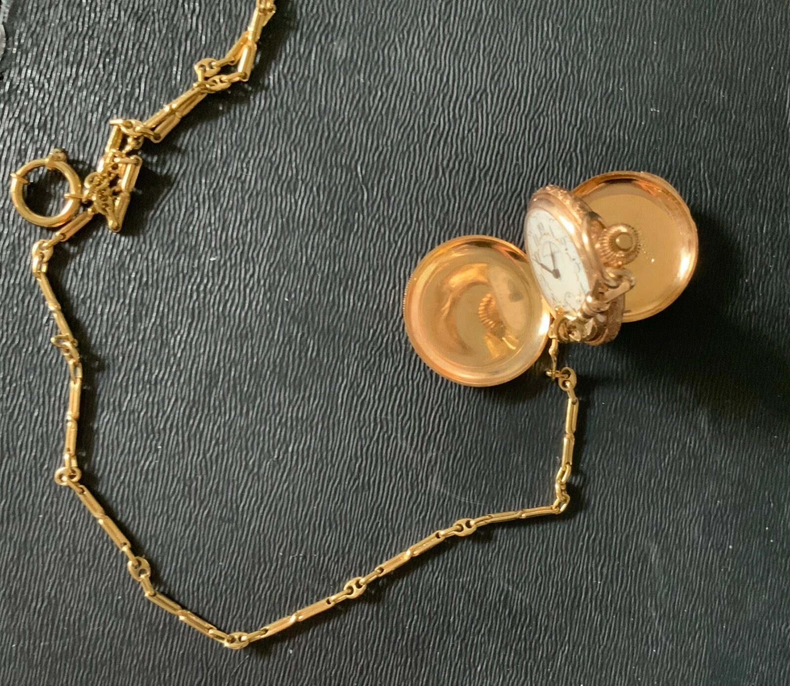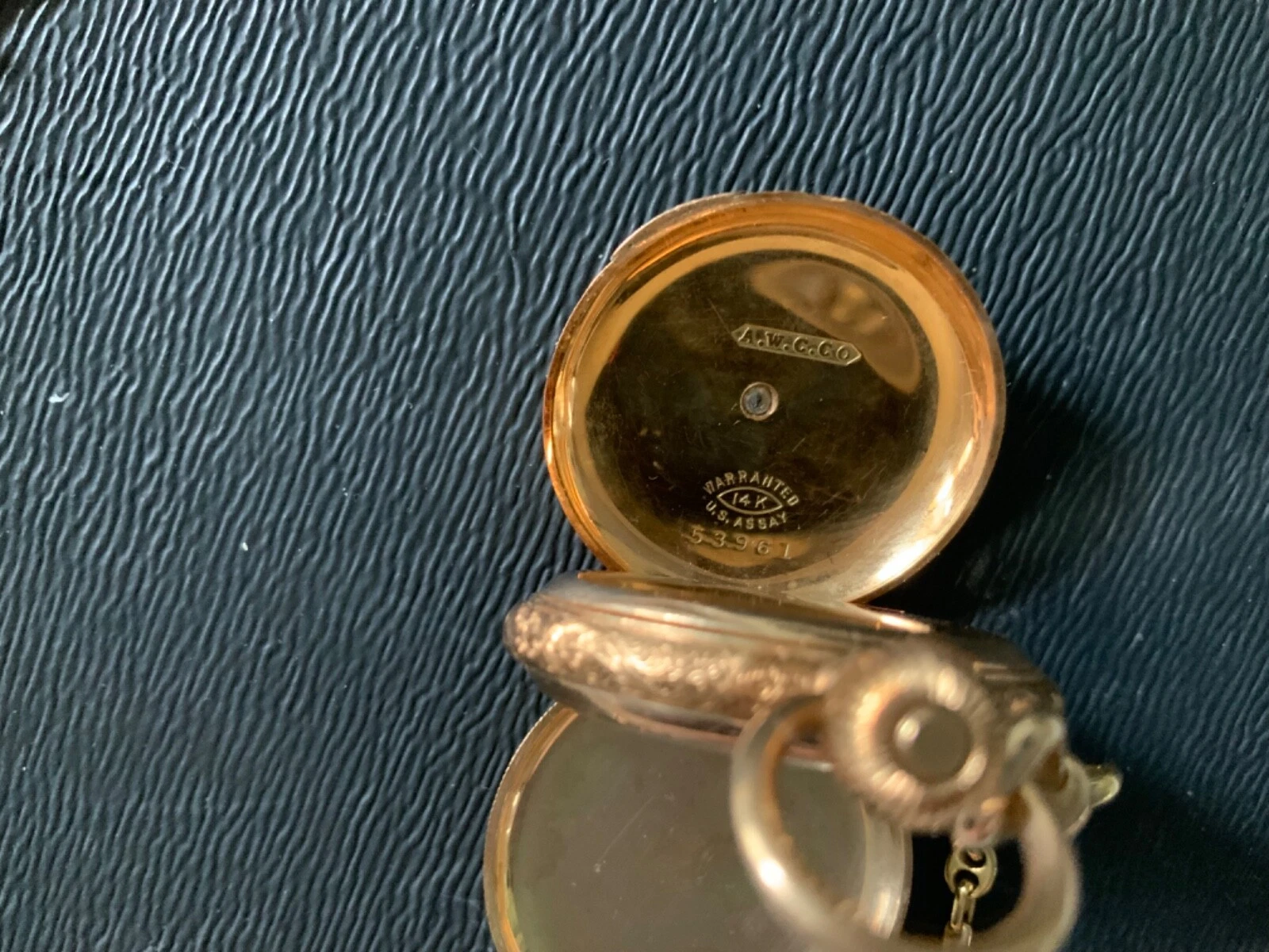 14k solid gold a.w.w.co. POCKET WATCH with Diamond on case and 18K Gold Chain.
